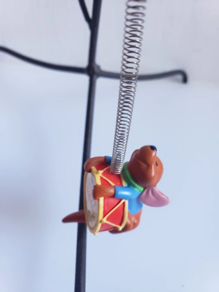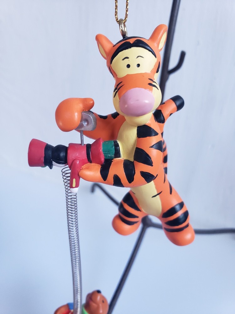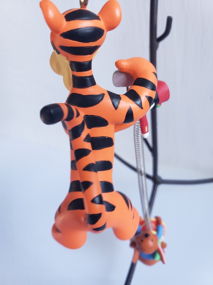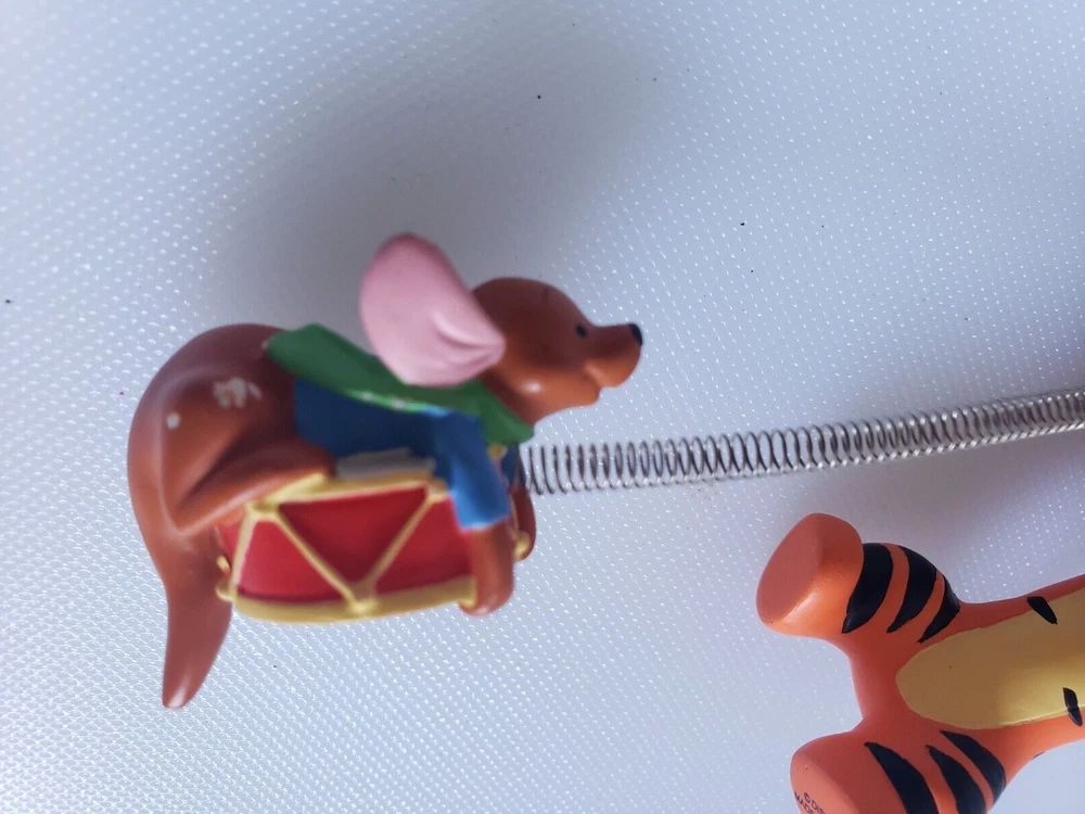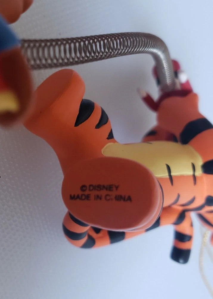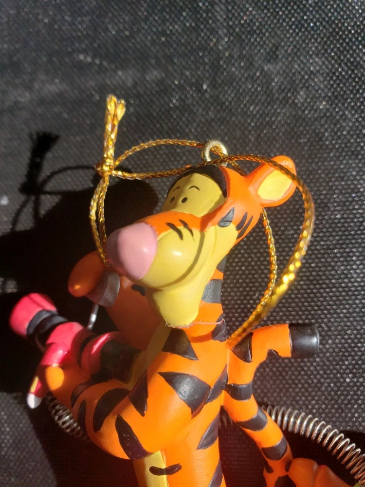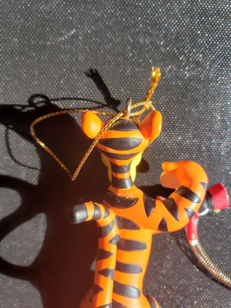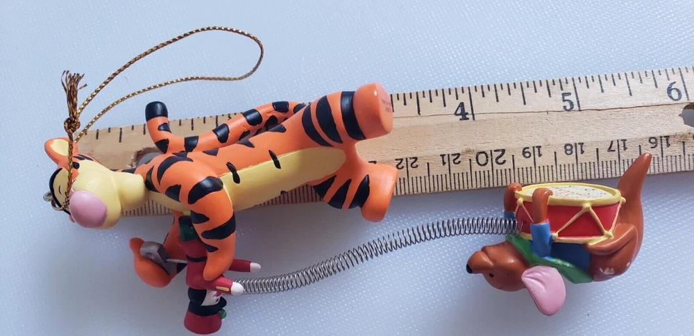 This vintage Disney Tigger ornament is a must-have for any collector or fan of the beloved character. Made of durable resin and featuring a wind-up toy design, this ornament is perfect for adding a touch of whimsy to your holiday decor. The happy holidays drum adds a festive touch to the piece, making it a great addition to any Disneyana collection. The ornament is made in China and features the iconic Tigger character from the Disney franchise. The head has been repaired as seen in the photos. Pet free smoke free home.