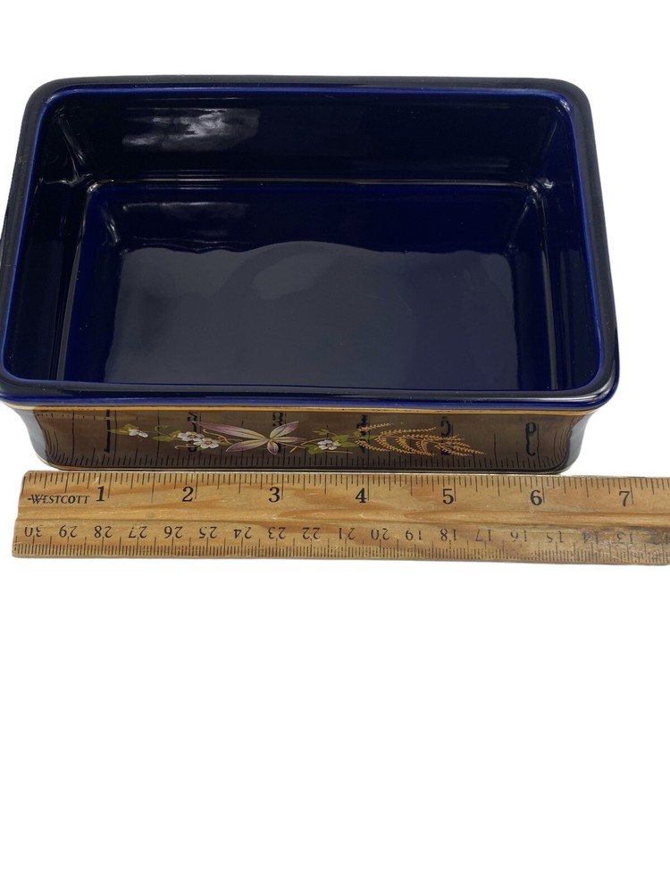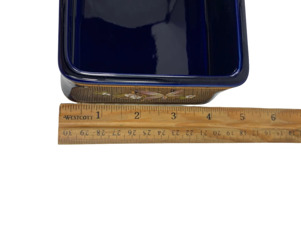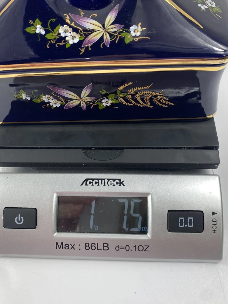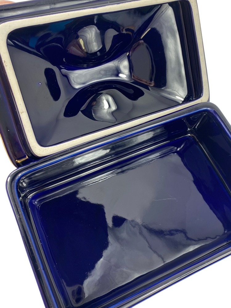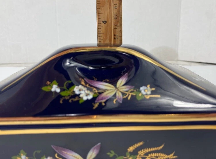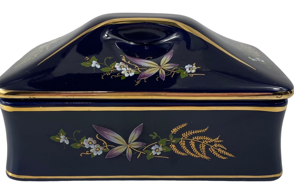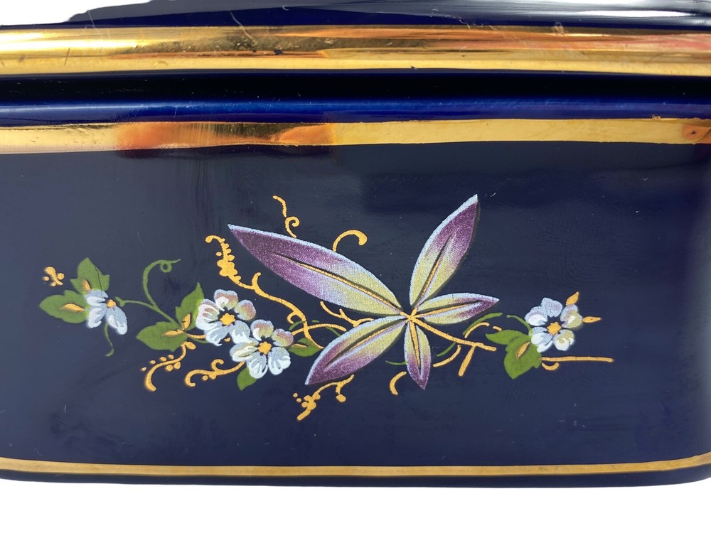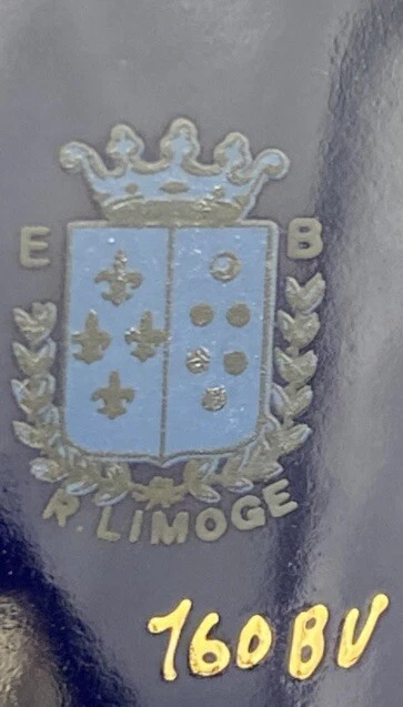 Beautiful porcelain box imported from Europe between 1930-1970. That is how long KB Original Creations was in business. Although this box does not have its KB sticker , other pieces that match this exactly do. There’s no way for me to date this but seeing its condition I would dare to say it was one of its later imports. They only dealt in high end glass in a few European countries. Bavaria , Italy , France , England. The box is in mint condition, no chips , cracks , or breaks. The floral motif is transferware. It is signed EB R. Limoge. Not to be confused with Limoges. I researched this item extensively, including antique forums , and the consensus was it is a beautiful colbalt dresser box with unknown origins but most likely imported from France during the time period mentioned.