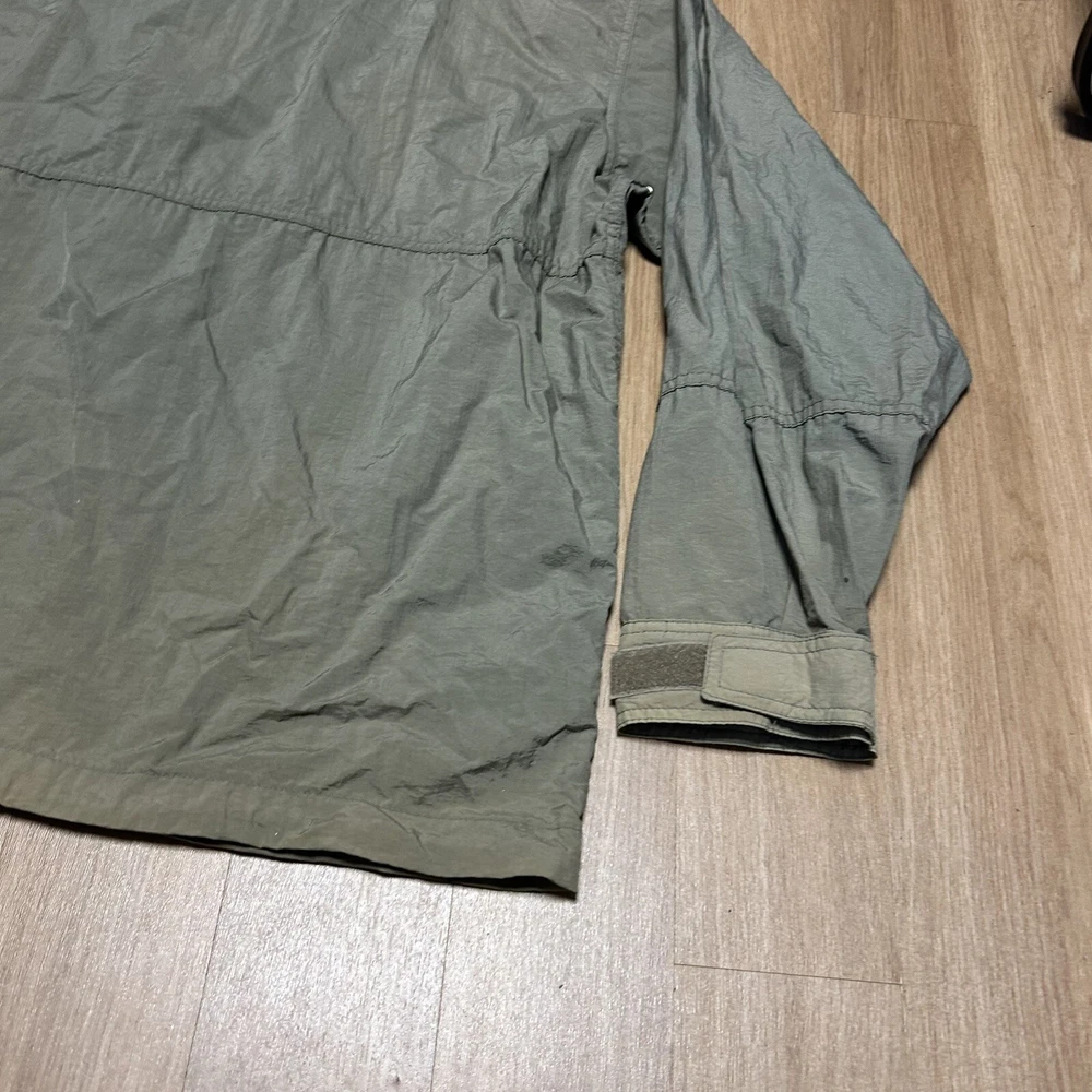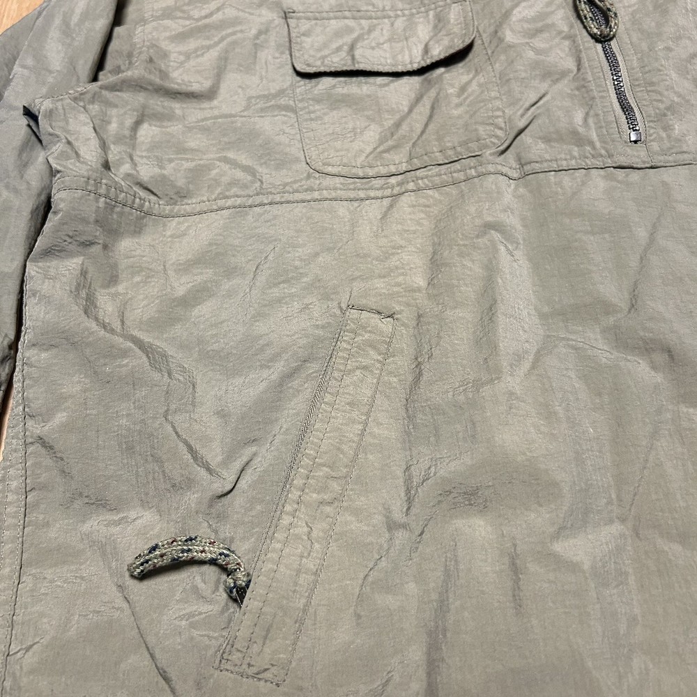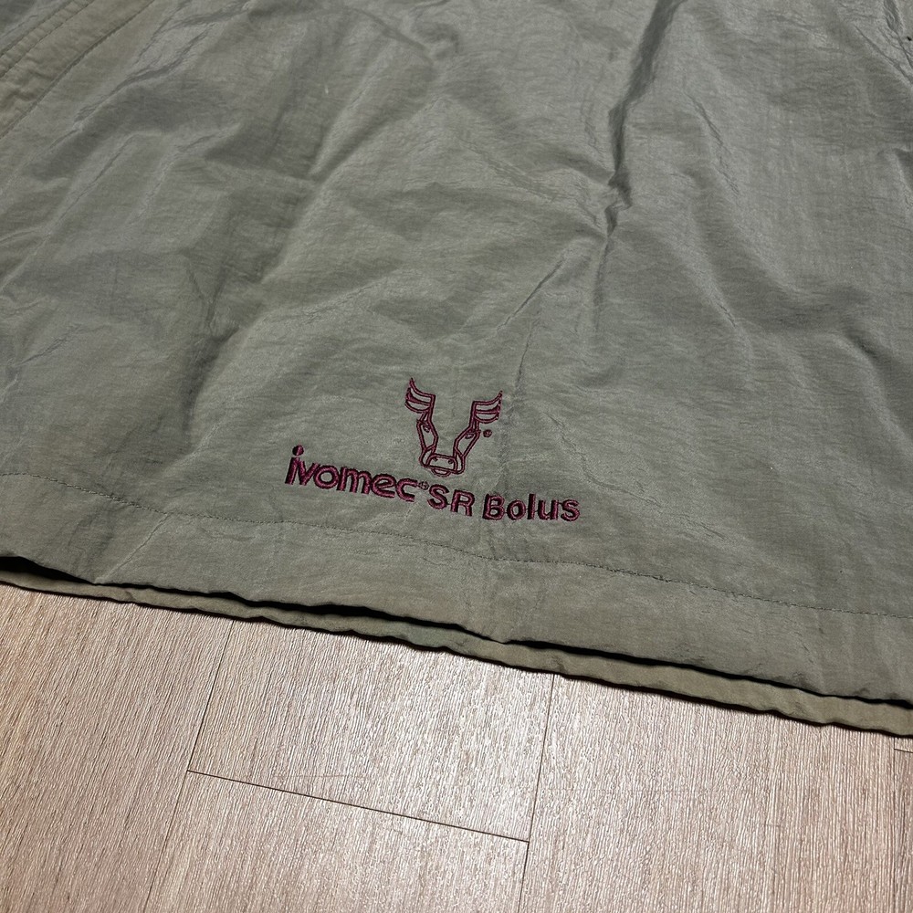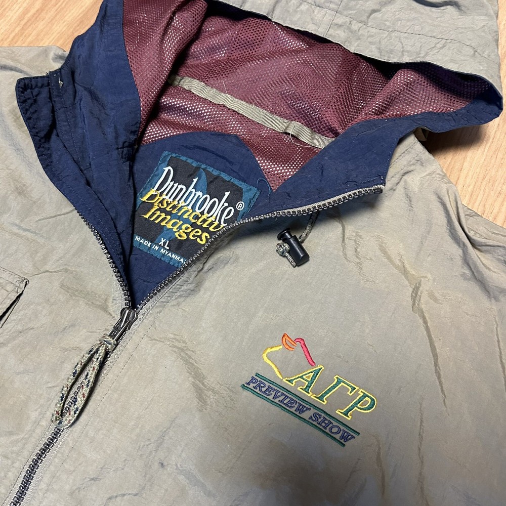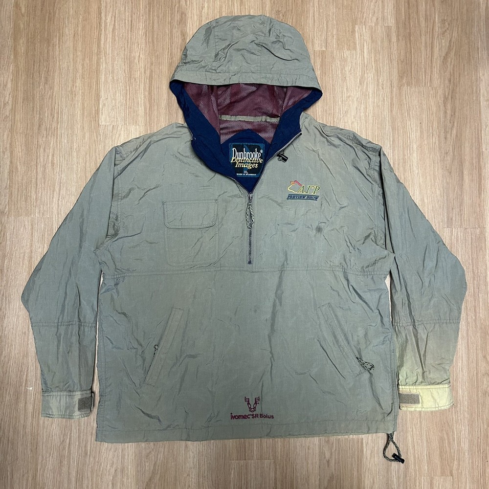 This vintage Dunbrooke windbreaker is the perfect addition to any wardrobe. With a tan outer shell made of nylon and canvas, this jacket features a stand-up collar, hood, full zip closure, and button accents. Perfect for any occasion, whether it be travel, casual wear, or workwear, this jacket is a must-have. This mid-length jacket is insulated with polyester and features a nylon lining, making it suitable for all seasons. The embroidered cattle accent adds a touch of Southwestern charm, while the solid pattern and beige color make it a versatile piece. This jacket is a size XL and has a regular fit.