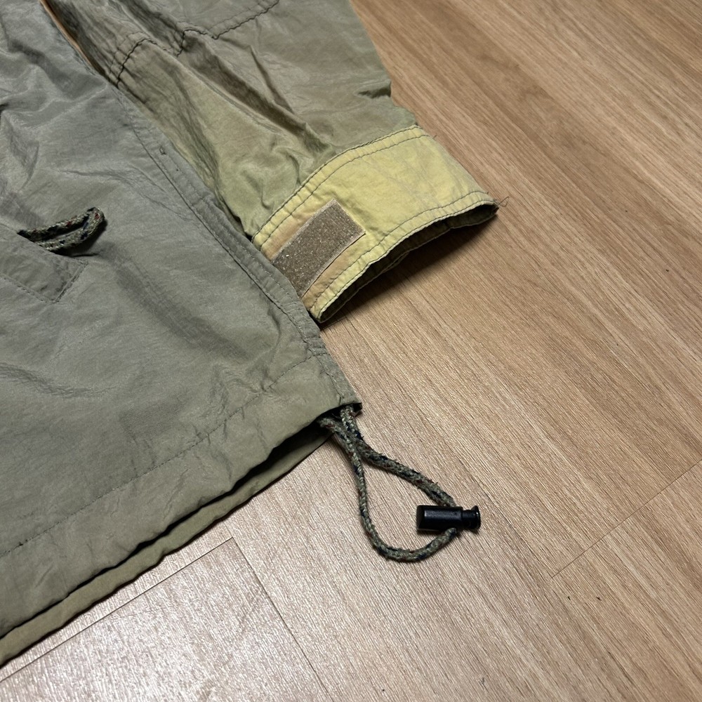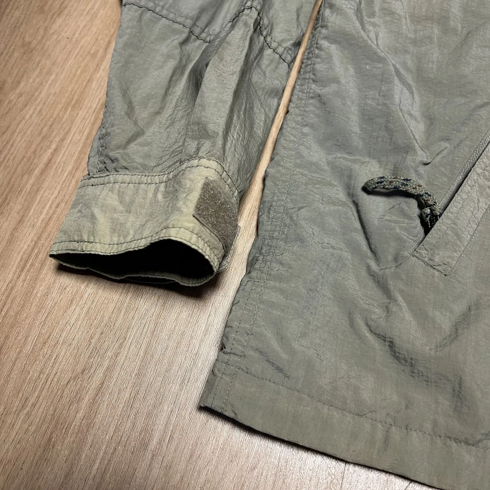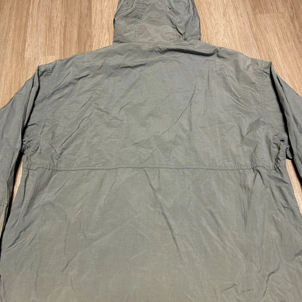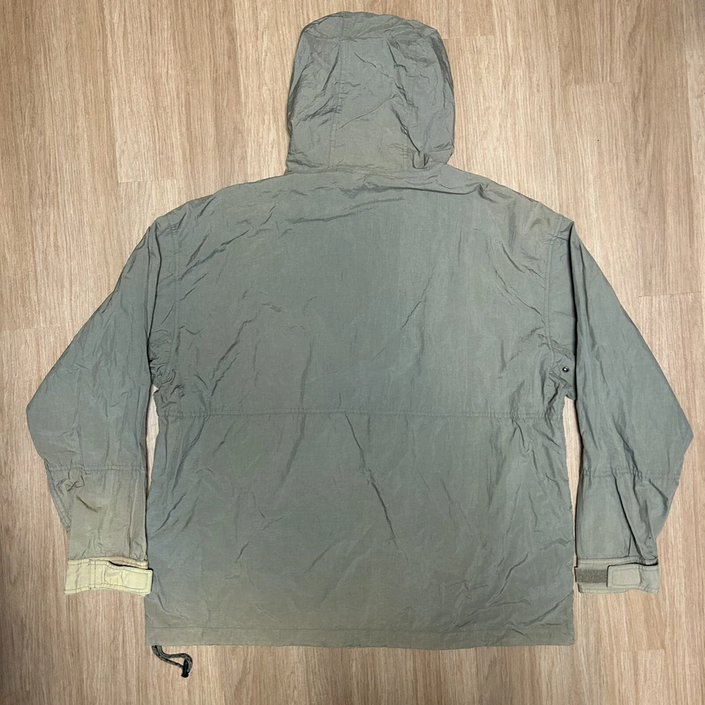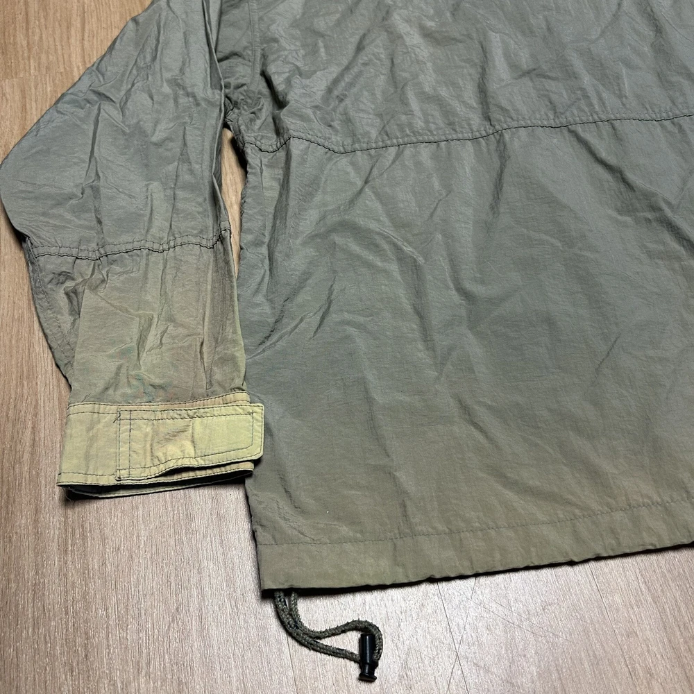This vintage Dunbrooke windbreaker is the perfect addition to any wardrobe. With a tan outer shell made of nylon and canvas, this jacket features a stand-up collar, hood, full zip closure, and button accents. Perfect for any occasion, whether it be travel, casual wear, or workwear, this jacket is a must-have. This mid-length jacket is insulated with polyester and features a nylon lining, making it suitable for all seasons. The embroidered cattle accent adds a touch of Southwestern charm, while the solid pattern and beige color make it a versatile piece. This jacket is a size XL and has a regular fit.