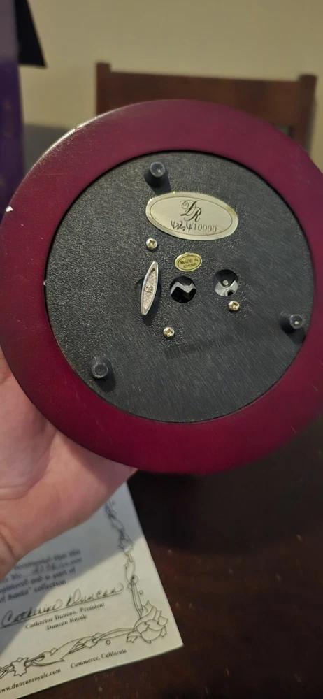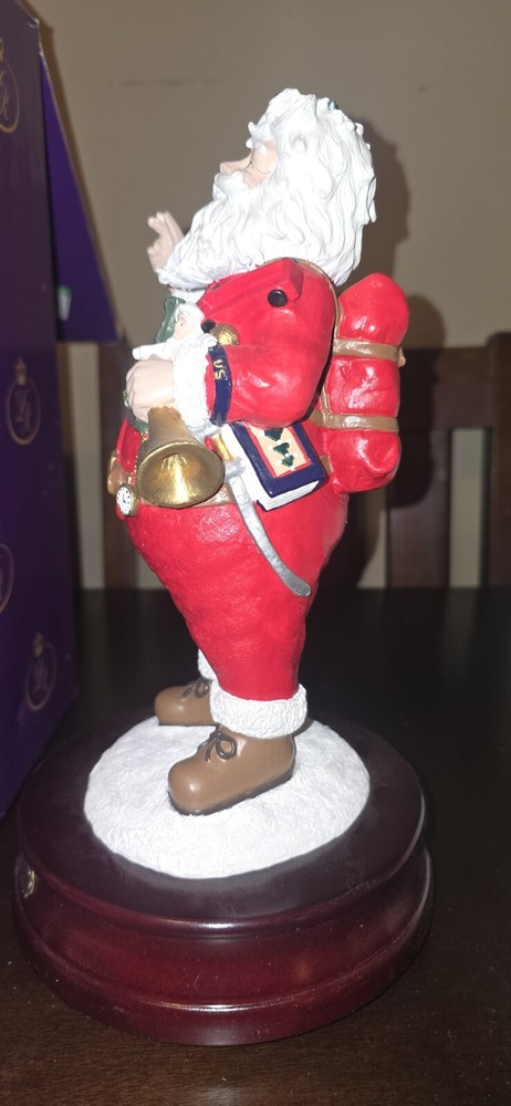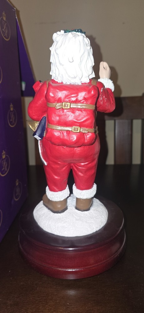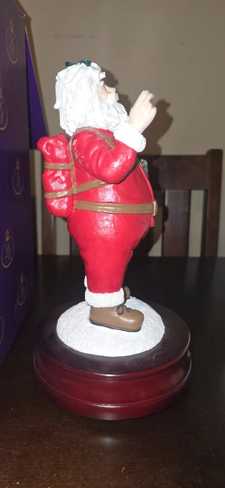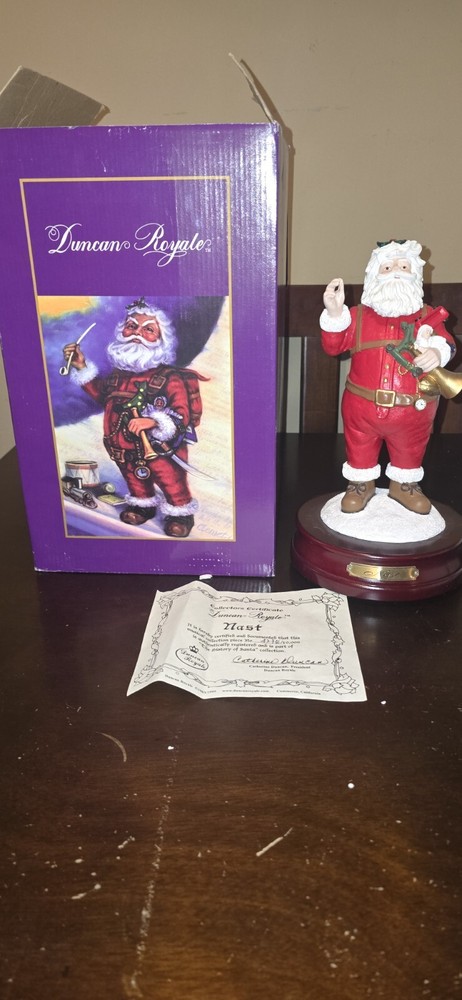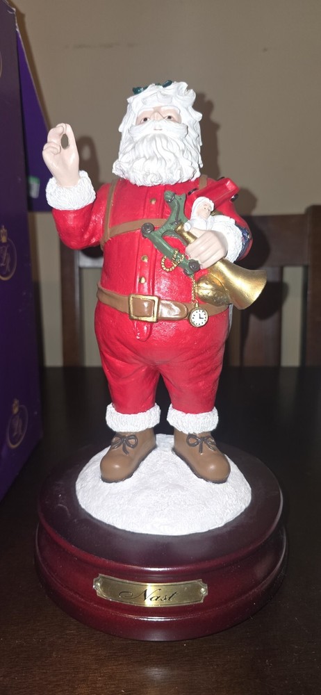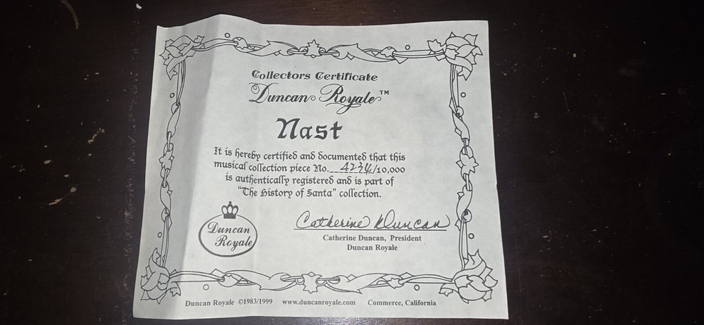 Number 4,234/10,000 This vintage Duncan Royale figurine is a perfect addition to your Christmas decor. It features a beautifully painted Victorian-style figural design of Saint Nicholas, also known as Santa Claus. The wind-up musical figurine stands at 11.5 inches tall and measures 6.38 inches in width and length. The limited edition piece is made of wood, resin, and metal materials and comes in a boxed package. It is a part of the "The History of Santa Collection" and is an original piece manufactured in China in 1999. The figurine is perfect for indoor use and adds a touch of seasonal charm to any collection.
