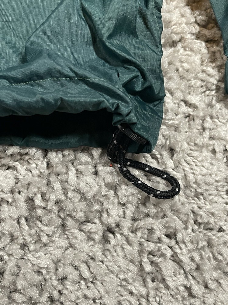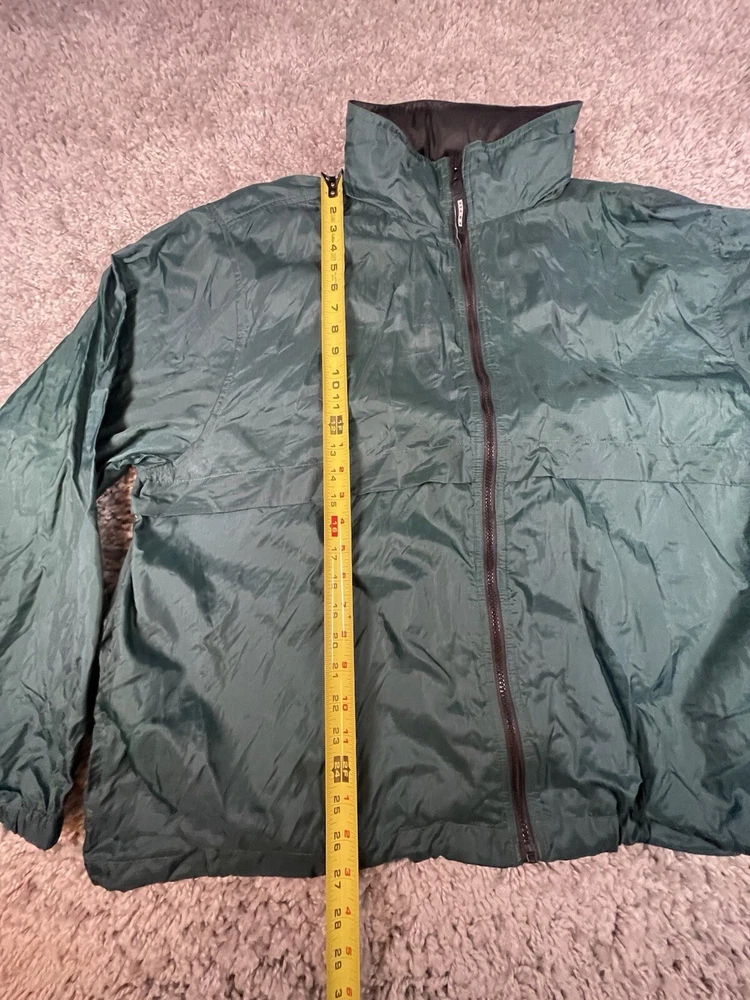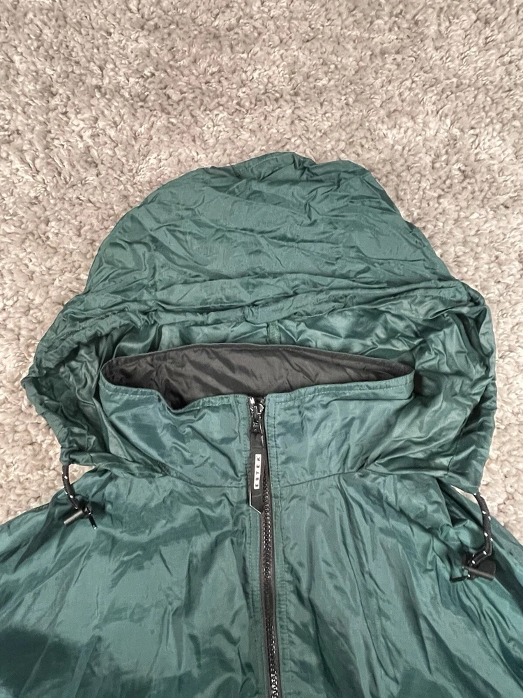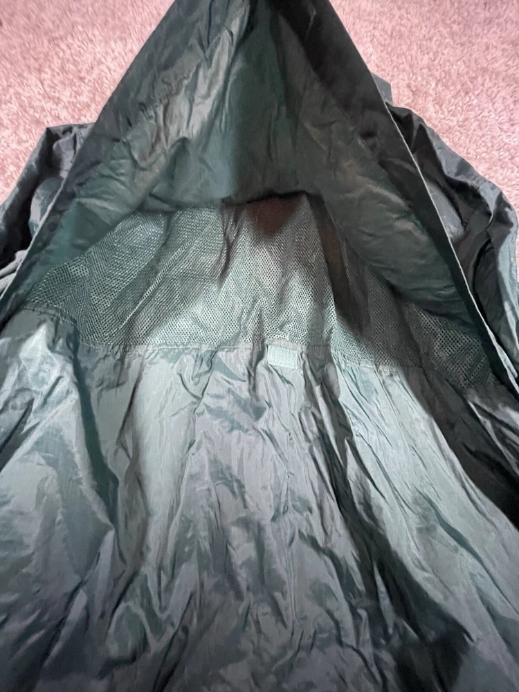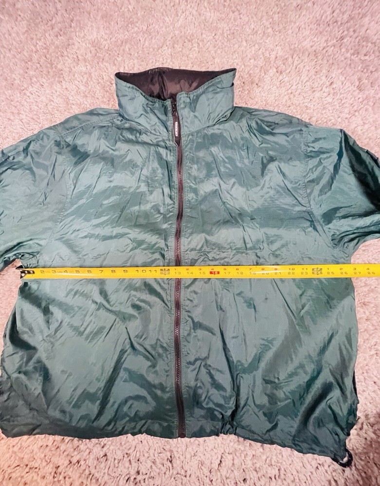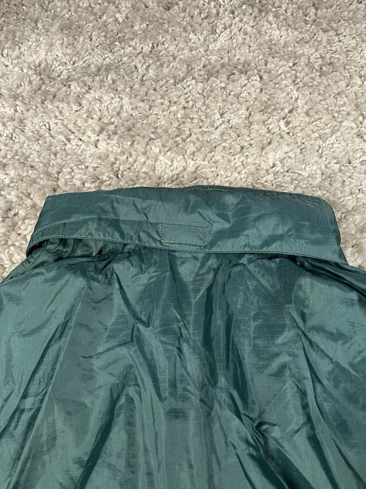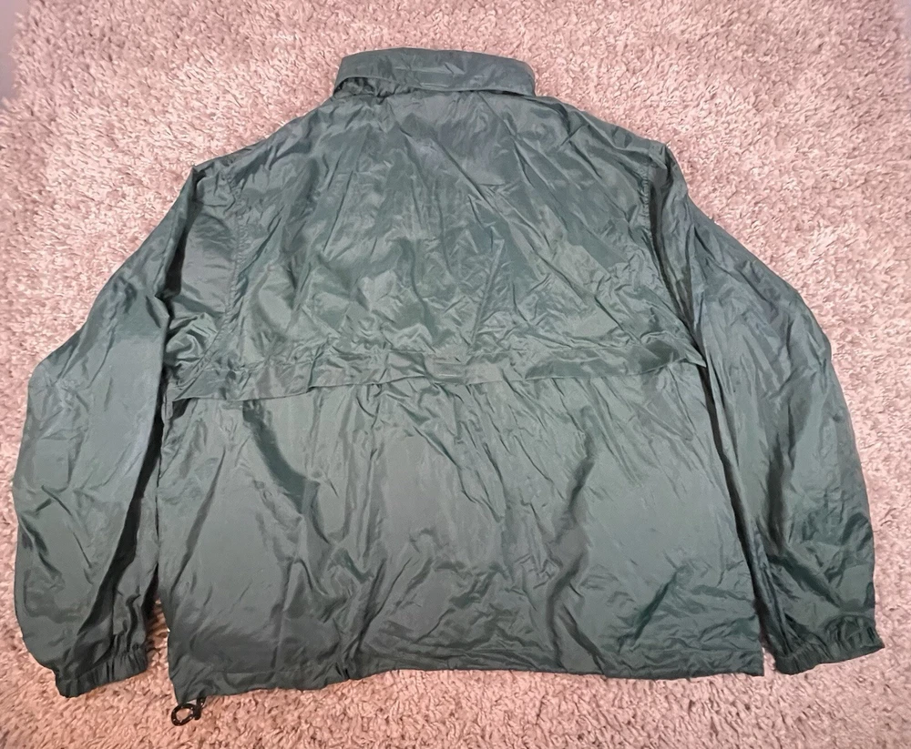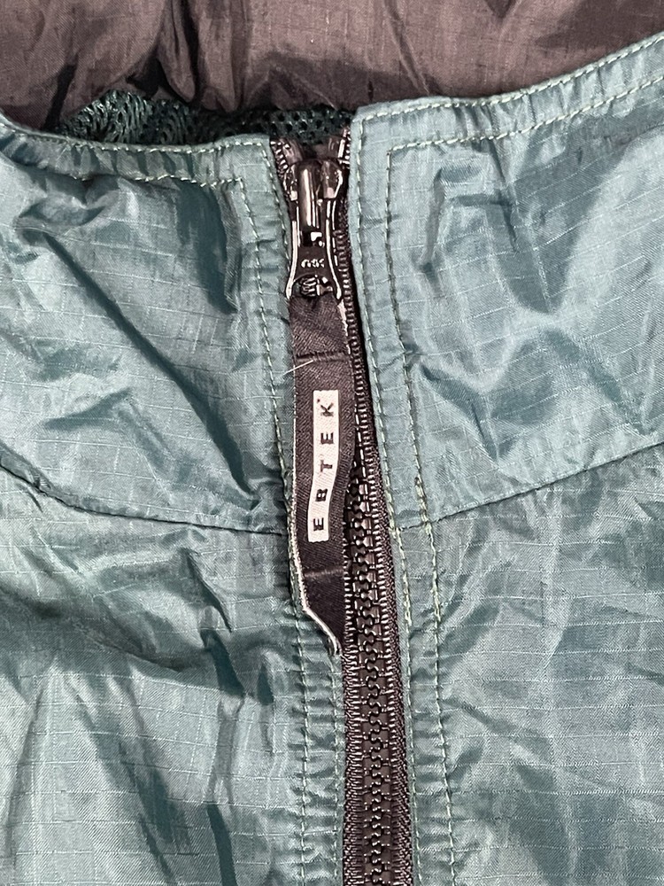 This vintage Eddie Bauer EBTEK jacket is men's XL in green nylon, featuring a hidden hood, zip closure, and softshell fabric. It has a solid pattern with zipper accents, making it suitable for outdoor activities or casual wear. The jacket is water and wind-resistant, lightweight, and has various pockets for storage. Perfect for all seasons, it combines a retro 90s style with modern functionality.