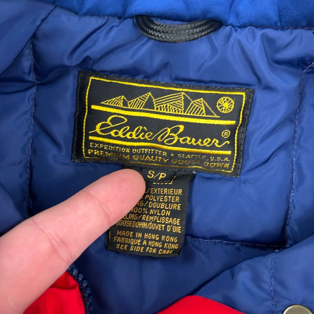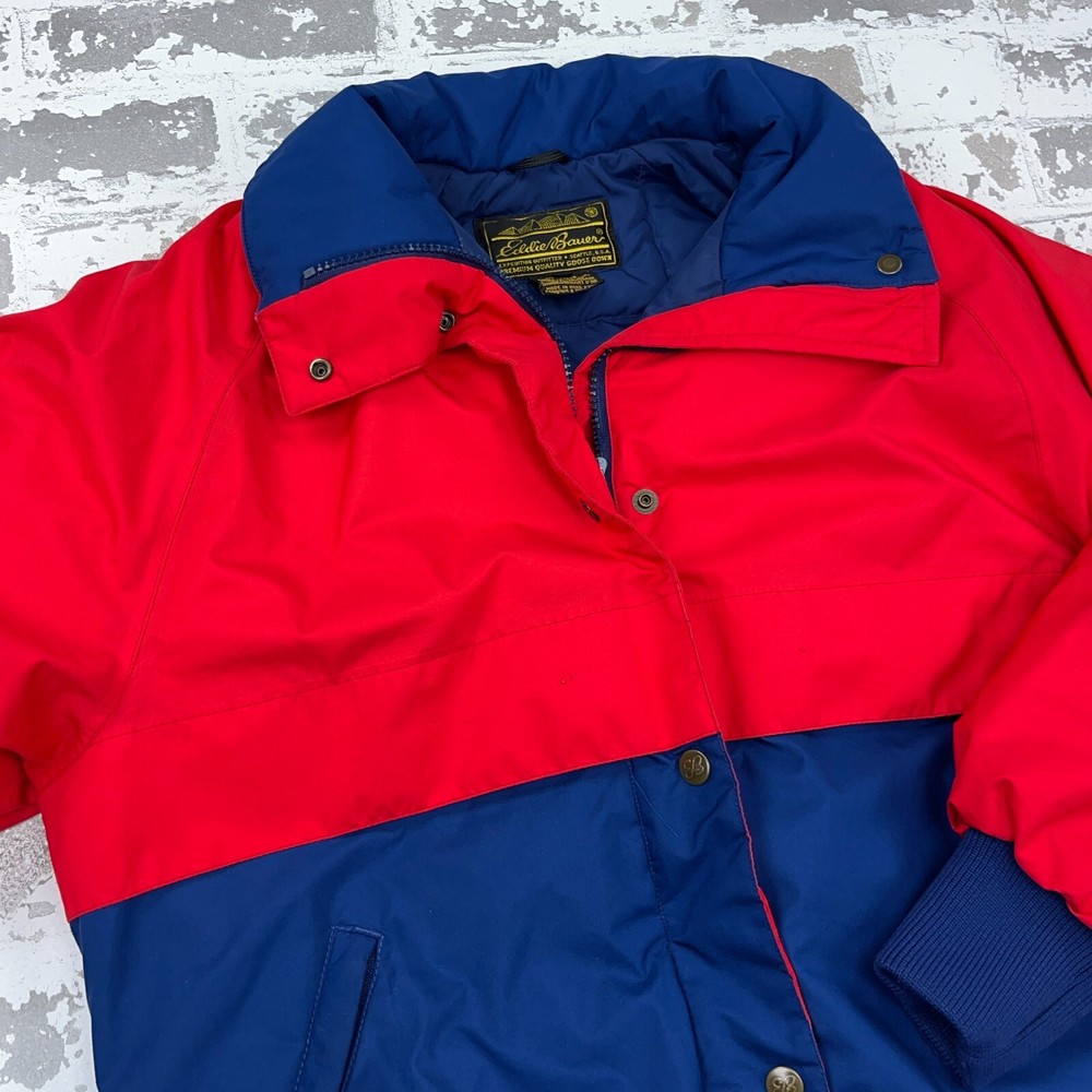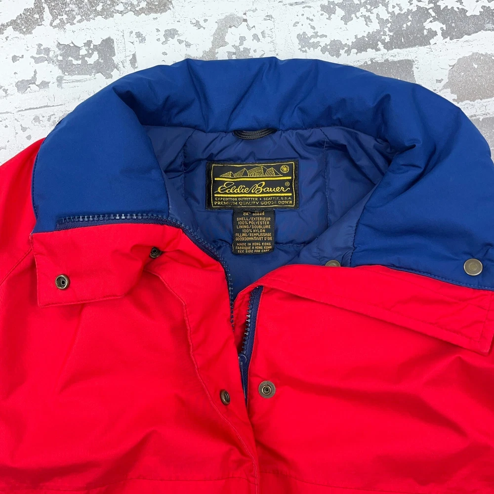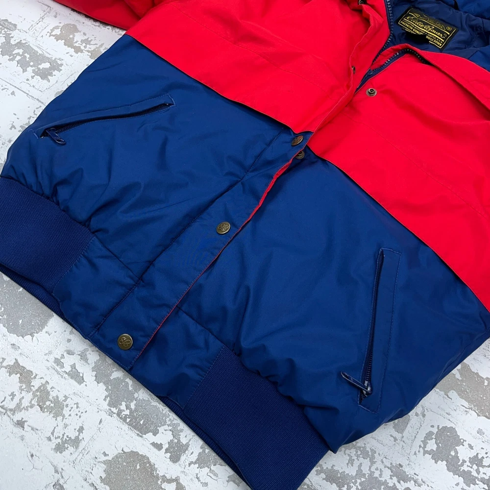 This vintage Eddie Bauer puffer jacket is a solid find! The red and blue bomber style is classic 90s, and the down fill keeps you warm. It’s pre-loved with some light sleeve stains, but overall in good shape—just check the pics for details. Fits true to size if you compare measurements. Cleaned and ready to wear, great for adding retro flair to your wardrobe. Small biz love!