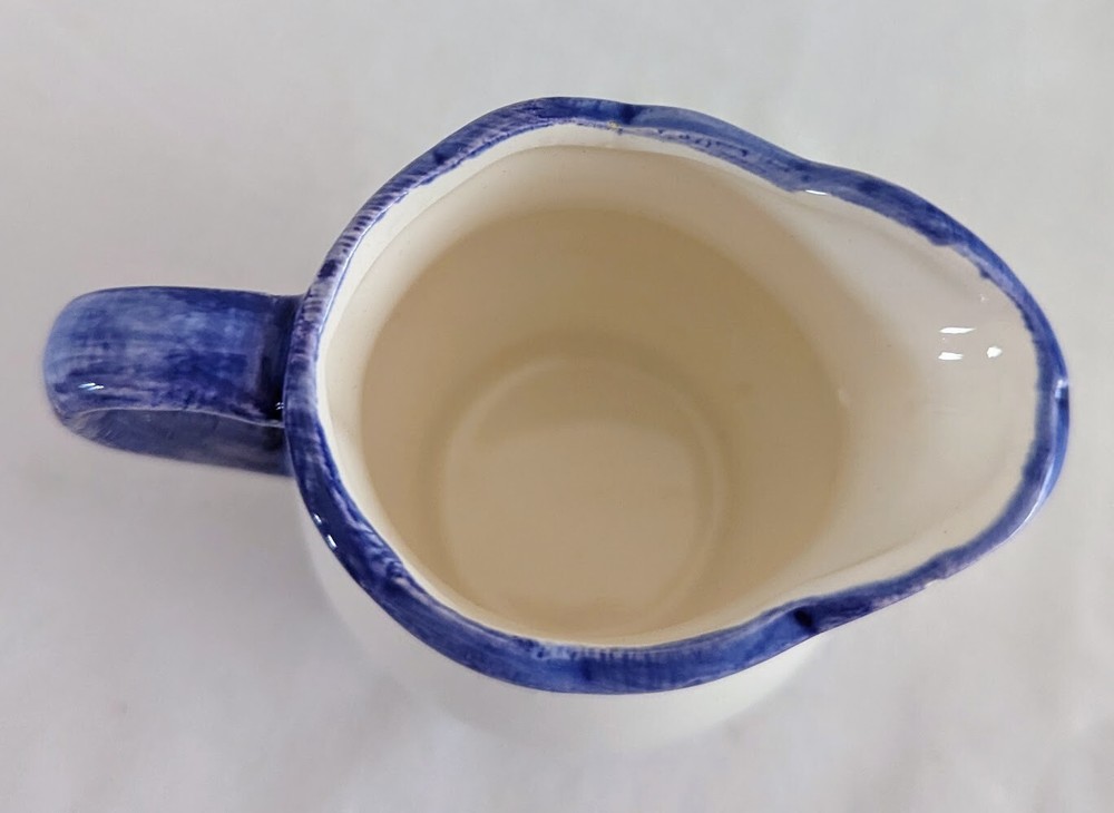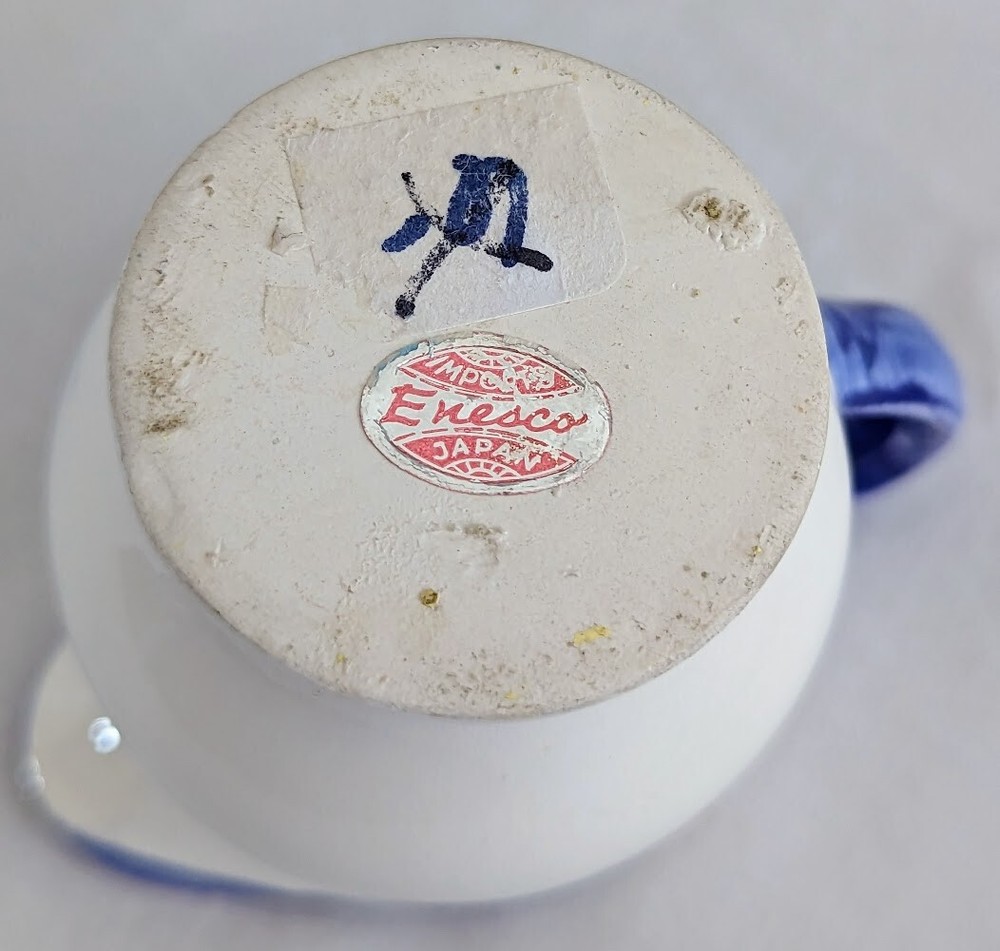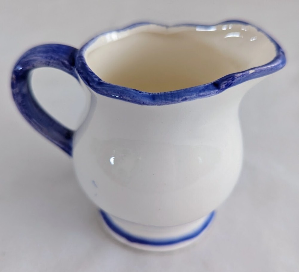 Vintage Enesco Imports mini pitcher. White with blue floral design and blue trim. 2 3/4" tall....