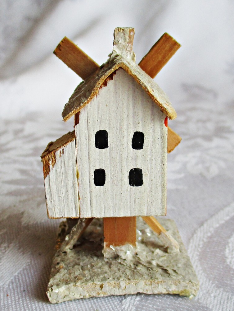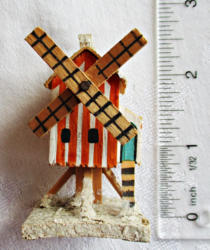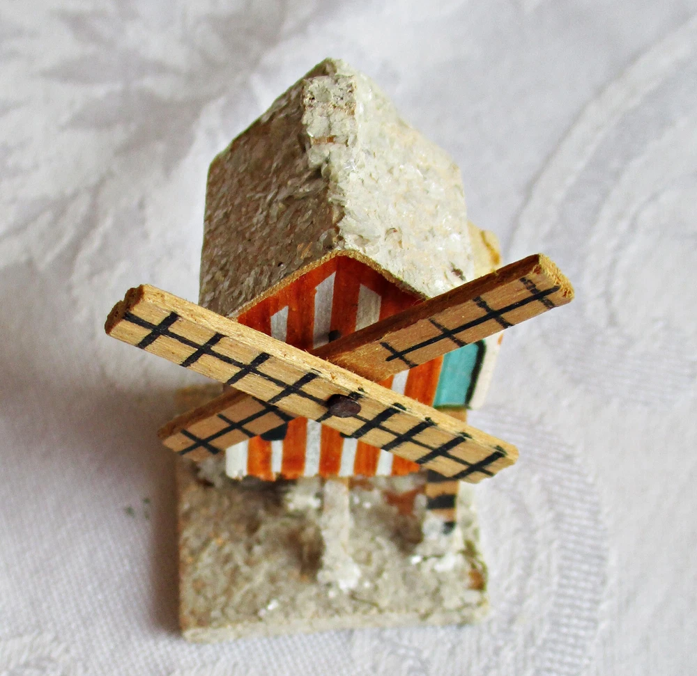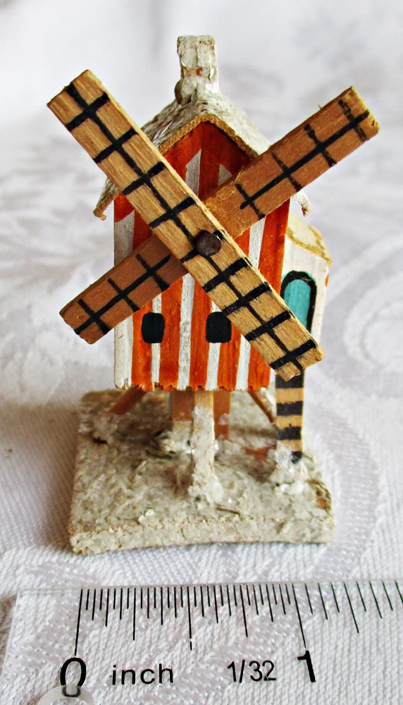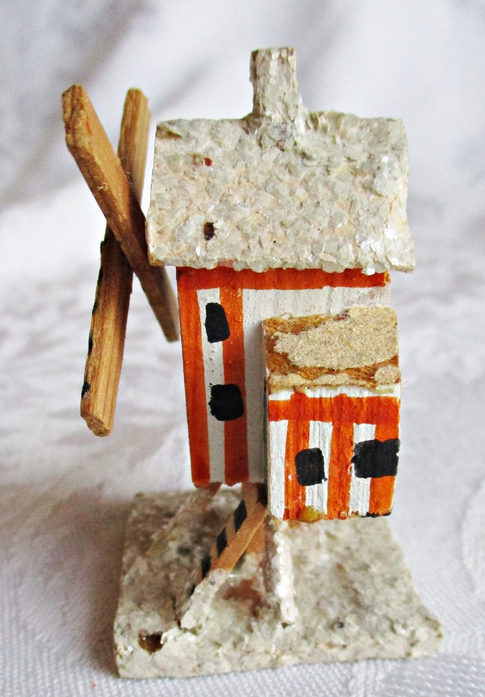 Beautifully hand-made vintage Erzgebirge wood windmill. Hand-painted with mica accents on base and roof. Measures approximately 2 1/2 inches tall on 1 3/8-inch-square base, with windmill blades measuring 1 5/8 inches from tip to tip. Unmarked but most likely German in origin and dating to the 1930s or earlier. This piece was part of a Pennsylvania holiday putz display for many years. Please see the photos for more detail. I will combine shipping on multiple items. Thanks for looking.