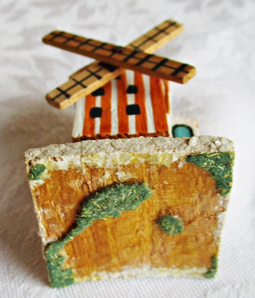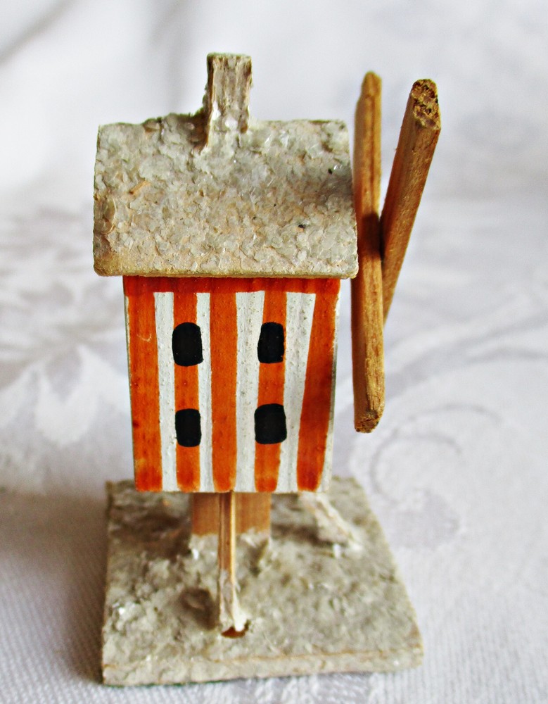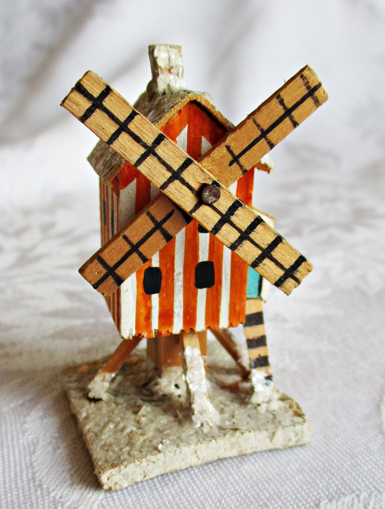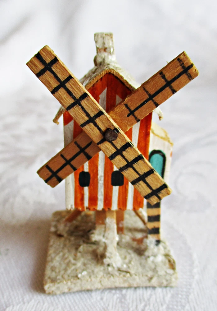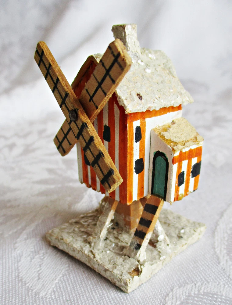 Beautifully hand-made vintage Erzgebirge wood windmill. Hand-painted with mica accents on base and roof. Measures approximately 2 1/2 inches tall on 1 3/8-inch-square base, with windmill blades measuring 1 5/8 inches from tip to tip. Unmarked but most likely German in origin and dating to the 1930s or earlier. This piece was part of a Pennsylvania holiday putz display for many years. Please see the photos for more detail. I will combine shipping on multiple items. Thanks for looking.