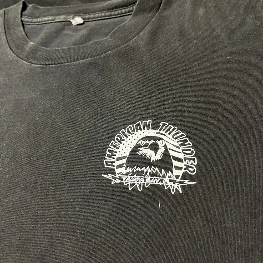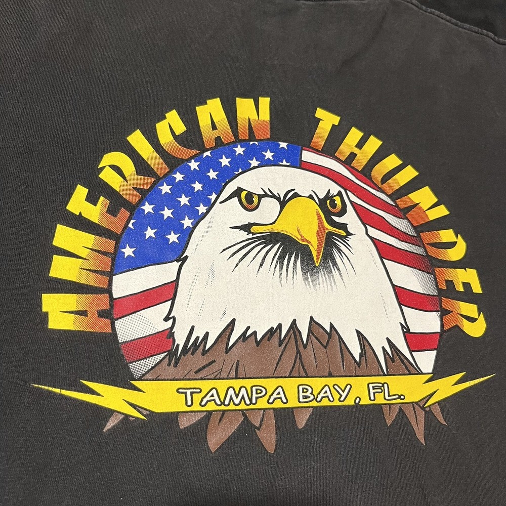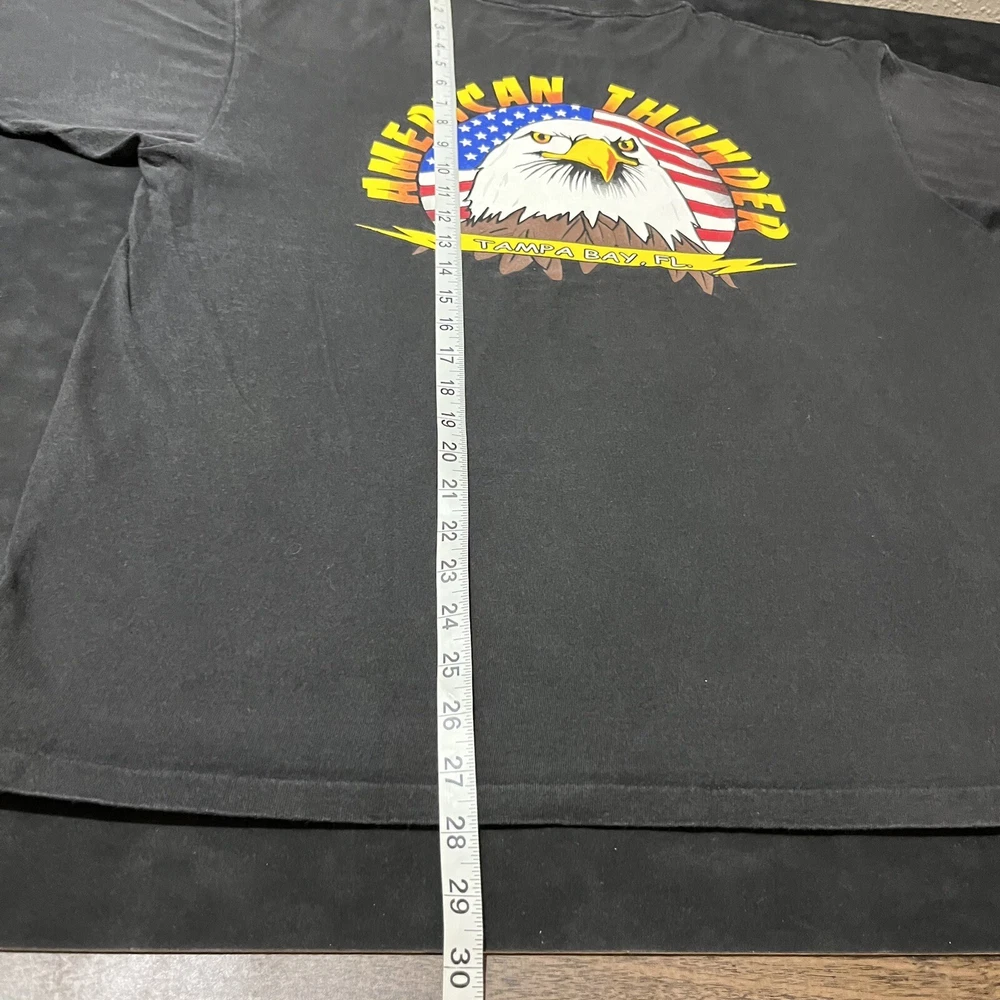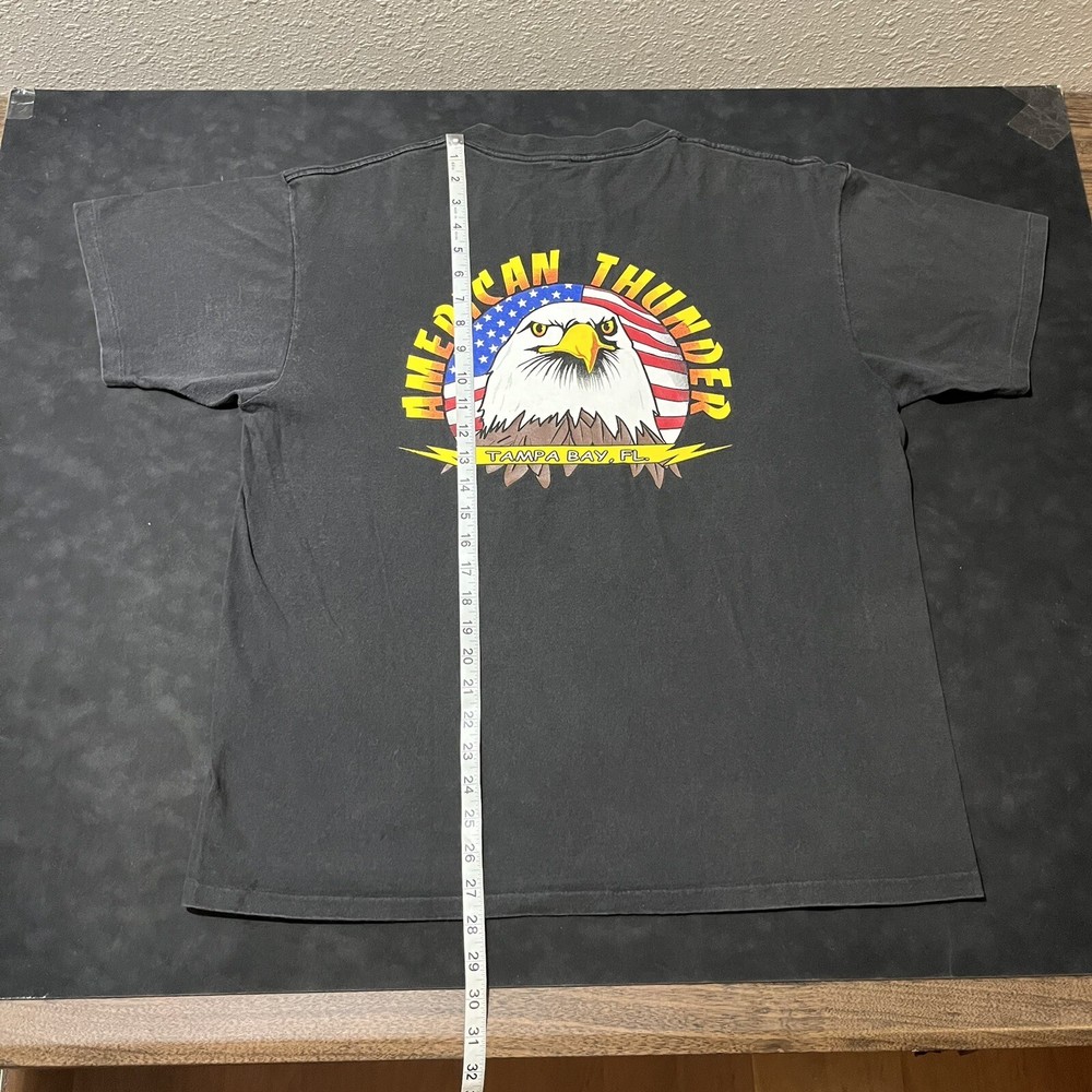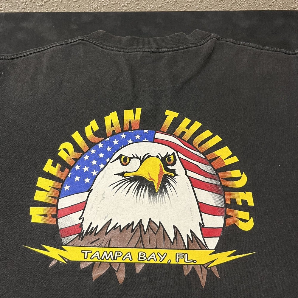 Elevate your biker style with this vintage American Thunder T-shirt featuring a bold bald eagle graphic. Made from comfortable cotton knit fabric, this short sleeve tee boasts a solid pattern, crew neck, and regular fit. The shirt also features the American Thunder logo and is double-sided with a Hanes Beefy-T product line. Perfect for all seasons, this multicolor T-shirt is easy to care for and a must-have for any fan of biker or Harley culture. Available in size L, this pre-owned shirt is a great addition to any wardrobe. Get ready to feel the wind with this American Thunder tee!