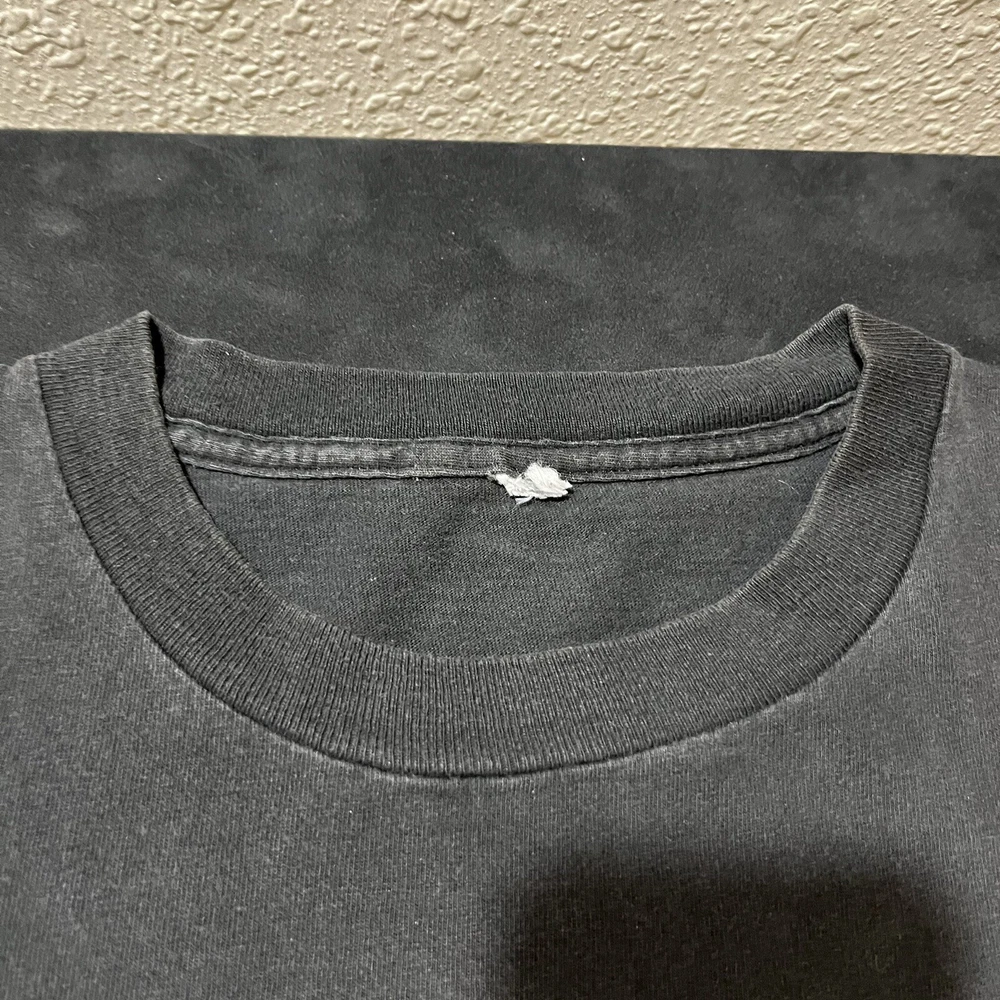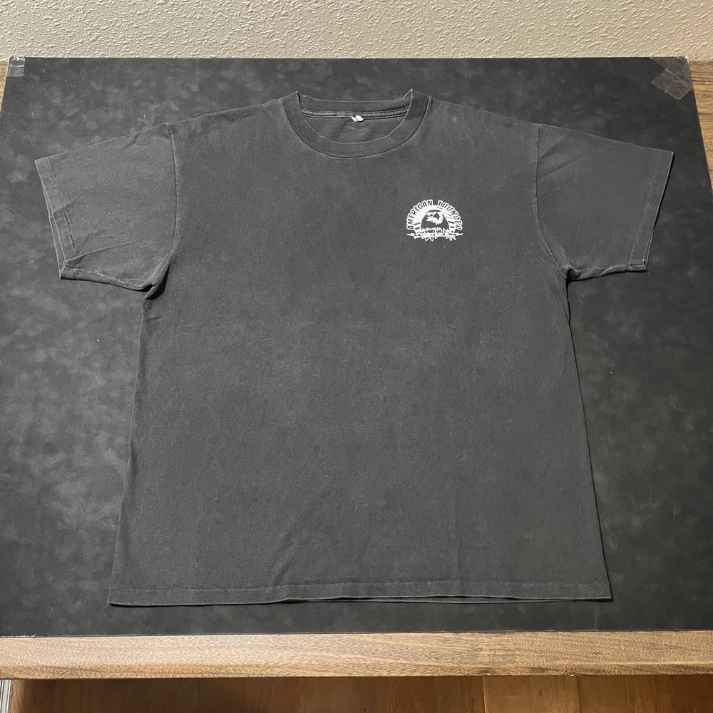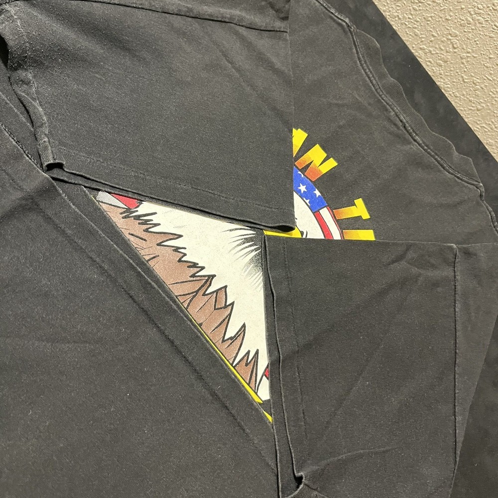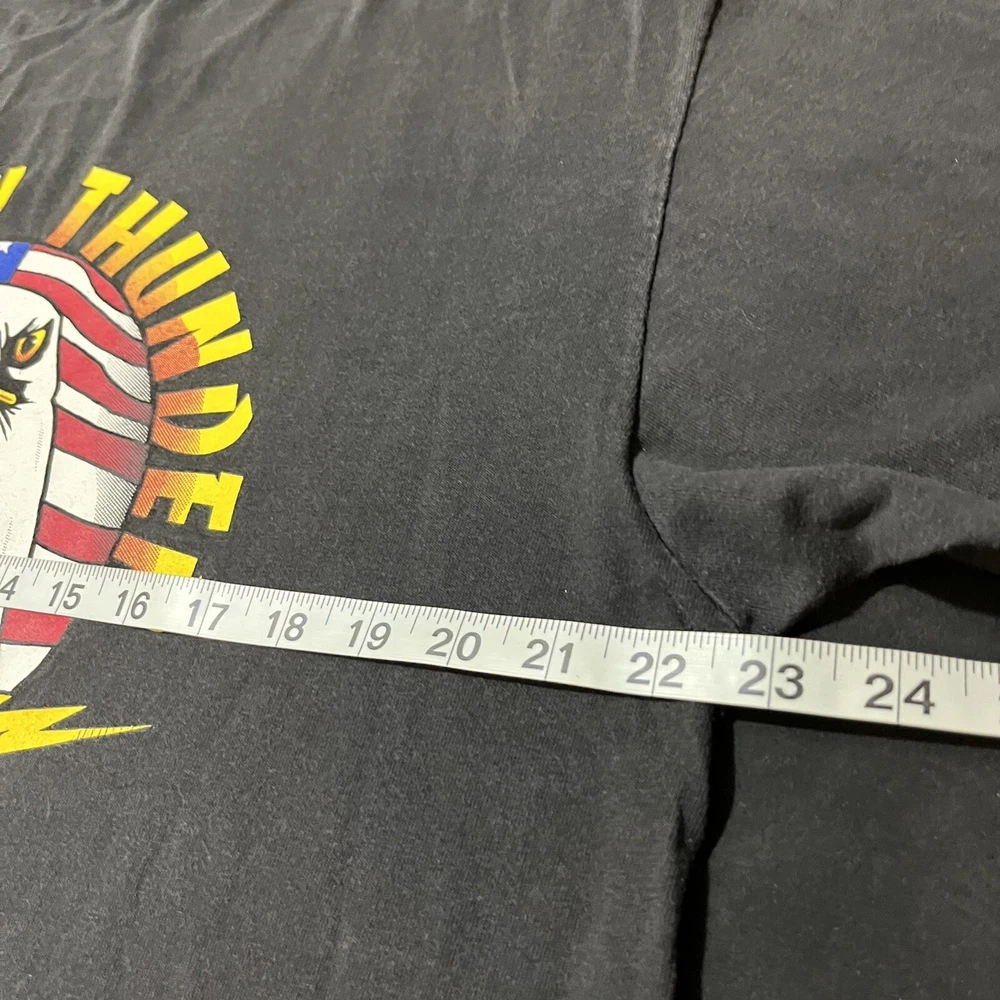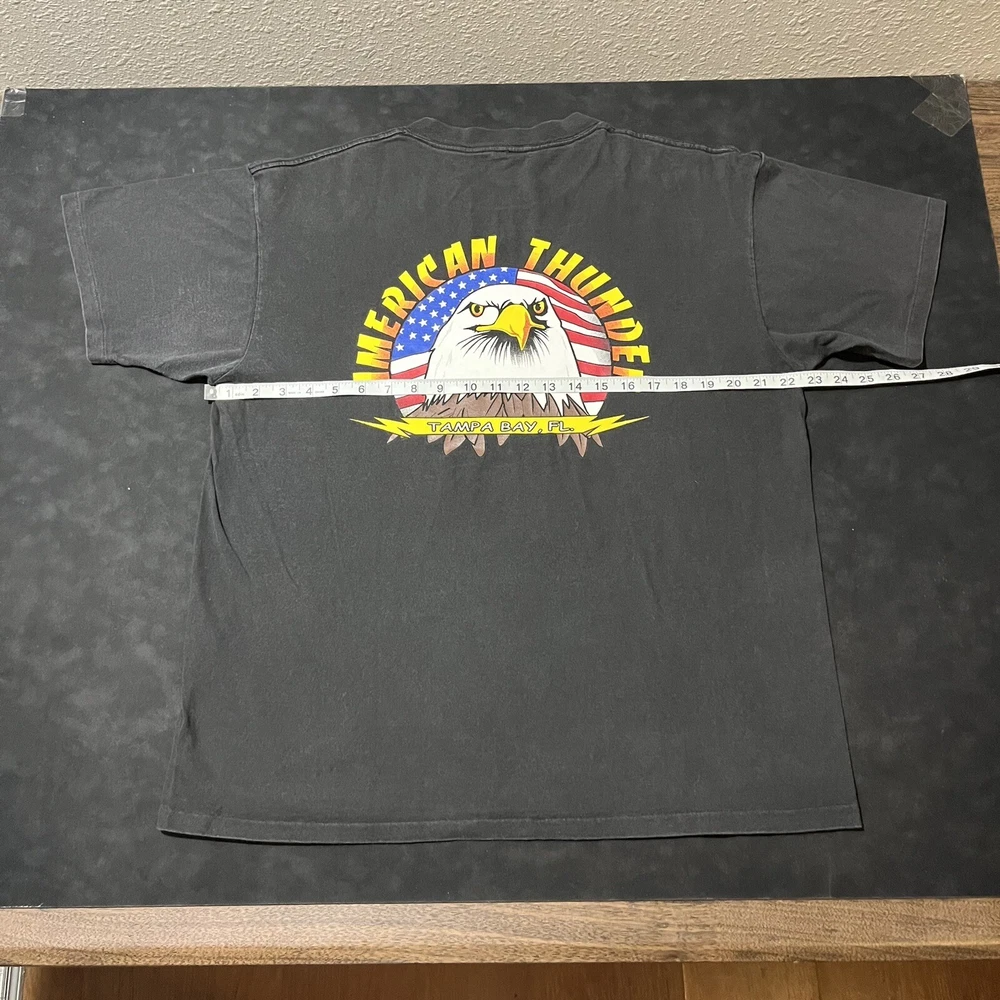Elevate your biker style with this vintage American Thunder T-shirt featuring a bold bald eagle graphic. Made from comfortable cotton knit fabric, this short sleeve tee boasts a solid pattern, crew neck, and regular fit. The shirt also features the American Thunder logo and is double-sided with a Hanes Beefy-T product line. Perfect for all seasons, this multicolor T-shirt is easy to care for and a must-have for any fan of biker or Harley culture. Available in size L, this pre-owned shirt is a great addition to any wardrobe. Get ready to feel the wind with this American Thunder tee!