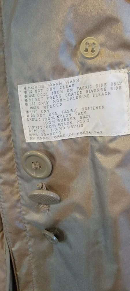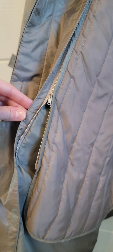 Removable quilted liner, all zippers and buttons operate. Super cozy on a cold and rainy day. Great preowned condition for a piece from the 80s....