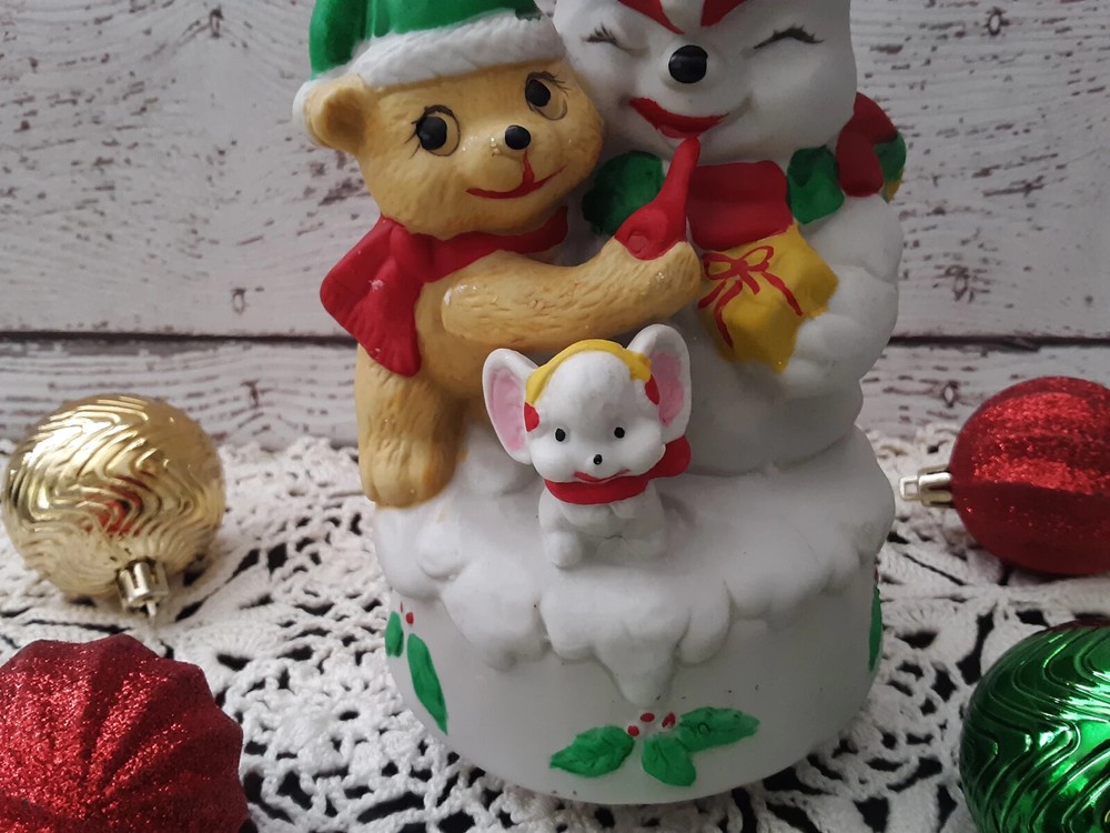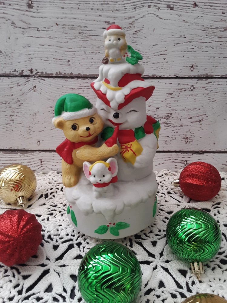 Vintage Frosty The Snowman & Friends Musical Figurine - Plays Jingle Bells Frosty with his friend's Musical Figurine - Wind it up to play "Jingle Bells" Standing 7.5" Tall x 4.5" Round This is a used item in great condition,