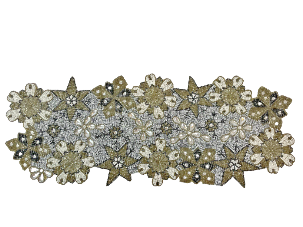 Vintage Fully Beaded Pier 1 Table Runner White Gold Silver Flower Design 14x35 Gorgeous vintage beaded table runner Made for Pier 1 Imports 14" wide, 35" long Fully beaded, all beads intact Back lined in silver satin