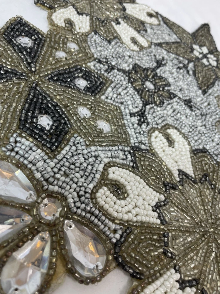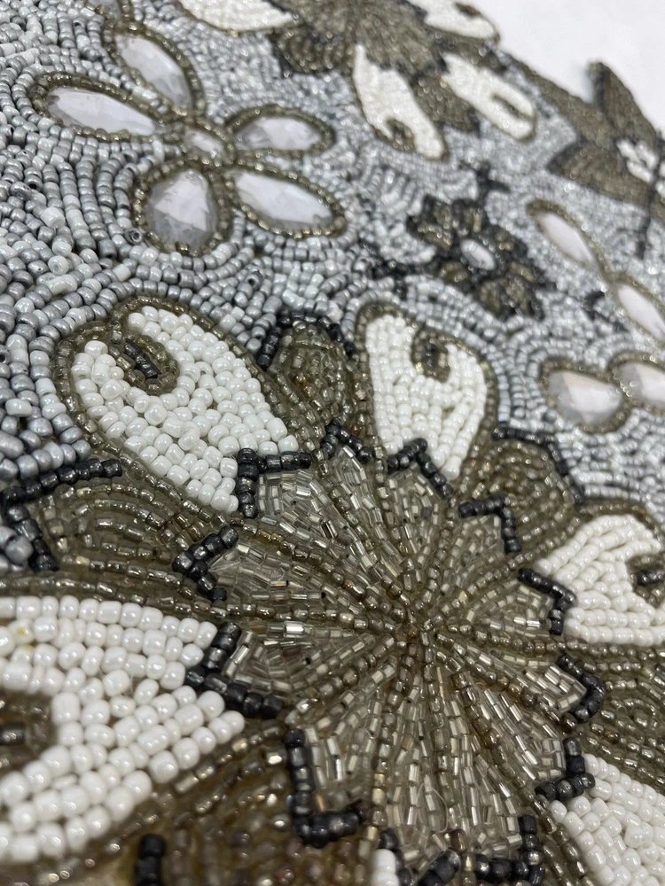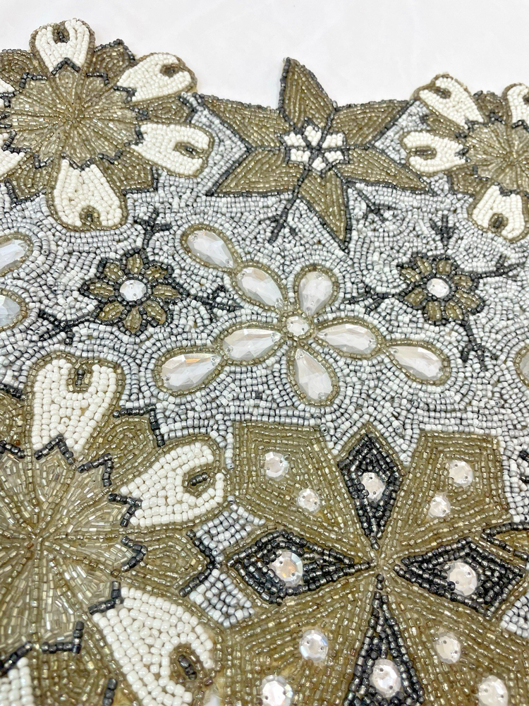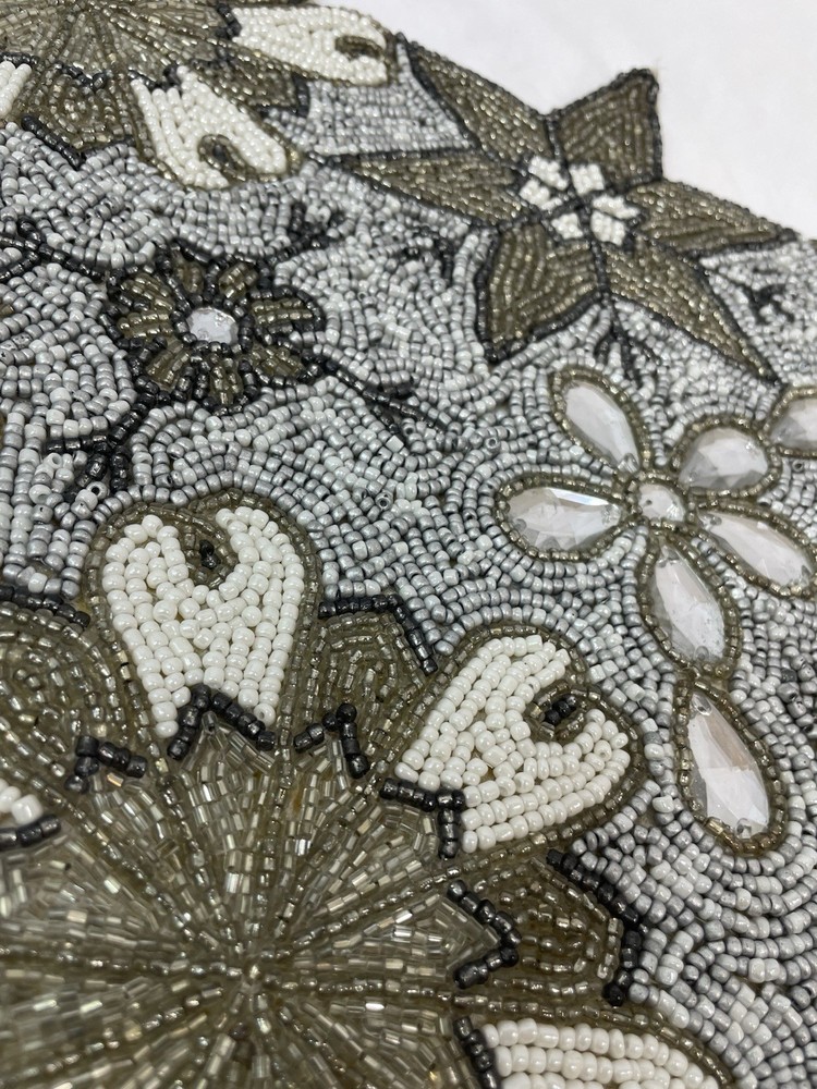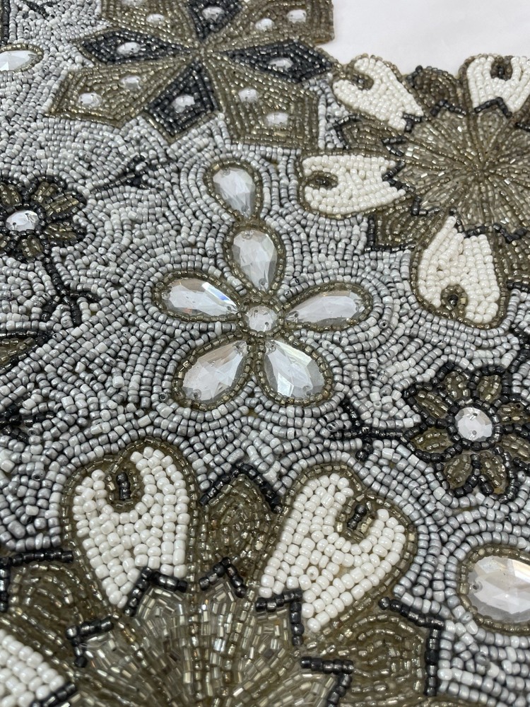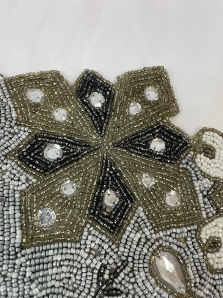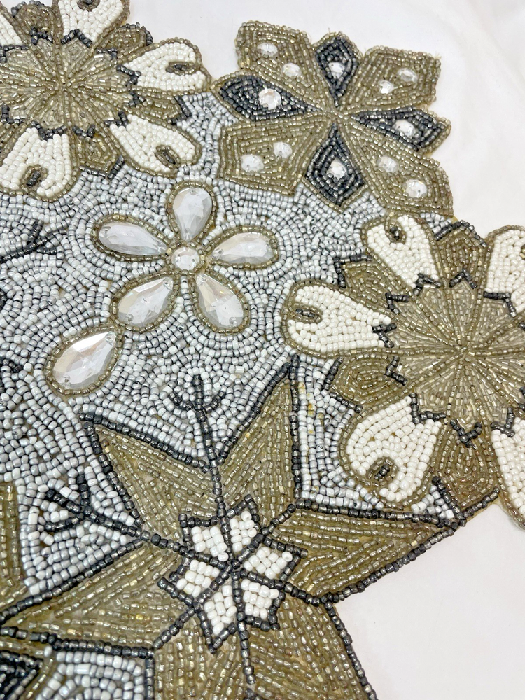 This stunning vintage Pier 1 table runner is an absolute showstopper! The delicate white, gold, and silver beaded floral design adds instant elegance to any table. At 14" x 35", it's the perfect size for dressers or dining tables. The intricate beadwork is flawless and the silver satin backing gives it a luxurious finish. I love how it catches the light - it instantly elevates my home decor. The craftsmanship is impeccable with all beads securely intact. A true vintage treasure that looks far more expensive than it is!