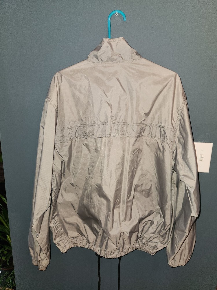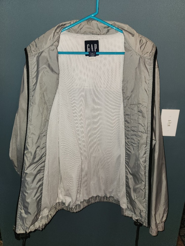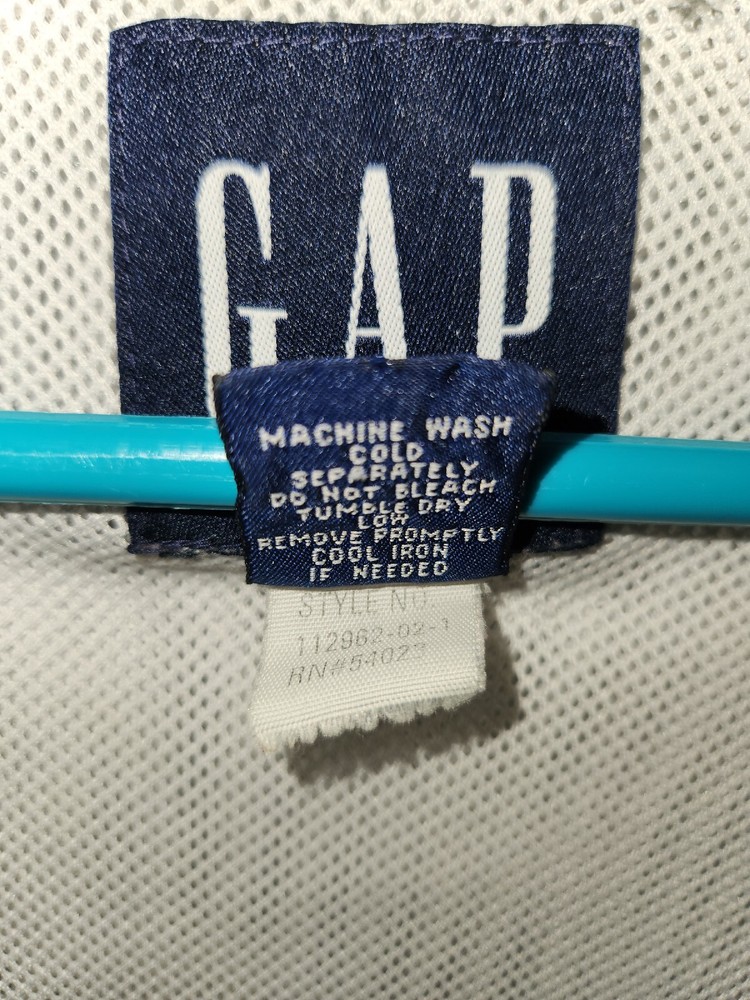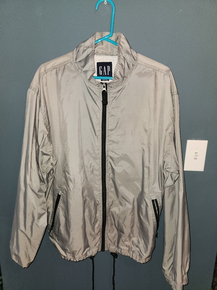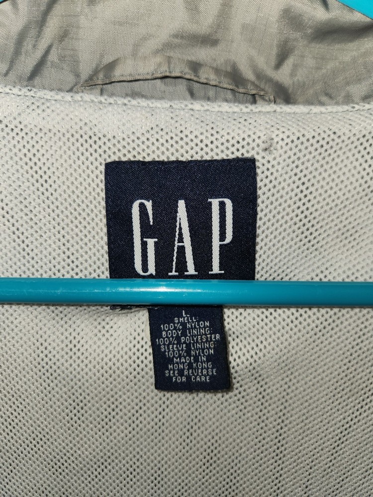Check out the photos for quality and condition. This vintage GAP wind breaker jacket is a stylish addition to any wardrobe. Made from durable nylon in a solid gray color, it features a zip closure and accents, making it perfect for casual occasions. The jacket is a size large and has a polyester lining for added comfort. With its all-season features, this windbreaker is suitable for walking and hiking in the winter, fall, and spring. The jacket is a regular fit and has a vintage feel, perfect for those who love retro styles. Made in Hong Kong, this GAP jacket is a must-have for any clothing collection.