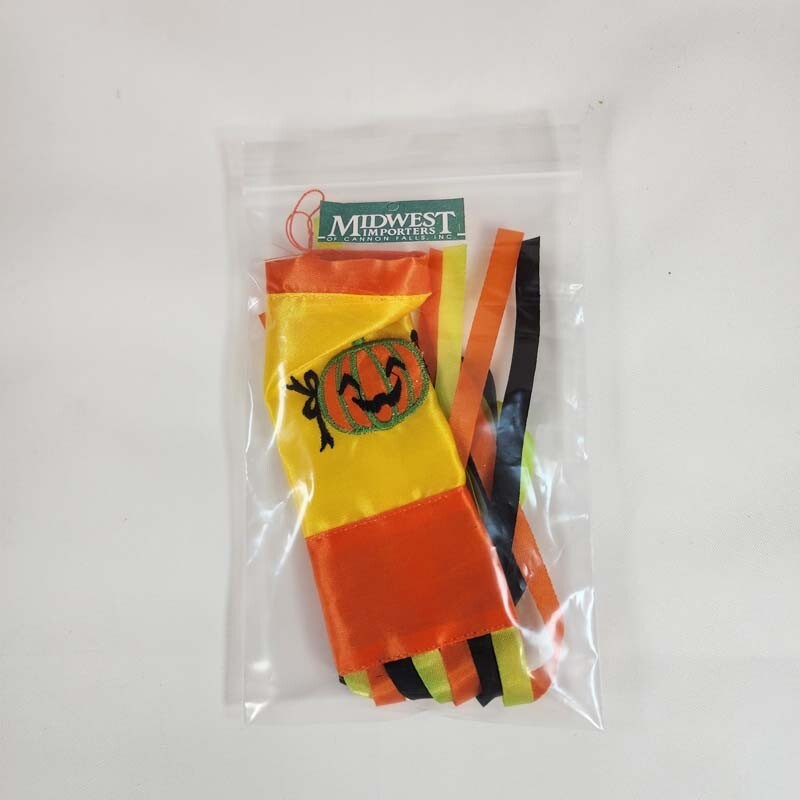 Vintage Midwest Imports Of Cannon Falls Halloween Mini Windsock Jack-O-Lantern Ornament New Old Store Stock. In excellent condition for it's age with no marks of scratches. Very cute miniature handmade windsock ornament. Vivid colors orange, yellow, green and black. Decorative machine embroidered Jack-O-Lantern on front. Windsock is made from polyester fabric. Does not include ornament stand. Perfect addition for a Halloween tree or table decoration. You could hang in a window or door for the holiday. Height: 10 1/2 inches Diameter: 1 3/8 inches Items that I sell that are marked vintage, antique or collectible may show some signs of wear to the original boxes or original package when available. See pictures for detail. All of my items come from a smoke-free environment. I do combine shipping on multiple items. #1474 #1473 Track Page Views With Auctiva's Counter