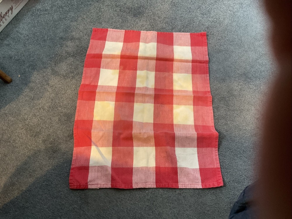 Vintage handmade in India - Design Imports - 1991 - cotton reds and white checks. Some light staining from estate sale storage. Hook for hanging. We welcome any questions...