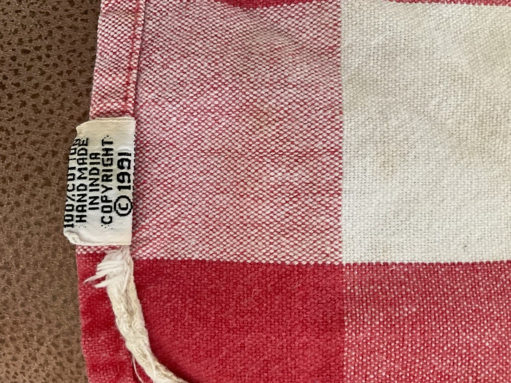 Vintage handmade in India - Design Imports - 1991 - cotton reds and white checks. Some light staining from estate sale storage. Hook for hanging. We welcome any questions