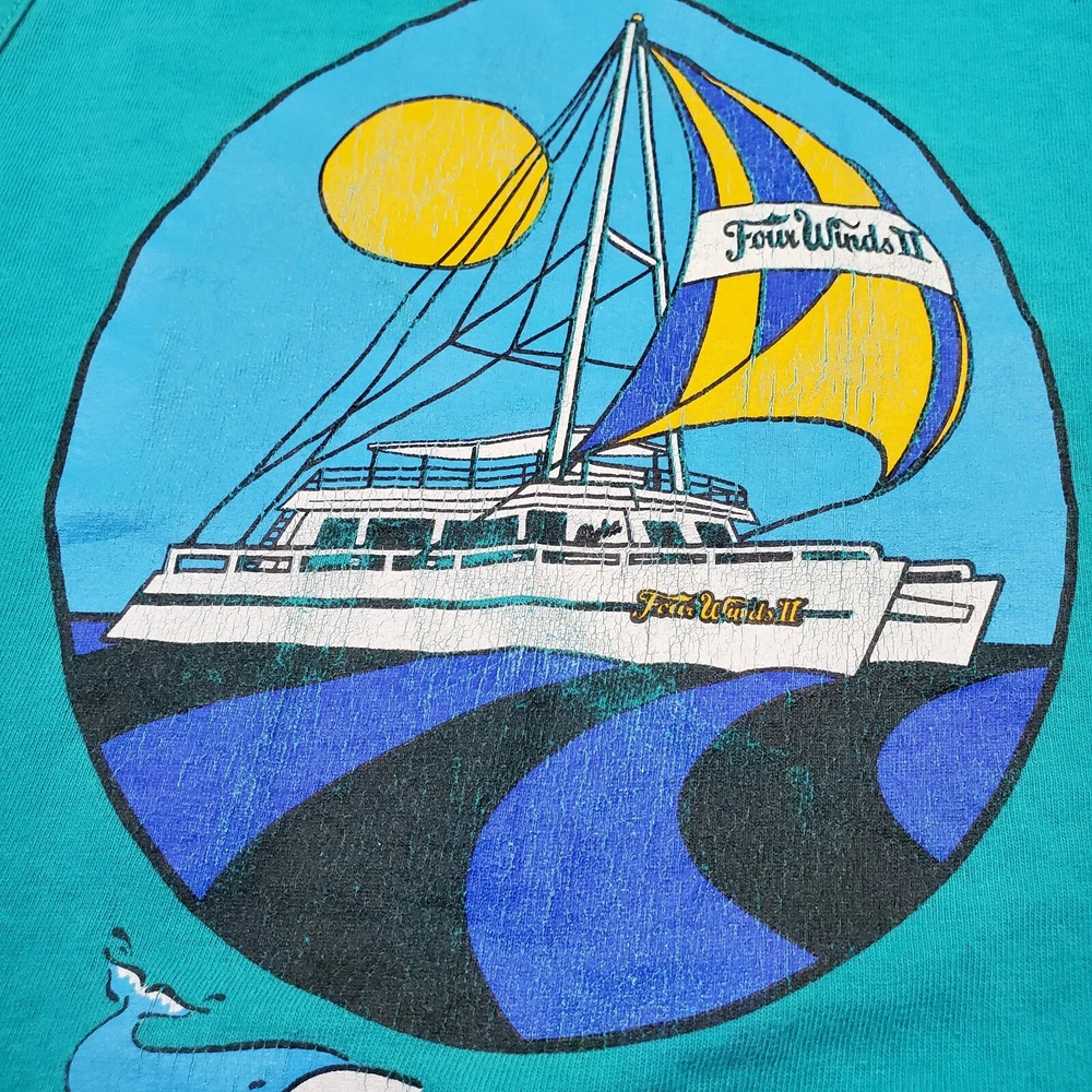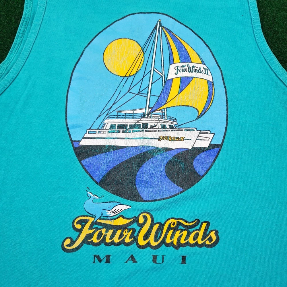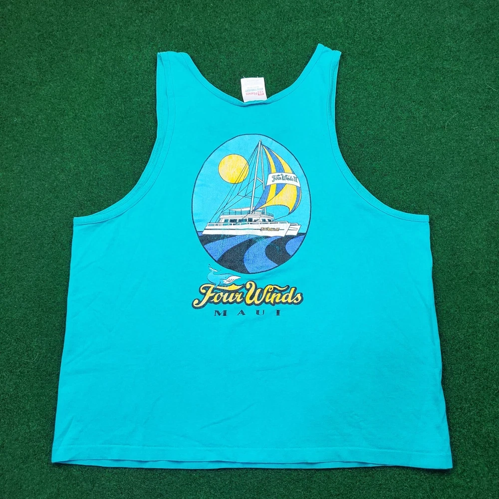 Just got this vintage Hanes tank top, and it’s such a cool find! The faded blue color and retro Four Winds Maui print give off serious 90s beach vibes. Fits true to the measurements shown, so double-check the pics before buying. Love the soft, broken-in feel—perfect for summer or layering. Some minor wear adds to its charm. Super happy with this unique piece!