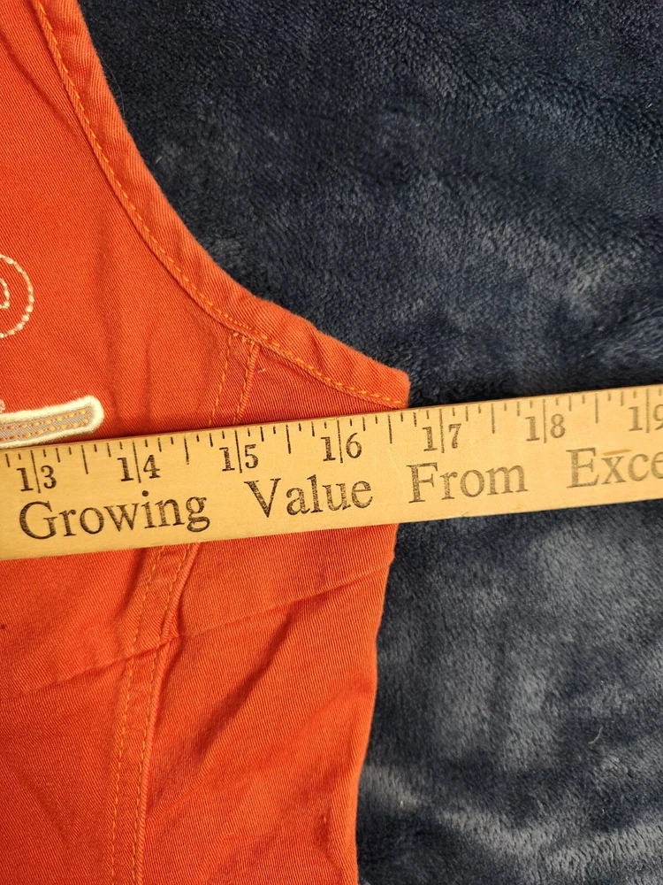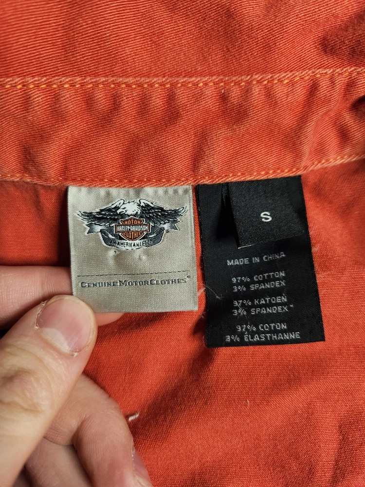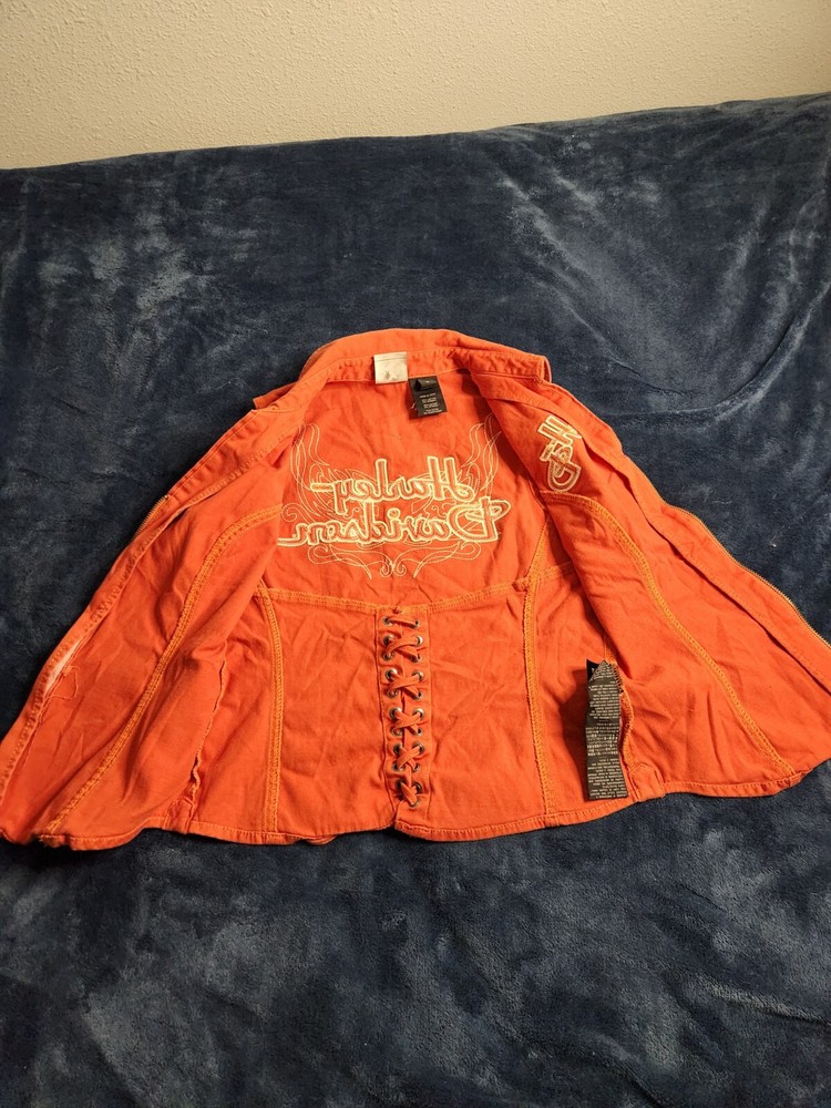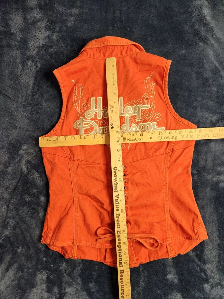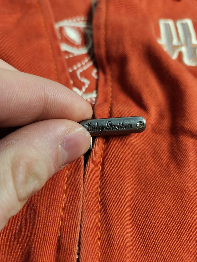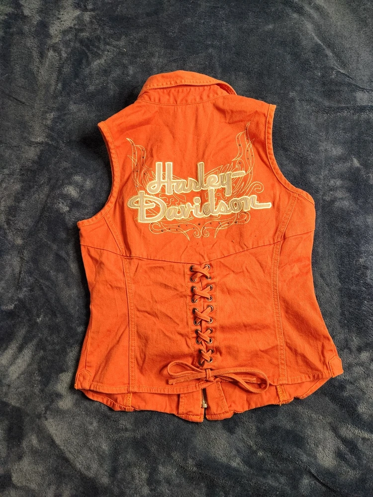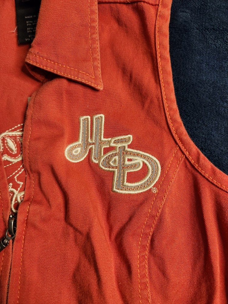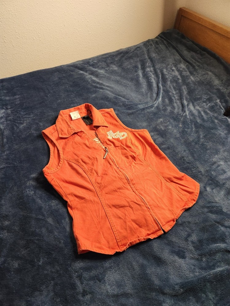 This is a vintage Harley Davidson canvas vest for women in size small. The orange vest features a full zip closure with a rhinestone accent, adding a touch of sparkle. It has a biker style with a mid-length sleeveless design, making it perfect for casual wear or travel. The vest is lightweight, breathable, and wind-resistant, suitable for summer, fall, and spring seasons.