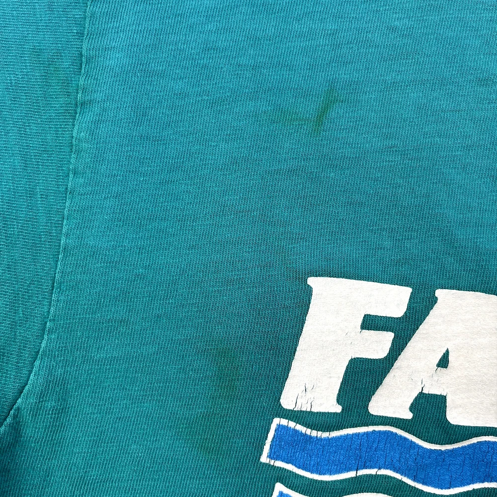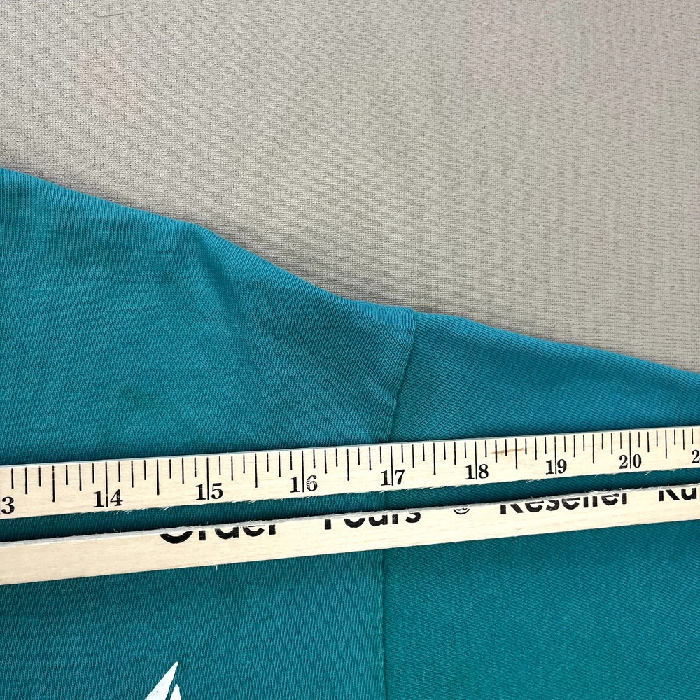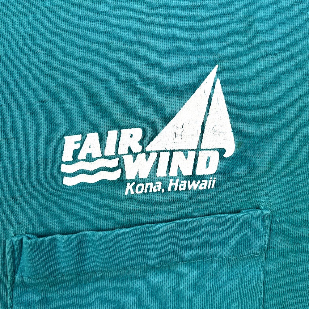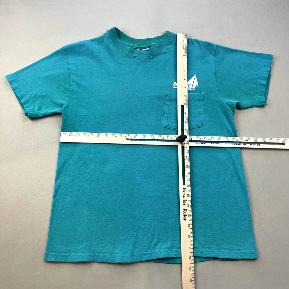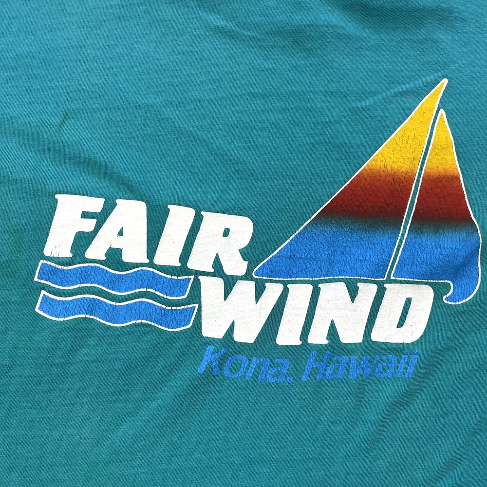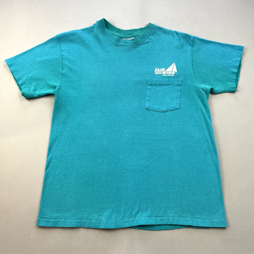 <![CDATA[<div>Vintage Hawaii Sail Boat T-Shirt Adult Small Teal Blue Fair Wind Kona Surf Made in USA 90s Single stitch. Tagged Size L, but due to age/shrink fits Size S. Good condition, faint discoloration under pits. Marks on back. Pit to Pit: 19" Length: 25" Shoulders: 17" ********************************** Measurements are taken laid flat; please double check for fit. For best accuracy, compare measurements to a similar garment that fits you well. *Please note that this item is pre-owned and subject to defects. We do our best to inspect all items under photo lights and mention any flaws. Feel free to message for questions* ~We do bundle deals! Please message us for a better bundle price!~ SKU10428