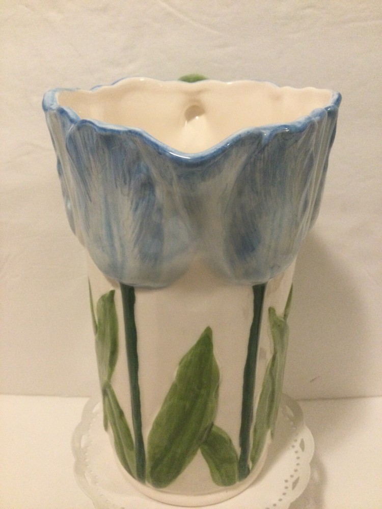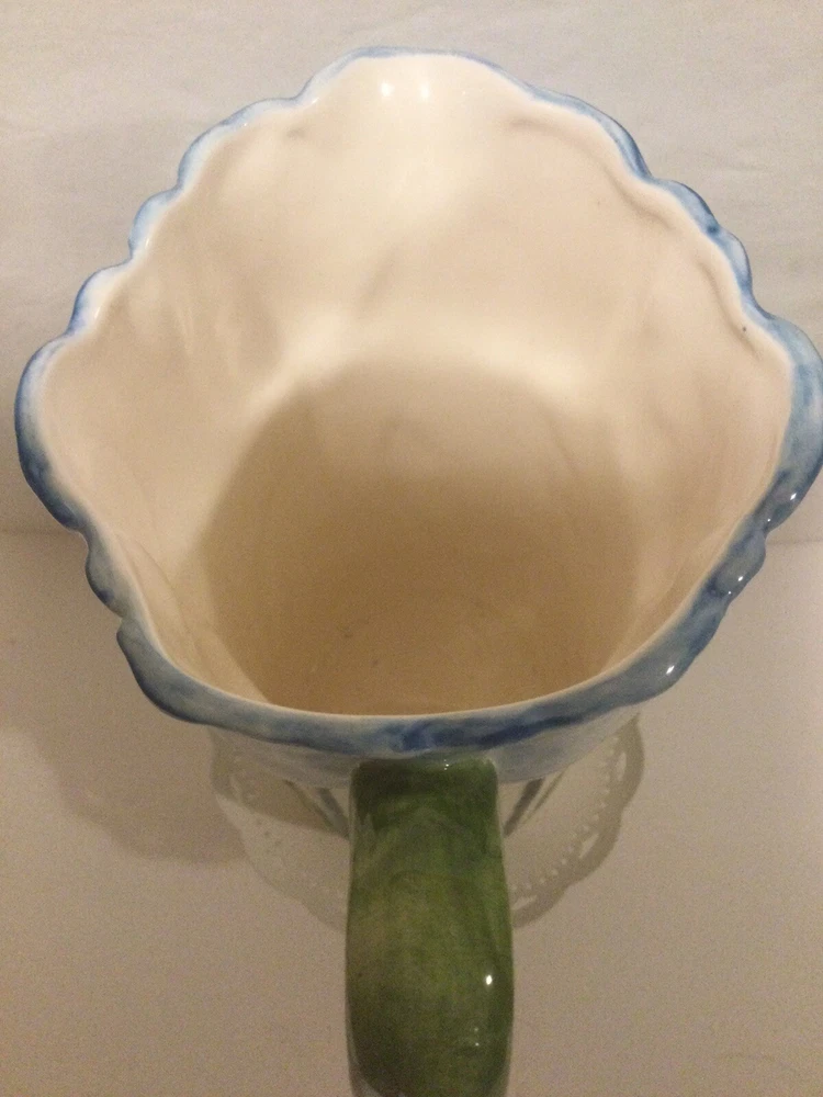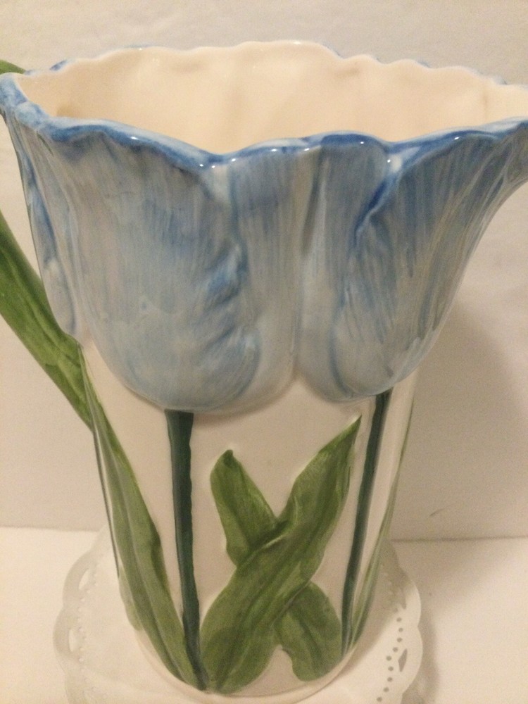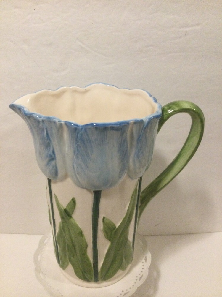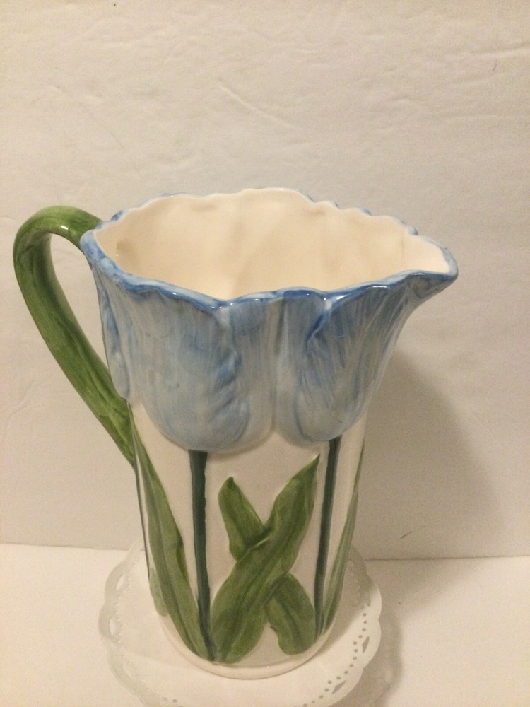 Beautiful Vintage Blue Tulip Raised Design Pitcher by Henriksen Imports Japan. In perfect vintage condition with no chips, cracks or crazing. Approx. 7.5” H x 3.5”D(at base). Please ask questions before bidding as this is a final sale. Thanks for looking!