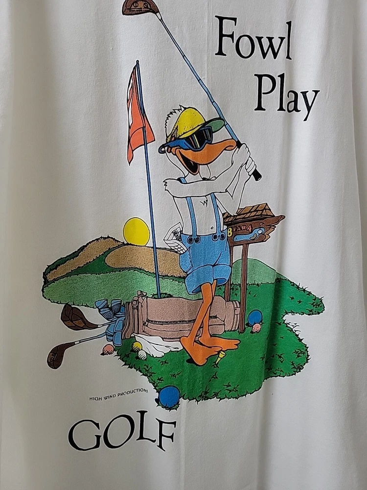Vintage High Wind Single Stitch Fowl Play Golf White T-Shirt XL Made In U.S.A. It has a couple of small stains. See photos of preowned condition. We combine shipping.
