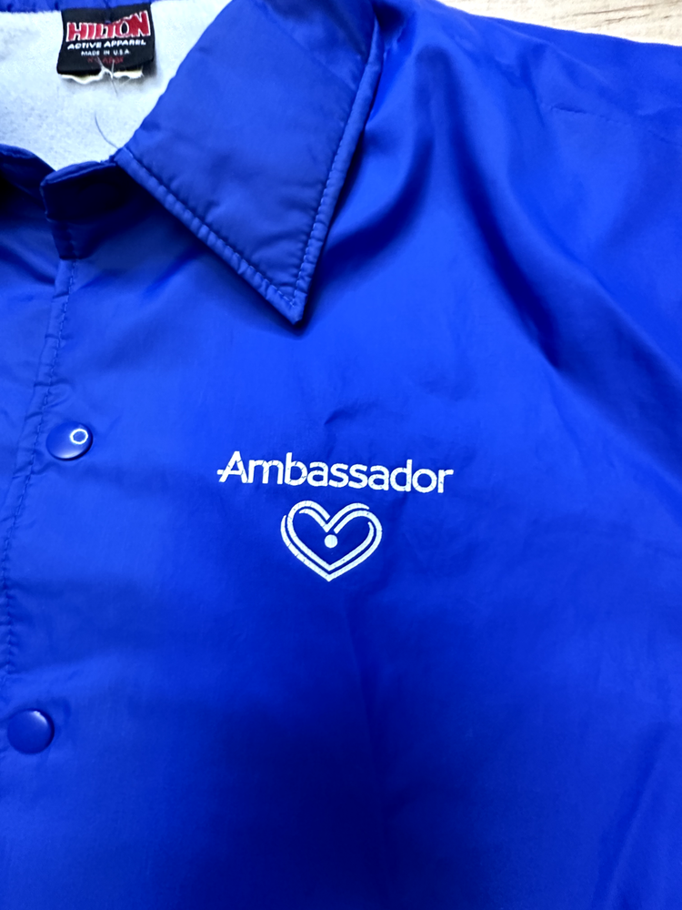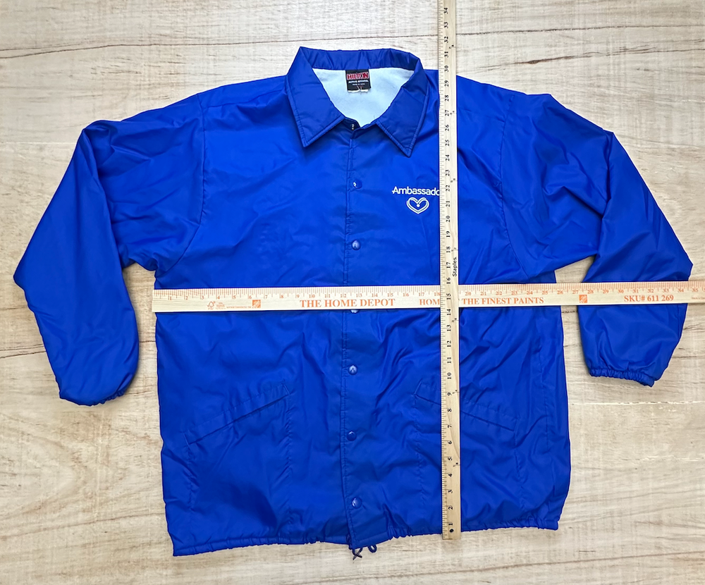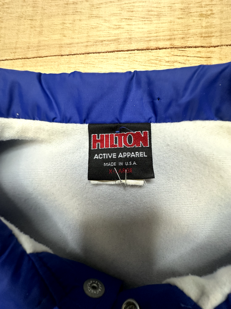 Elevate your wardrobe with the timeless style of the vintage Hilton Active Apparel Blue Jacket. Tailored for a comfortable XL fit, this mid-length bomber jacket is a versatile addition to any ensemble, seamlessly blending with your casual, travel, or workwear occasions. Its durable polyester outer shell, accented with tasteful embroidery, offers both a classic look and practicality. The jacket's thoughtful features include a warm, lightweight lining that ensures comfort across all seasons, from the brisk fall to the mild spring. It's also equipped with a wind-resistant property, multiple pockets for convenience, and is machine washable for easy care. The solid blue color provides a clean, sophisticated palette that complements any outfit, making it an essential piece for your personal collection. Size: XL Condition - Pre-Owned Good Please see photos for details and let us know if you have any questions. All items are shipped quickly and thank you for supporting a small business.