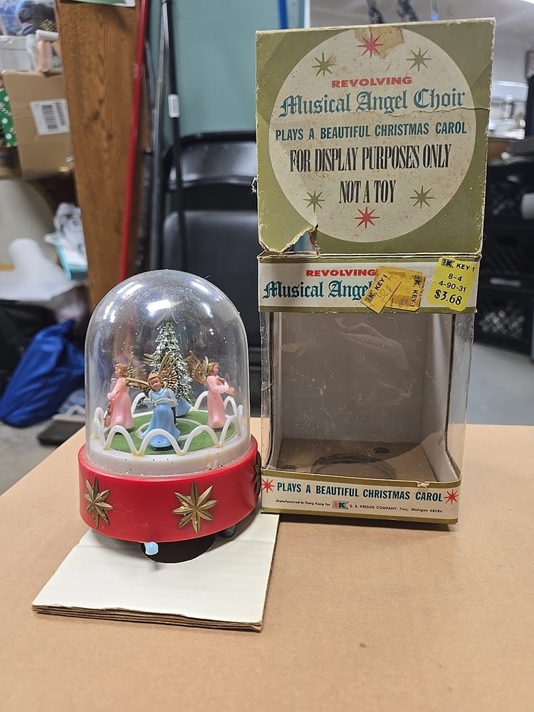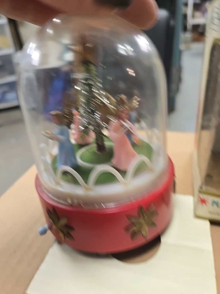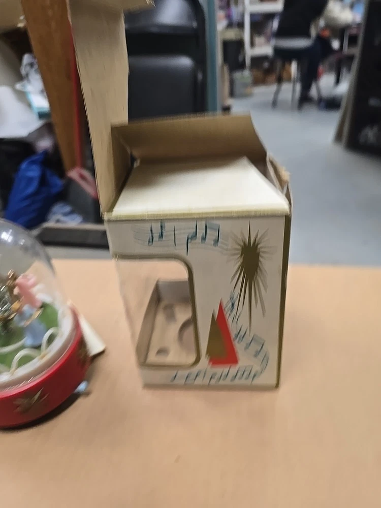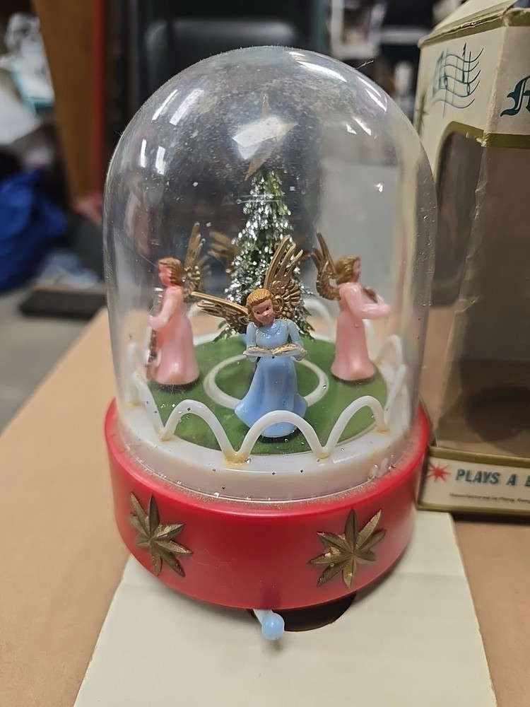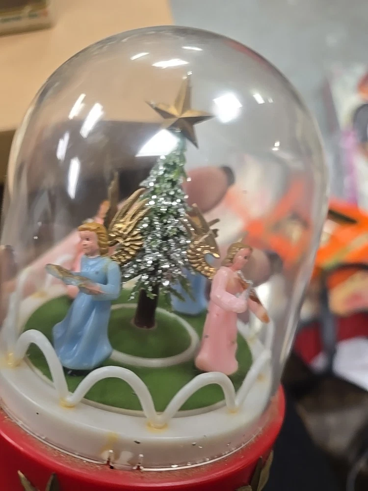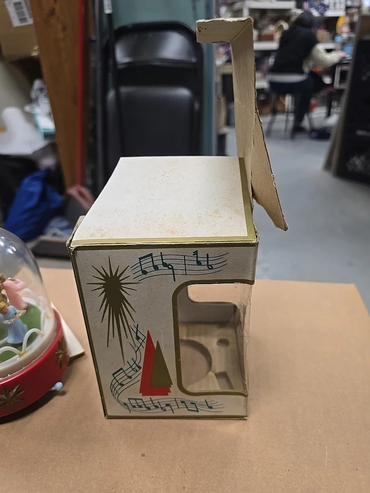 This vintage music box is a beautiful addition to any Christmas collection. The hard plastic choir features angels and a classic, all-over pattern. It has a wind-up power source and produces a lovely musical sound. The medium-sized piece is an original from the 1950s and was made in Hong Kong. The music box is a single item, and its features include being an original and having a musical aspect. It is a classic collectible that would make a great gift for any collector or lover of holiday figurines. In good used condition. The music part does not work. May be a simple fix. I did notice a few imperfections on rhe item and the box. No major issues. Please refer to all pictures and feel free to ask questions