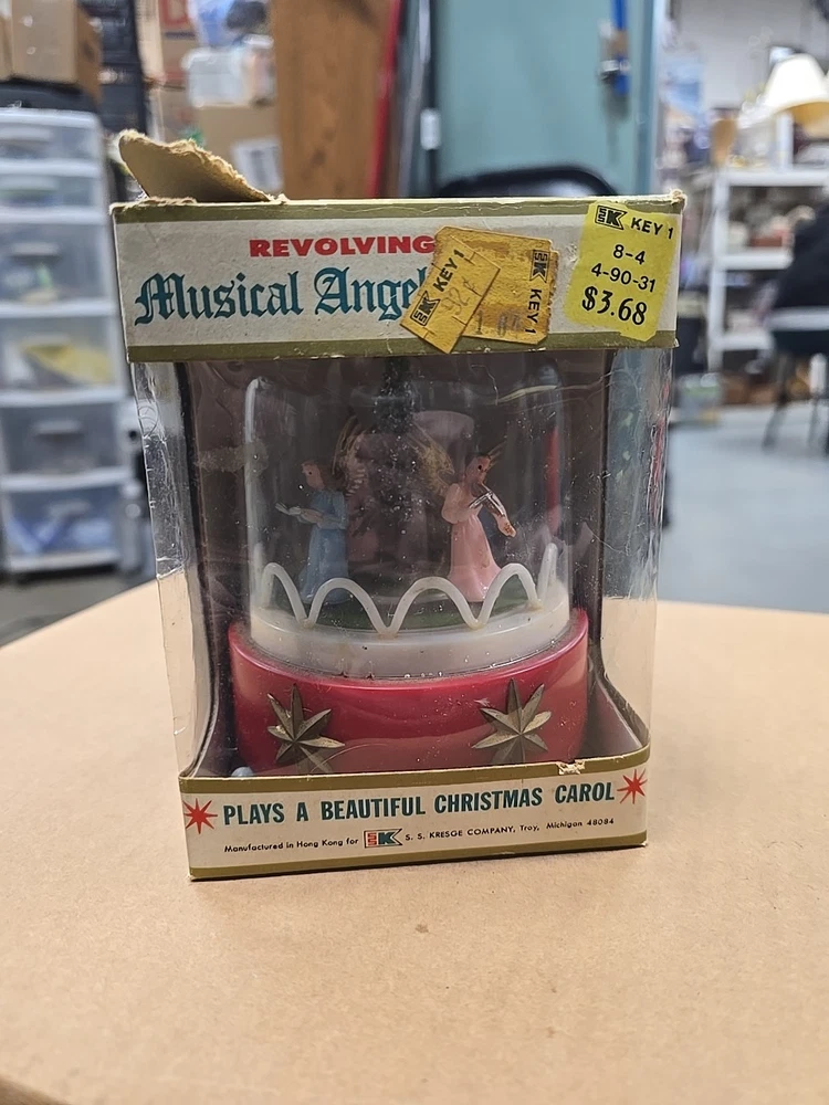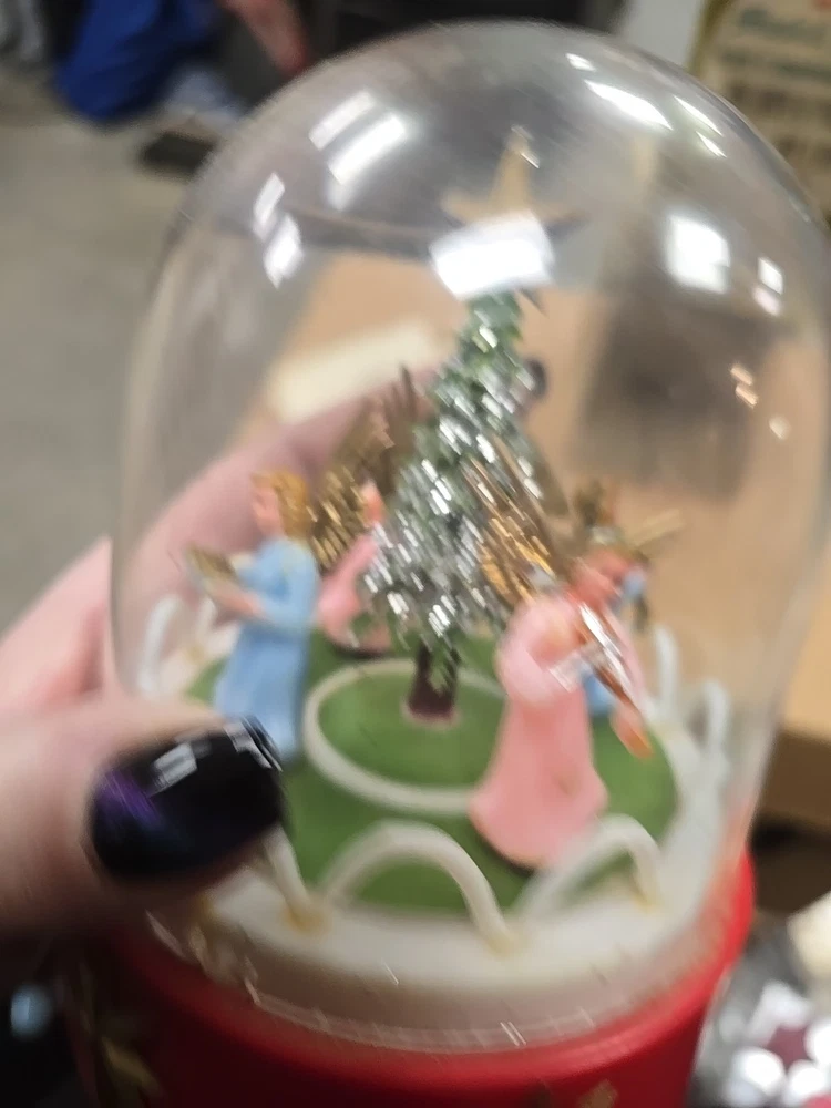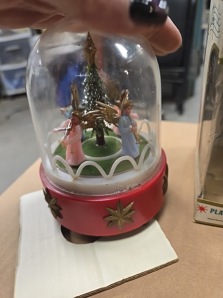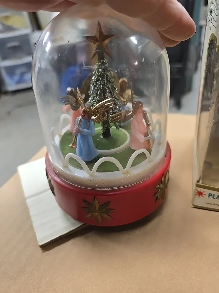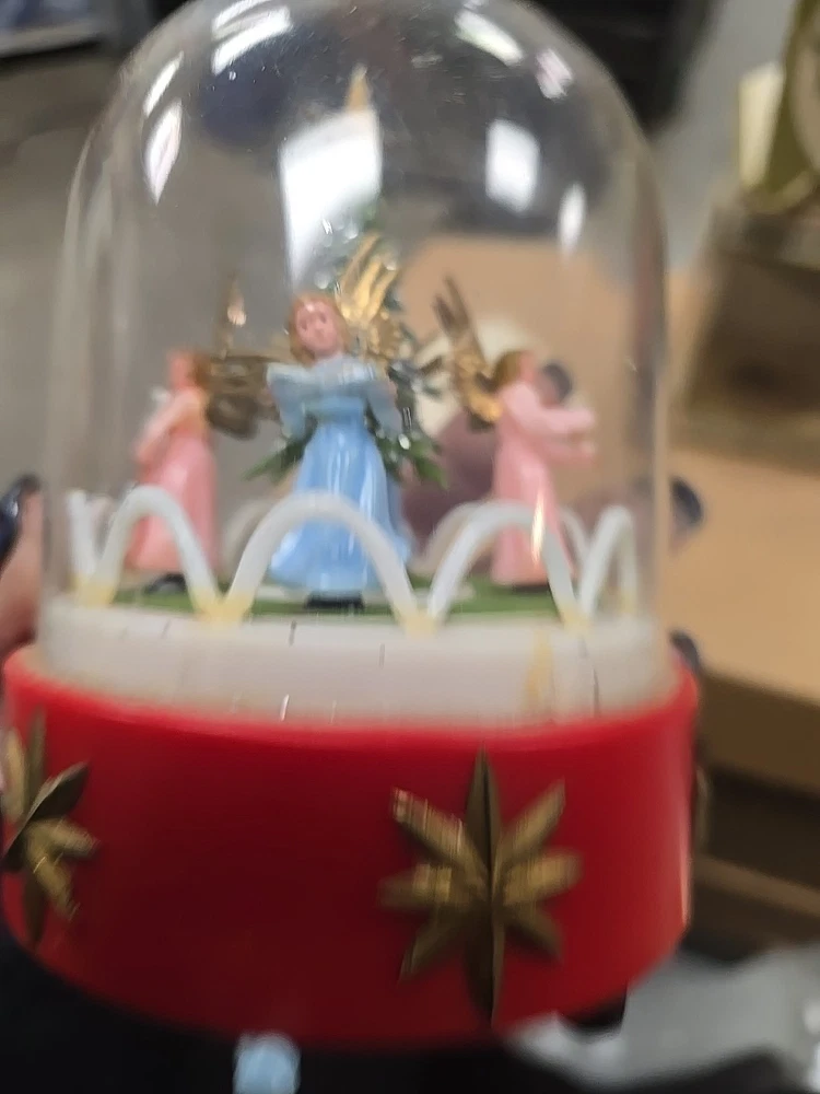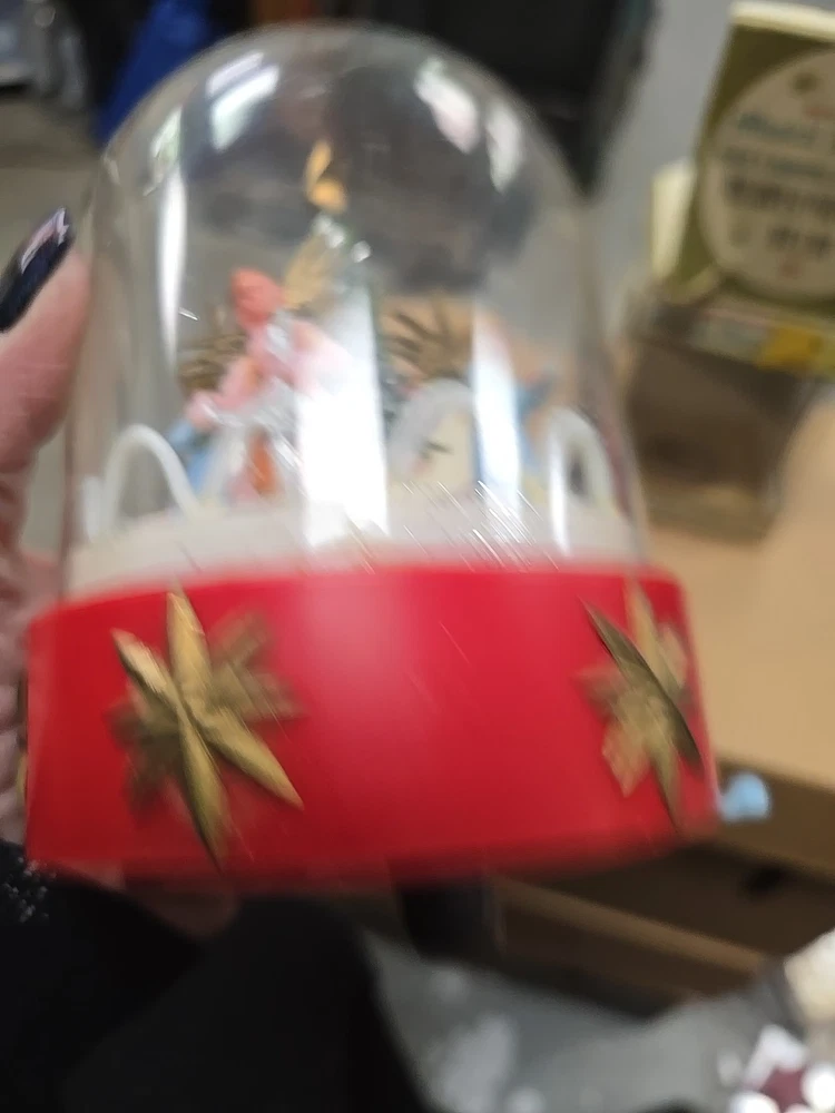 This vintage music box is a beautiful addition to any Christmas collection. The hard plastic choir features angels and a classic, all-over pattern. It has a wind-up power source and produces a lovely musical sound. The medium-sized piece is an original from the 1950s and was made in Hong Kong. The music box is a single item, and its features include being an original and having a musical aspect. It is a classic collectible that would make a great gift for any collector or lover of holiday figurines. In good used condition. The music part does not work. May be a simple fix. I did notice a few imperfections on rhe item and the box. No major issues. Please refer to all pictures and feel free to ask questions
