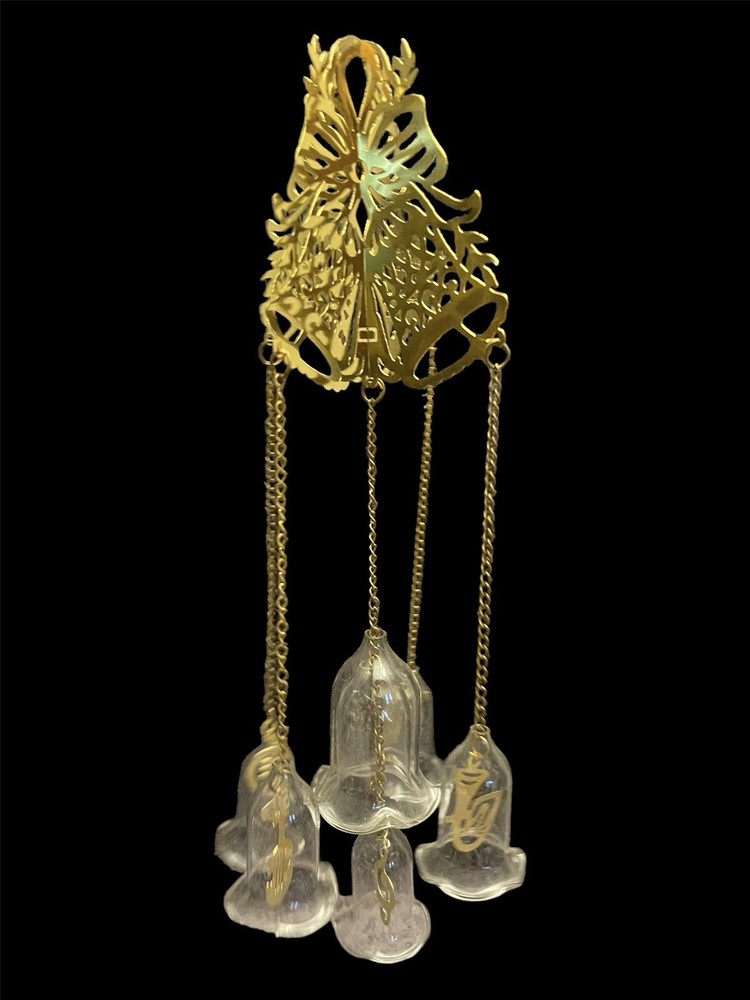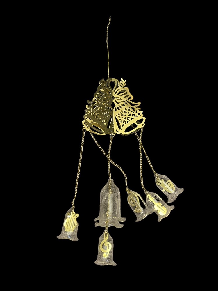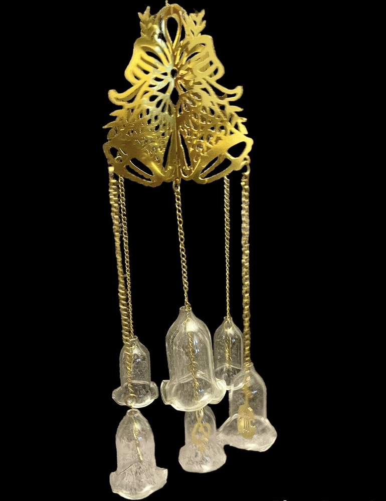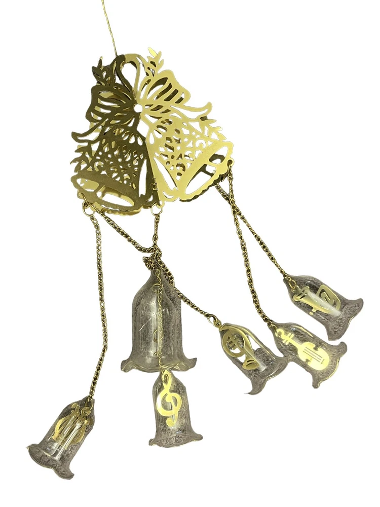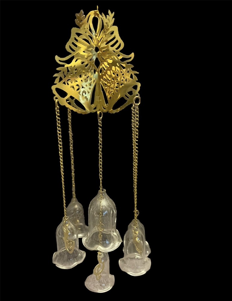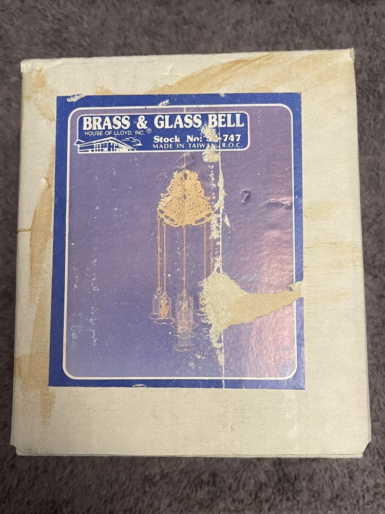 Vintage House Of Lloyd Glass & Brass Bell Wind Chime Christmas Mobil Instruments in its original box. There is one scratch on one of the lathers bells, please see pictures.