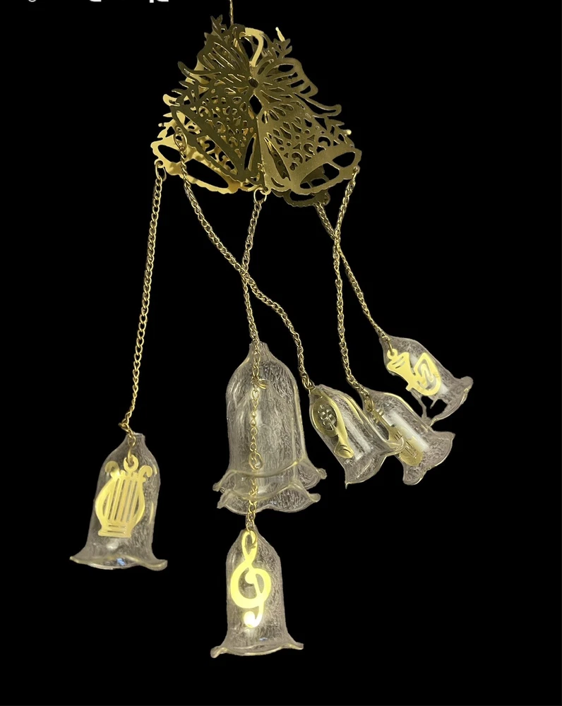 Vintage House Of Lloyd Glass & Brass Bell Wind Chime Christmas Mobil Instruments in its original box. There is one scratch on one of the lathers bells, please see pictures....