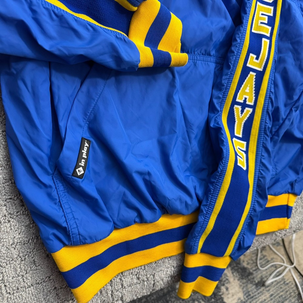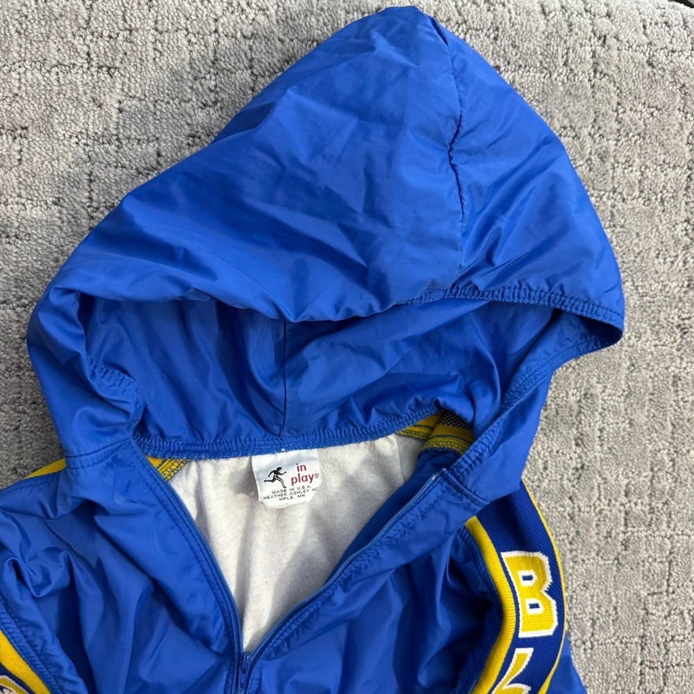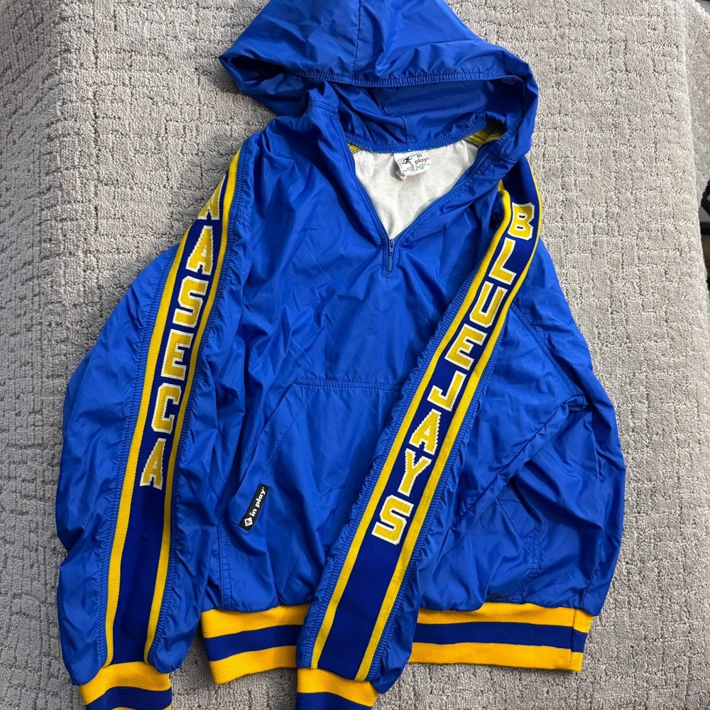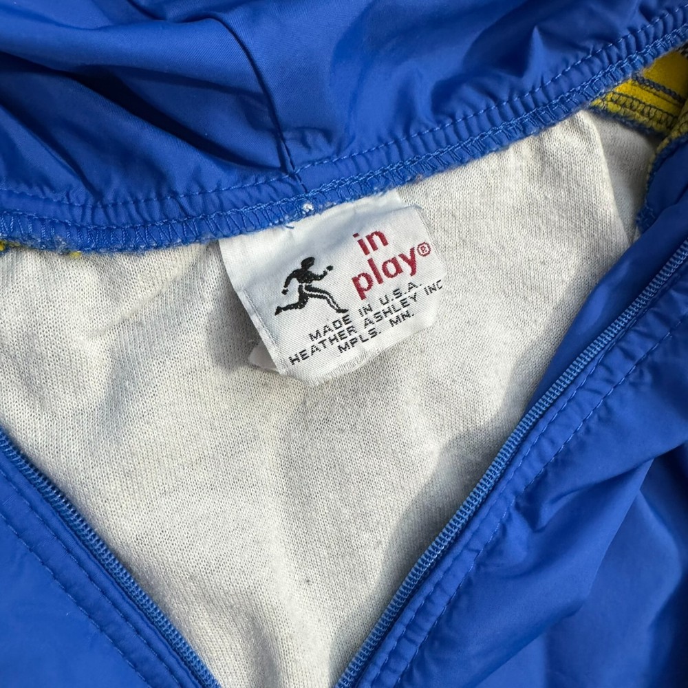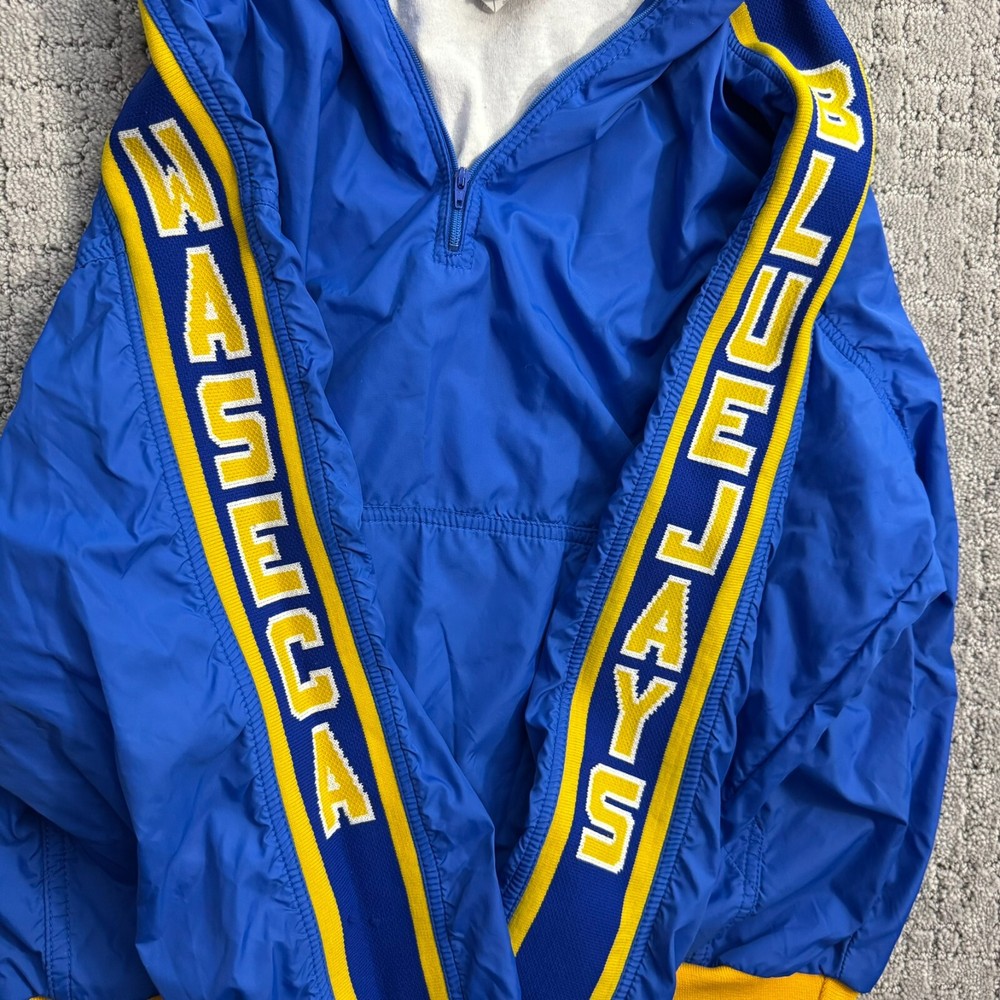 Rare vintage Waseca Bluejays varsity-style windbreaker jacket. Features royal blue base with yellow and white chenille varsity patches spelling "WASECA" and "BLUE JAYS" down the sleeves. Half-zip pullover design with hood, kangaroo pocket, and striped yellow/blue ribbed cuffs and waistband. Made in USA by Heather Ashley Inc. (In Play brand). Soft lightweight shell with cotton/poly blend lining. Details: Size: Large Color: Royal Blue with Yellow/White stripes Material: Shell (likely nylon), Lining (cotton/poly blend) Made in USA Pullover half-zip with hood Kangaroo front pocket Elastic waistband and cuffs Good pre-owned vintage condition. No rips or stains. Minor vintage wear adds to authentic character.