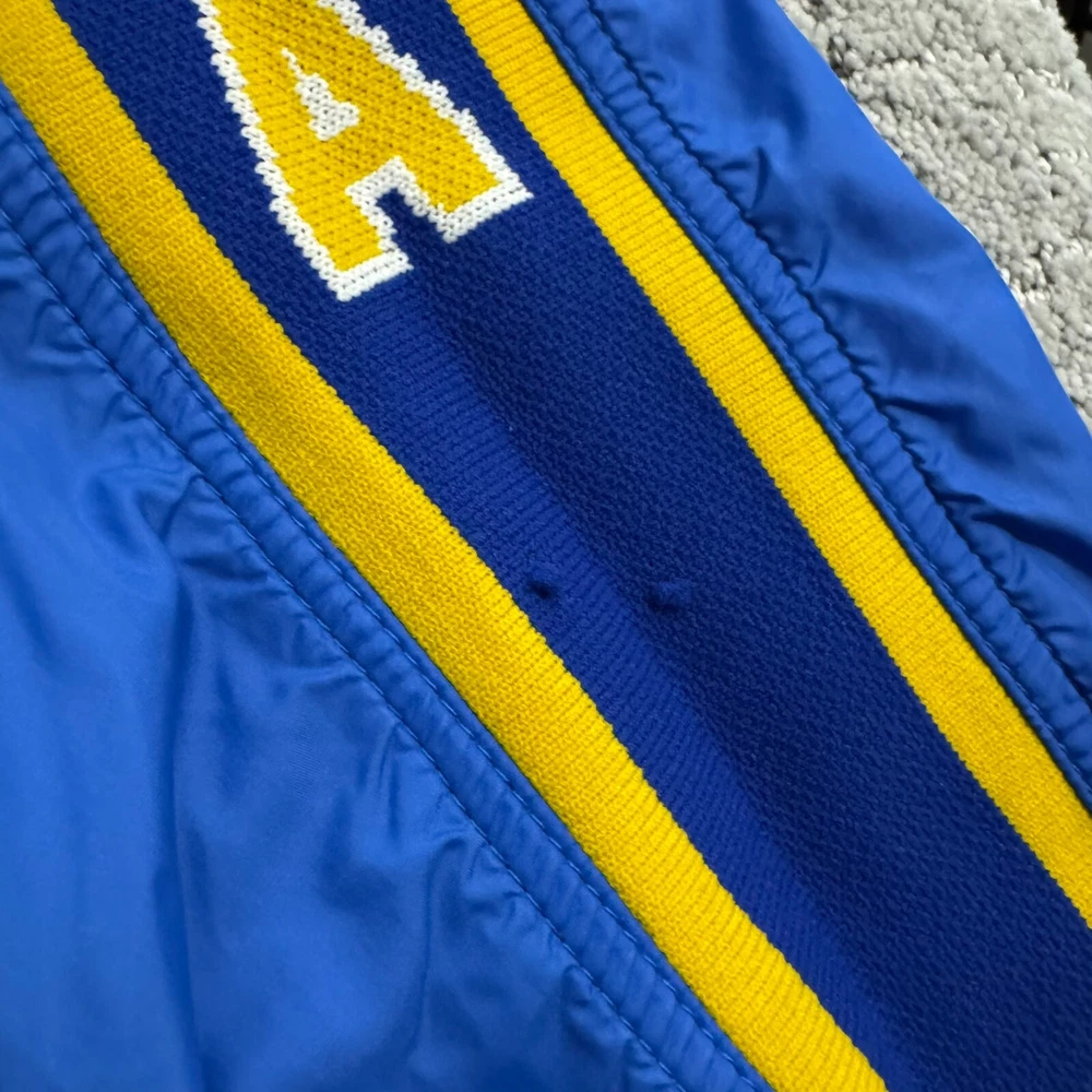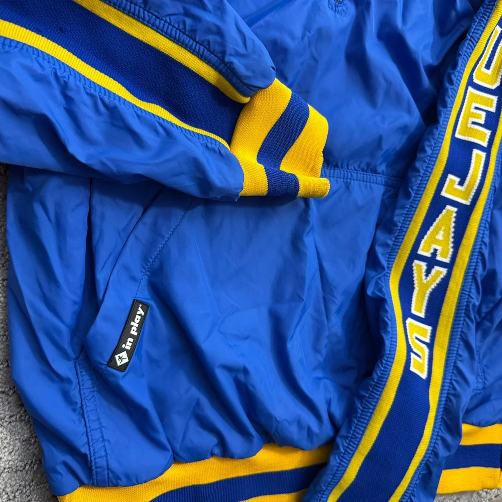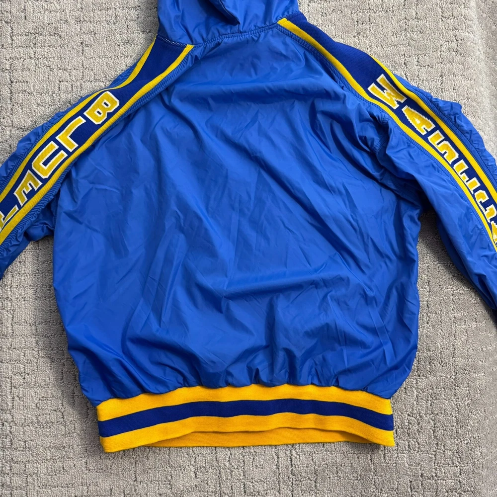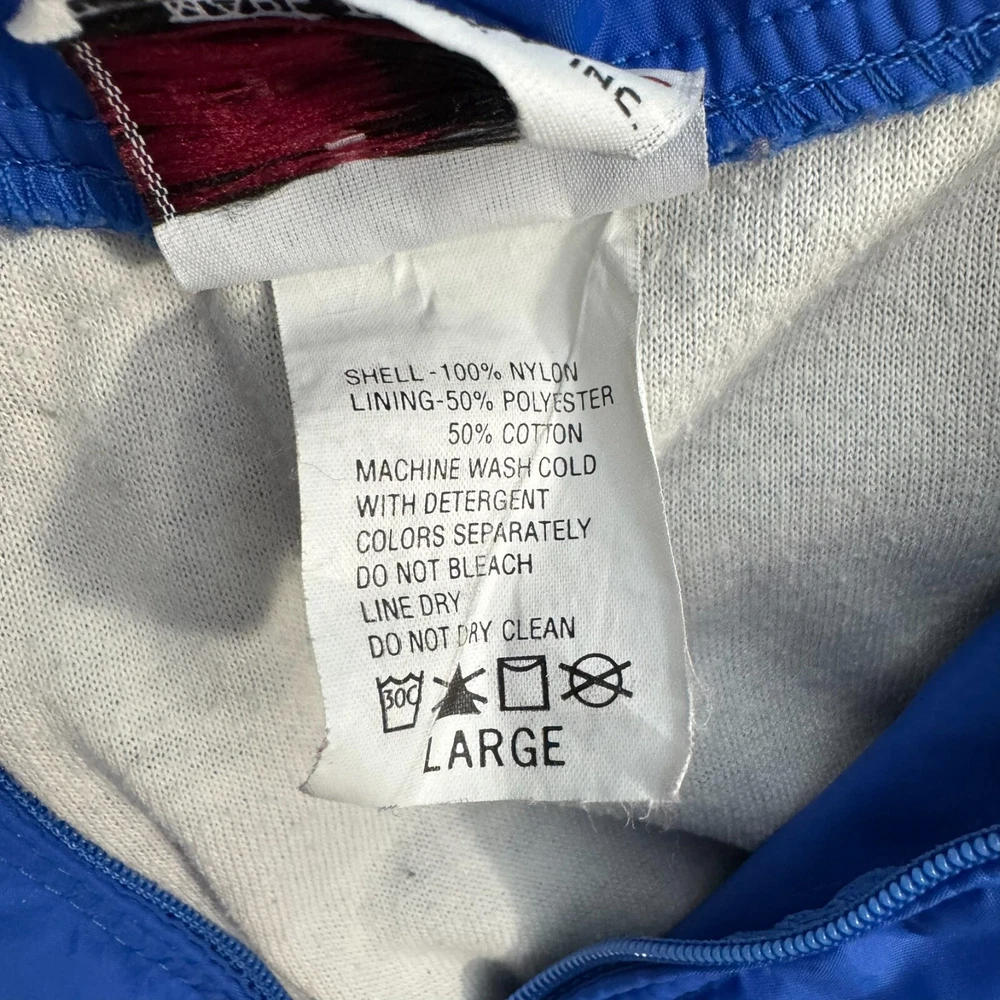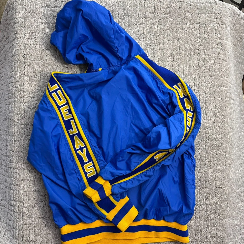 Rare vintage Waseca Bluejays varsity-style windbreaker jacket. Features royal blue base with yellow and white chenille varsity patches spelling "WASECA" and "BLUE JAYS" down the sleeves. Half-zip pullover design with hood, kangaroo pocket, and striped yellow/blue ribbed cuffs and waistband. Made in USA by Heather Ashley Inc. (In Play brand). Soft lightweight shell with cotton/poly blend lining. Details: Size: Large Color: Royal Blue with Yellow/White stripes Material: Shell (likely nylon), Lining (cotton/poly blend) Made in USA Pullover half-zip with hood Kangaroo front pocket Elastic waistband and cuffs Good pre-owned vintage condition. No rips or stains. Minor vintage wear adds to authentic character.
