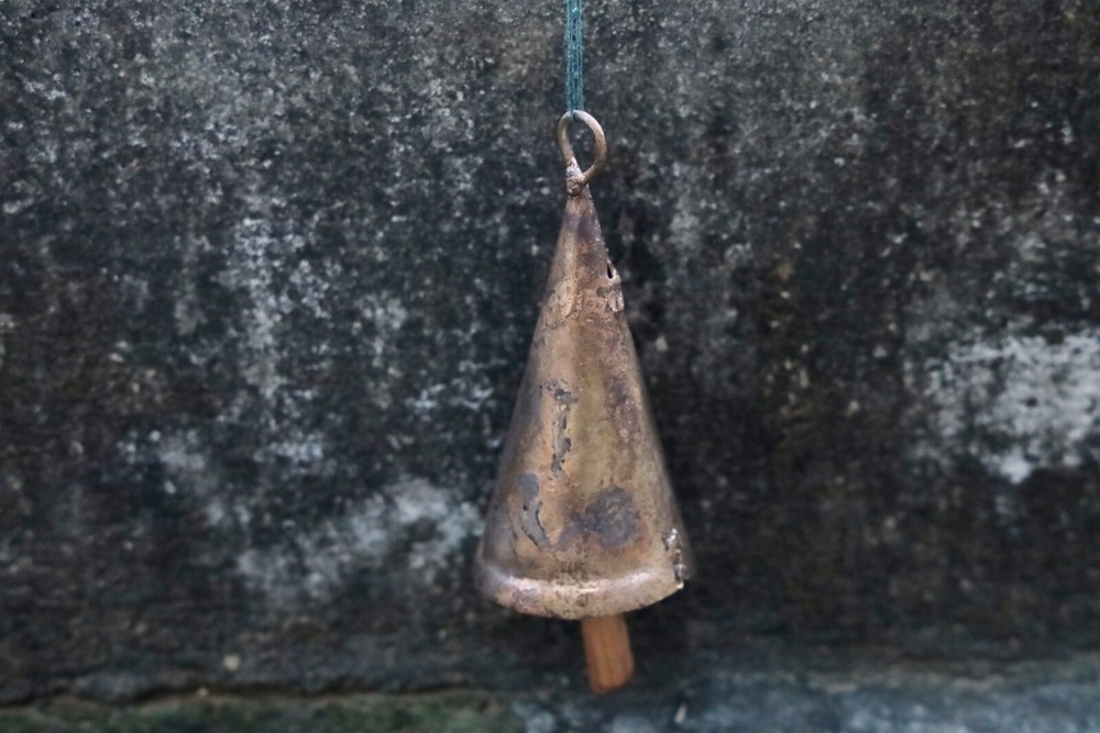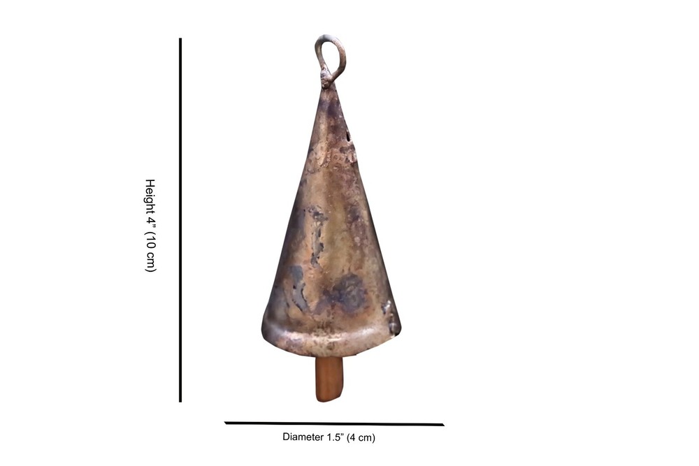 Bell Size Triangle Bell - 4 Inches with a wooden clapper (Please see the uploaded Dimension image) It is a unique combination of recycled copper and iron, which lends the sweet sonorous sound to this handmade bell's unique decor. Bring home these handcrafted, recycled metal gold bell wind chimes for boho wall decor of your living room, bedroom, or porch. Use them to add festivity to every occasion. Their eclectic beauty and alluring bells charms make them the perfect gift for housewarming, baby showers, New Year’s parties, Easter, Christmas, Thanksgiving, and valentine's day. Revel in the sweet sound of the harmony of the gold bell garland. Each pendulum is hand carved from reclaimed wood making this piece a true example of sustainability and eco-friendliness. Make sure your guests never miss the special touch that goes into making your house a home! These hanging craft bells made by artisans in India will be the central attraction of every celebration. Hang them inside your home or right outside on your balcony or door frame. They are bound to receive all the compliments from your guests this year, and for all the years to come. The vintage look of the farmhouse rustic bell is long-lasting as the metal is sustainable and tolerant towards changes in temperature and humidity. Bask in the beauty of exclusive handcrafted hanging decor for years since they demand minimal maintenance and care.