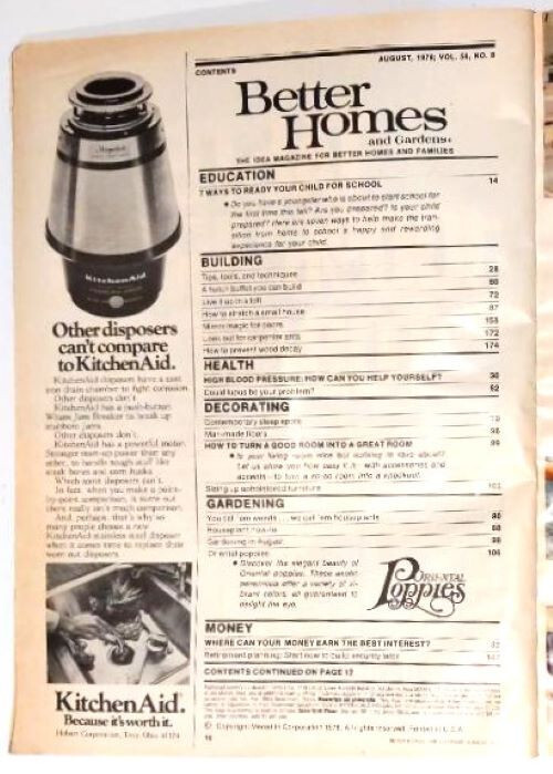 Better Homes & Gardens magazine, published by the Meredith Corporation, offers home design, food and entertaining, garden, and lifestyle topics. Issues from this era bring a fascinating insight into 1970s homelife and culture, including lots of bell bottoms and cigarette ads. This August 1978 issue has 206 pages and measures 8 by 11½ inches. This vintage publication has slightly yellowed pages but is otherwise in excellent condition.