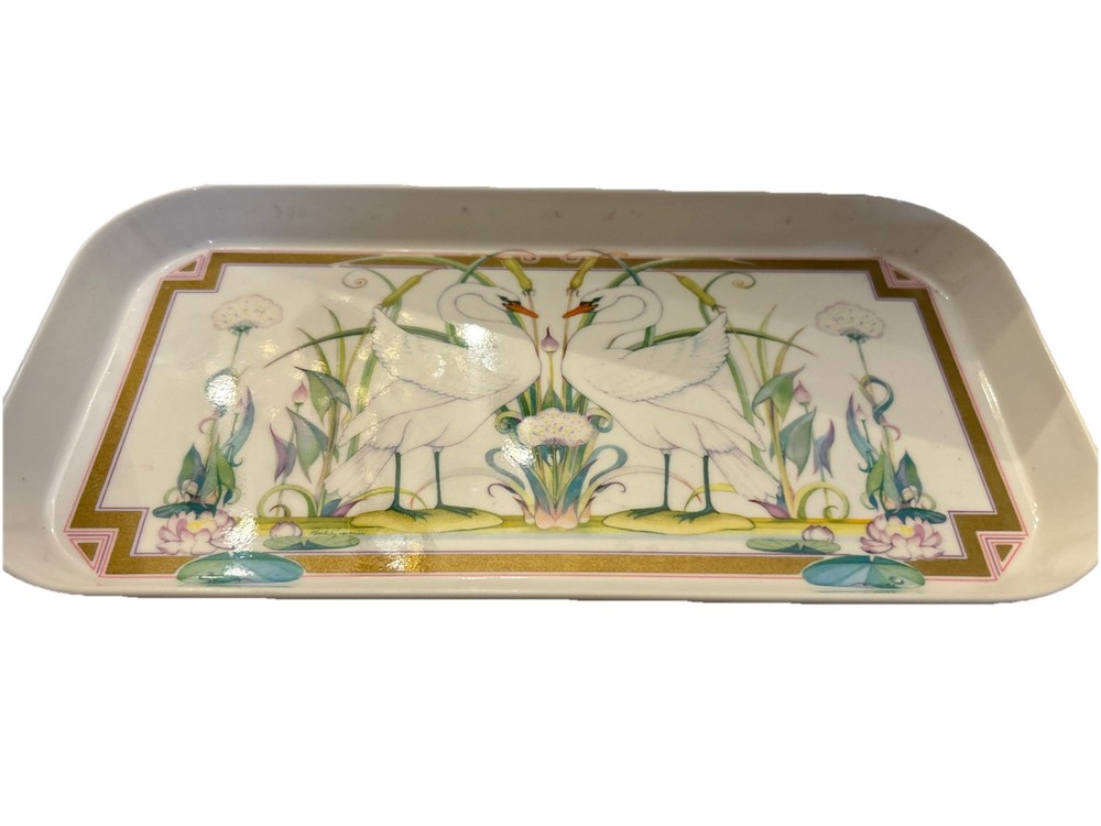 Add a touch of Italian vintage charm to your home with this beautiful melamine tray. The rectangular shape and glossy finish make it perfect for serving drinks or appetizers on any occasion. The tray features a stunning floral and foliage pattern with two swans, adding a romantic touch to your decor. Crafted in Italy, this durable tray is made of high-quality melamine material, making it perfect for everyday use. It measures 11x6 inches and has one compartment, making it easy to serve your favorite dishes. The tray is unboxed and weighs only 7 ounces, making it easy to store and transport.