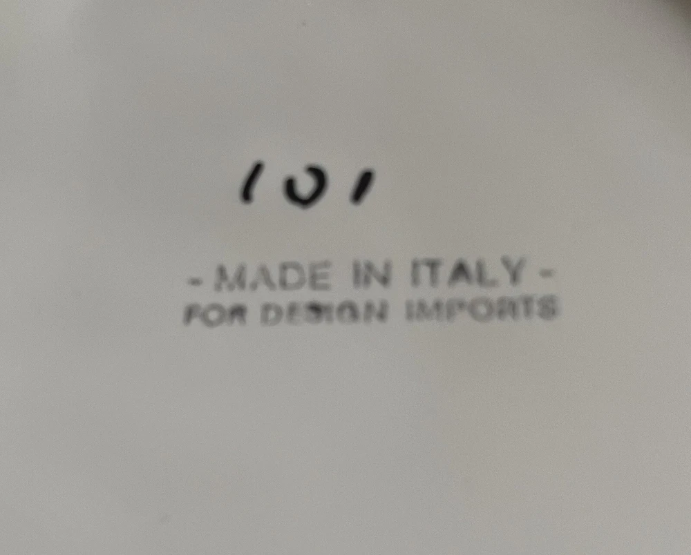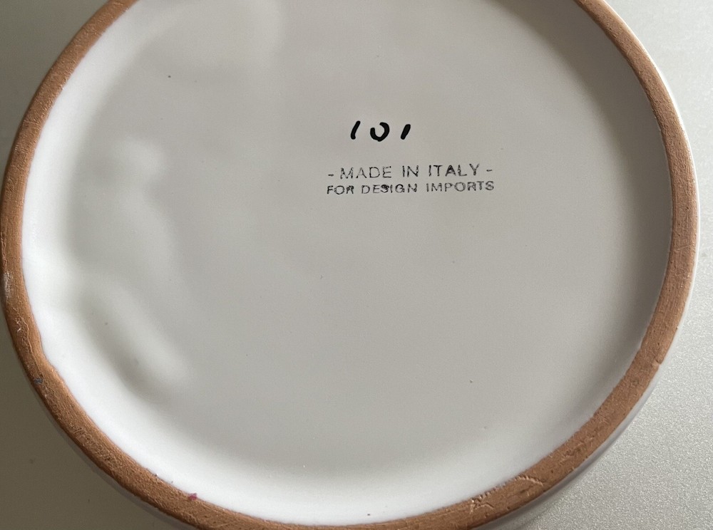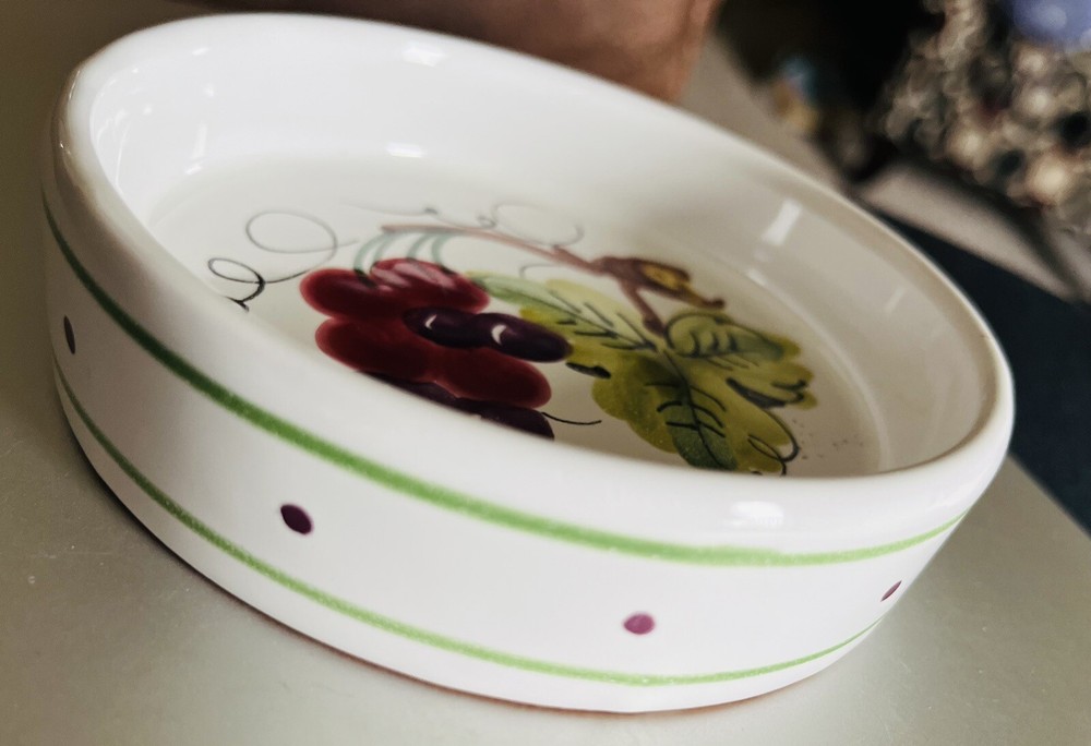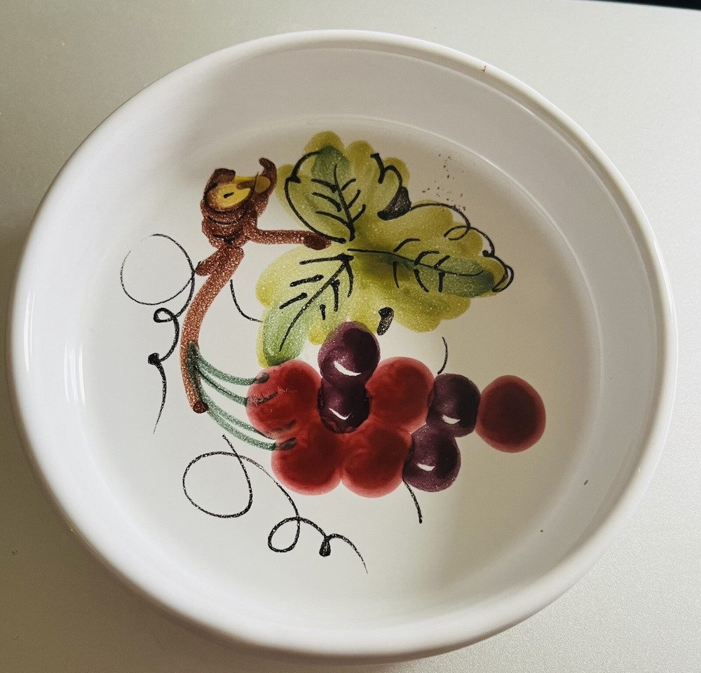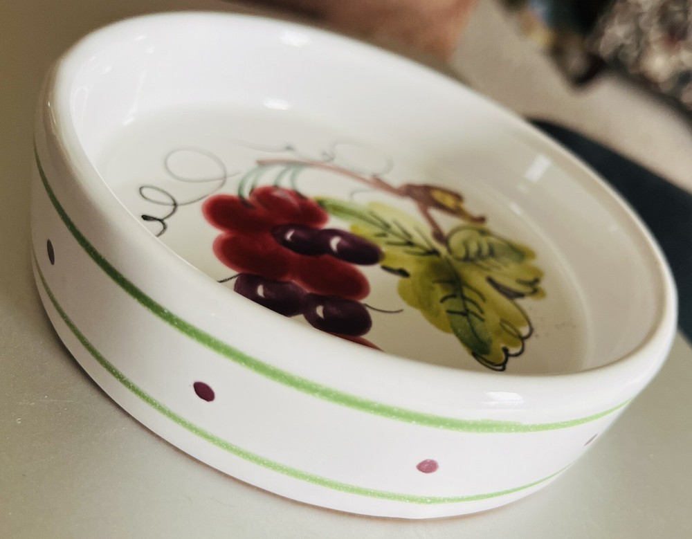 Add a touch of vintage charm to your home decor with this beautiful Italian trinket dish. Crafted by hand with art pottery production style, this round dish features a stunning pattern of grapes and vines. The glossy finish and multicolor design make it a perfect decorative piece for all occasions.Measuring 4 3/16th inches in length, width, and diameter, and 1 1/4 inch in height, this one-piece trinket dish is perfect for storing small items. It is recommended to hand wash only for care instructions. This original piece from the late 20th century (1970-1999) is a must-have for any vintage/retro enthusiast.