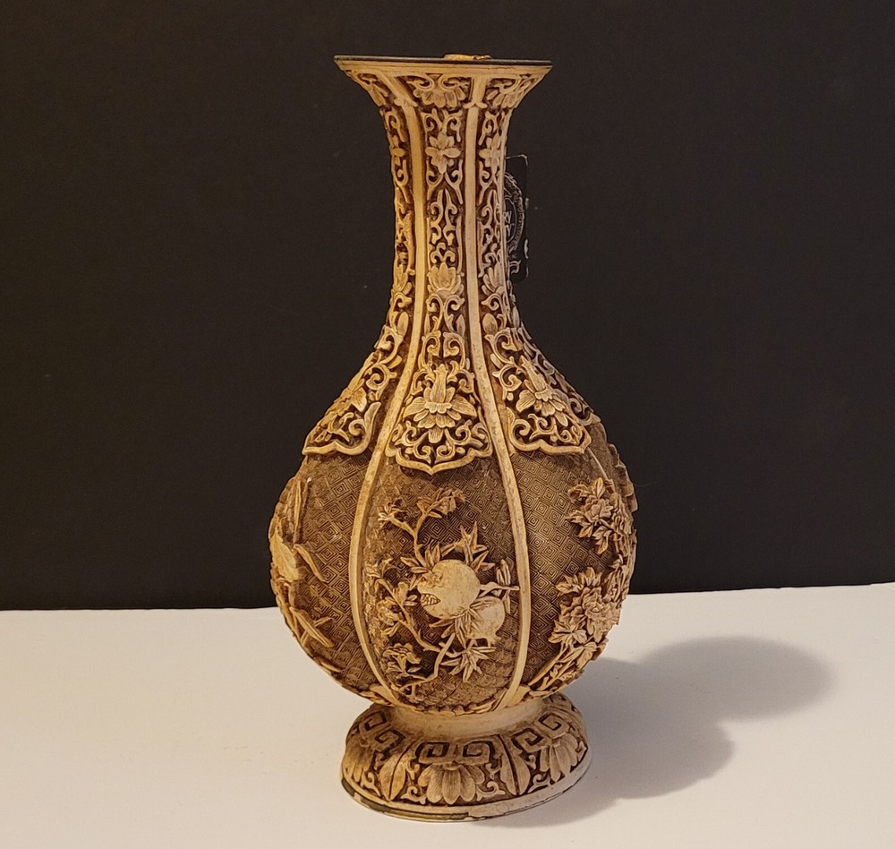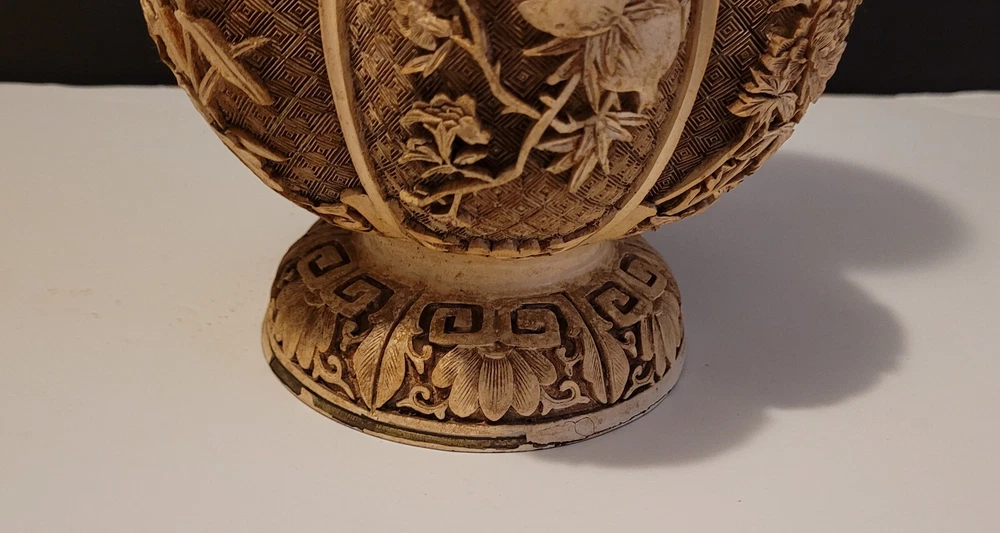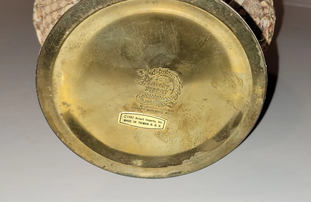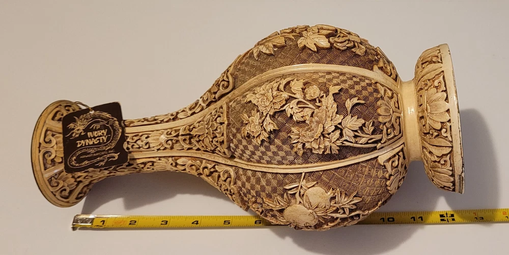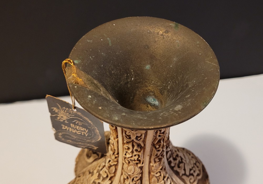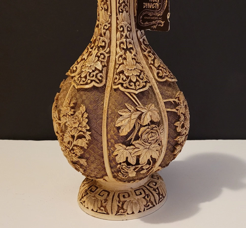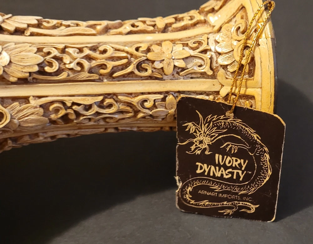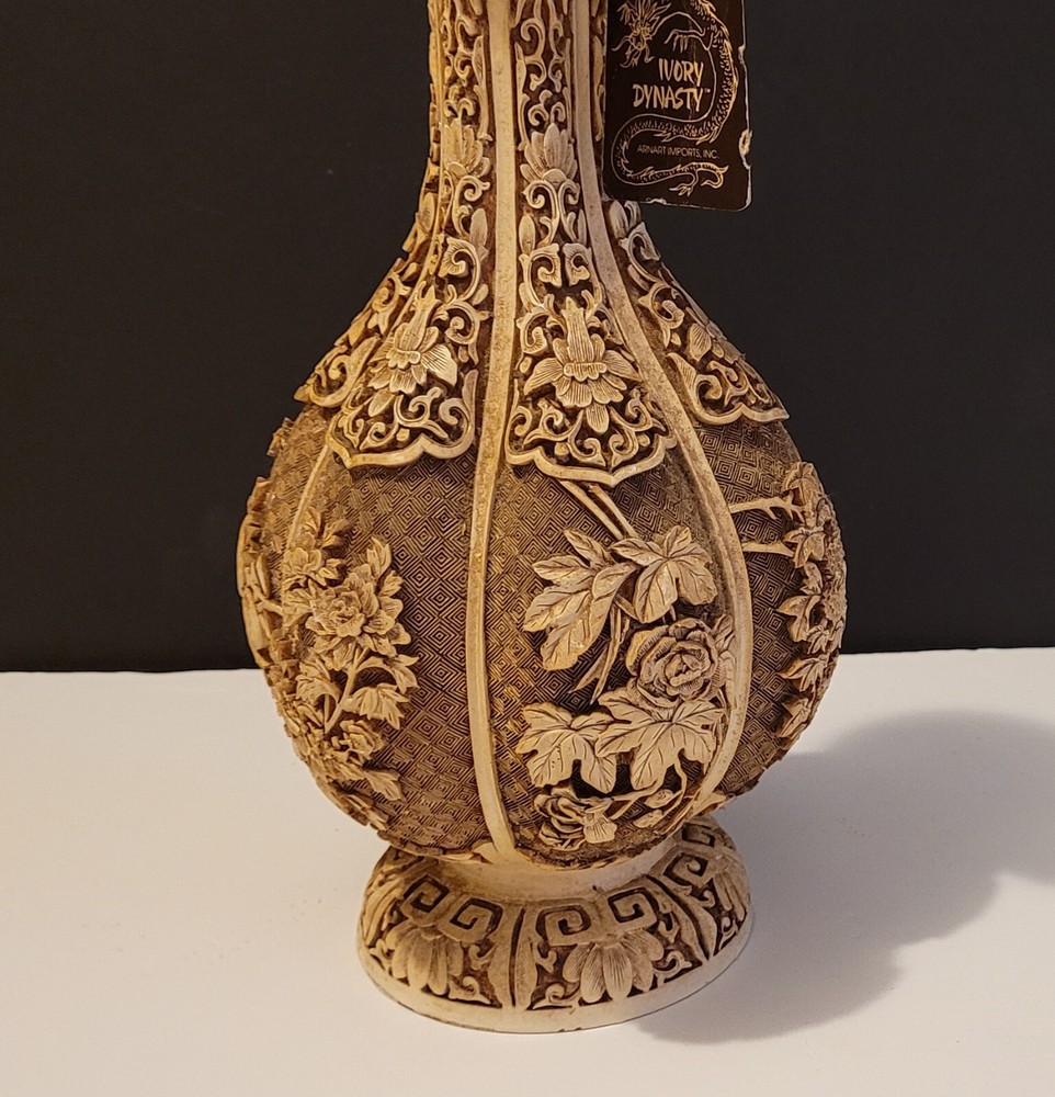 Here is a vintage 1982 Ivory Dynasty decorative vase by Arnart Imports. Has a floral design. Made of resin over brass. Measures approx. 12-1/2" tall and 6-1/4" across. In good vintage condition with some cracked missing resin and patina. If you are buying more than 1 item in order to get combined shipping you must wait for an invoice. Just let me know when you are finished shopping then you can request an invoice with combined shipping. Do not pay until you are finished shopping. Please keep in mind what vintage, used, pre-owned means. Your item will not be new. There will be signs of use, wear or fading. Maybe not as much as you expected or maybe more. My opinion may differ from yours. If you are in doubt as to the condition of anything I sell please please ask. Paypal is the ONLY form of payment accepted. Payment must be received within 3 days. If that is a problem, contact me and we can probably work something out. But you must communicate. I am only shipping within the United States. Please note : I use recycled boxes a lot of the time. My goal is safe delivery of your items, not presentation. If this bothers you let me know ahead of time so I can try and find an alternative.