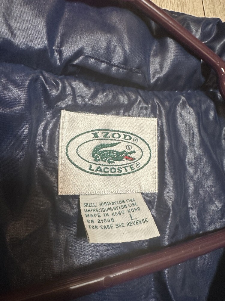 This vintage Izod Lacoste bomber jacket is a stylish and classic outerwear piece for men. Made of nylon softshell material in a solid blue color, it features a zip closure, embroidered logo accents, and a packable hood. The windbreaker is designed with a retro hipster vibe, perfect for casual occasions in all seasons, offering water and wind resistance. With a size large fit and a range of features like zipped pockets and quick-dry fabric, this jacket embodies a mix of 80s and 90s style with a preppy touch. See photos for condition. All zippers work properly.