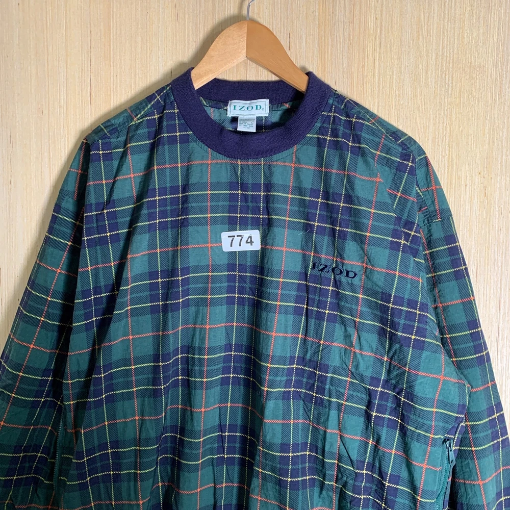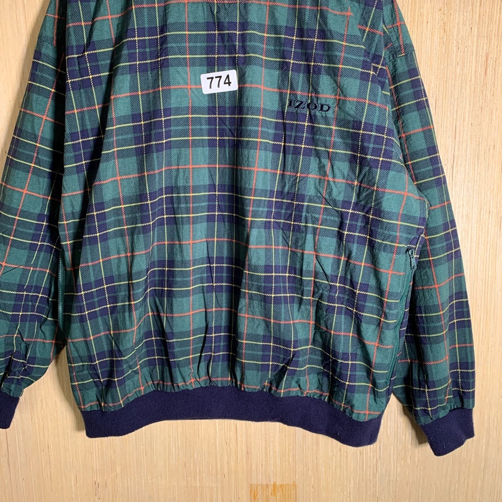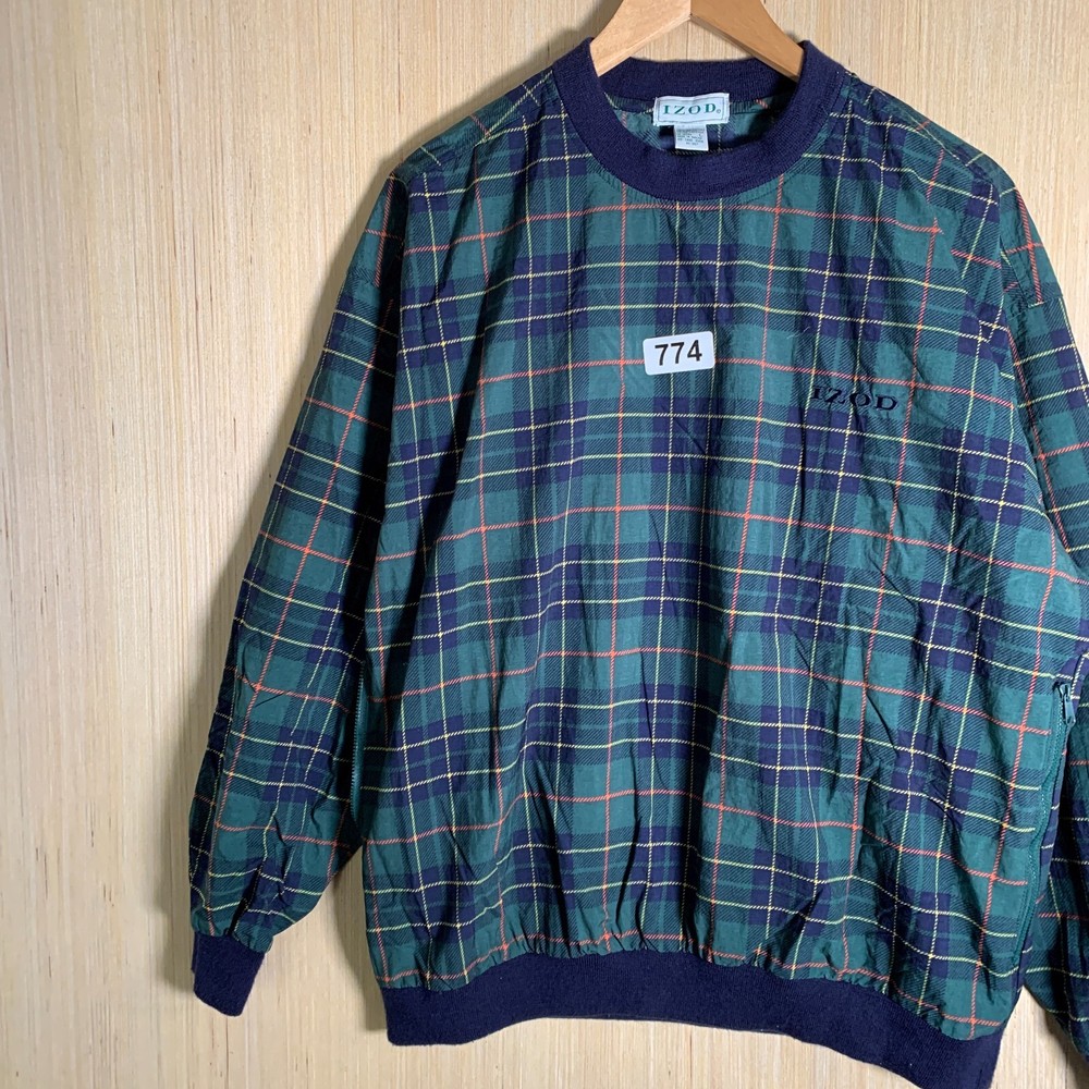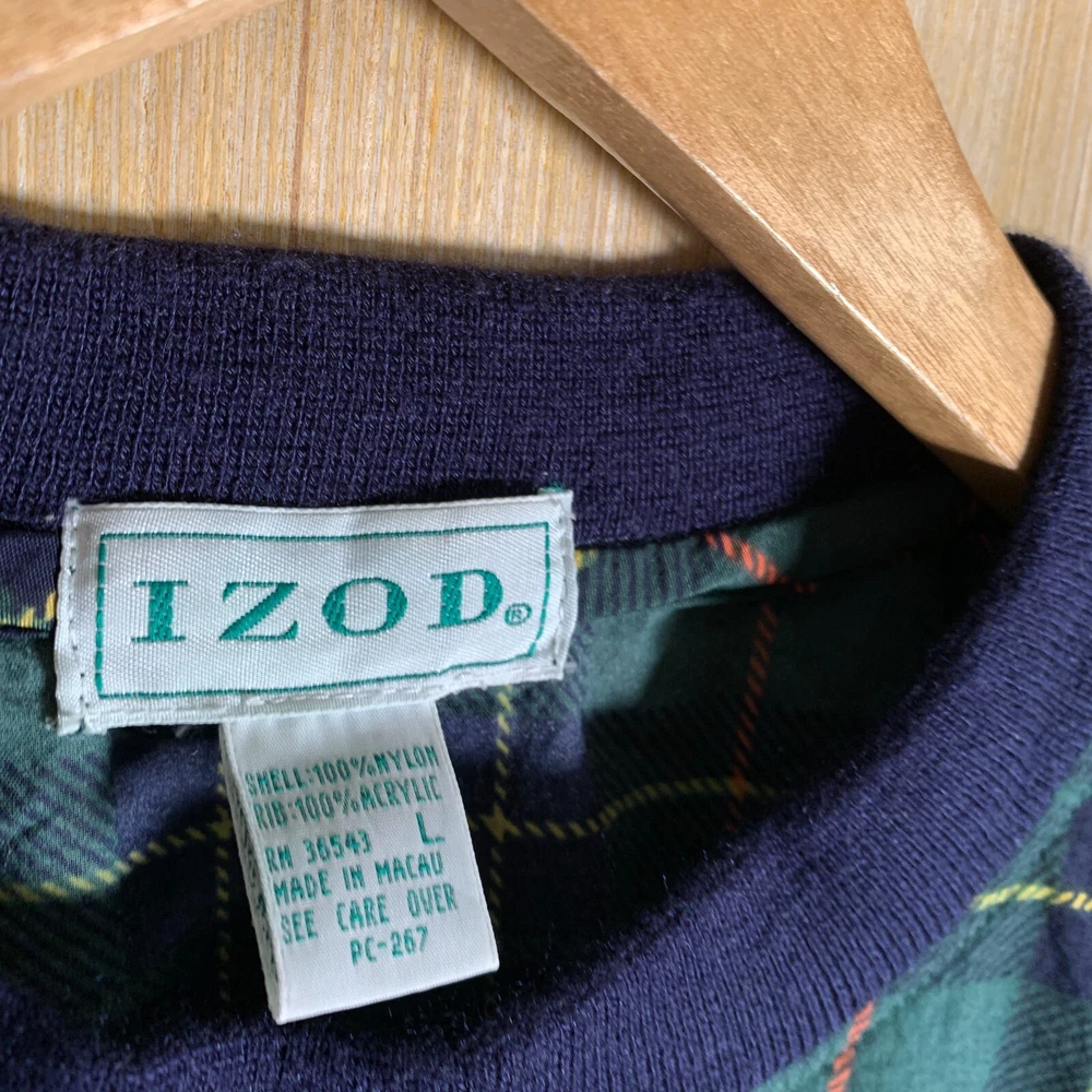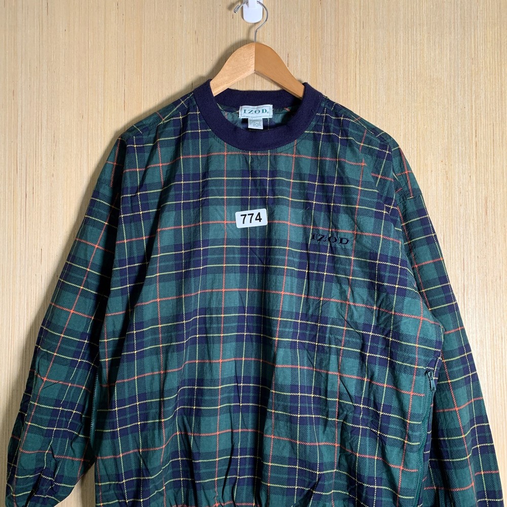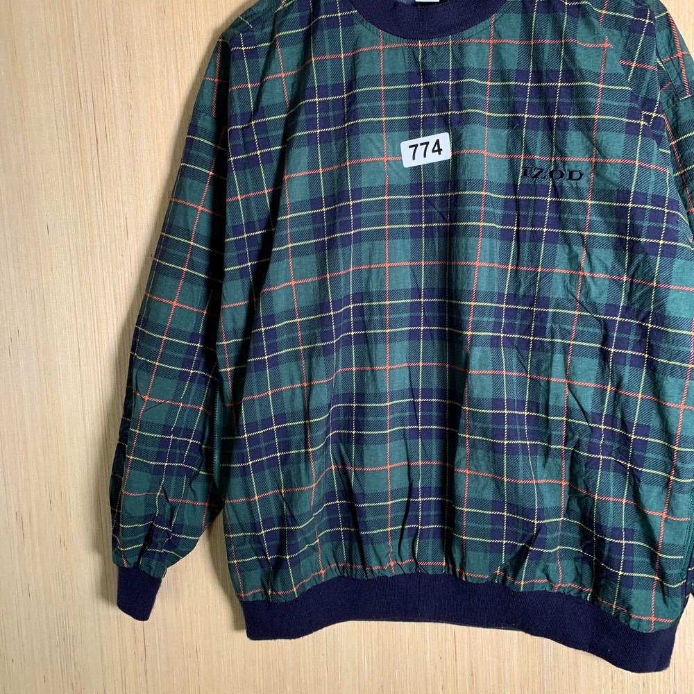The Vintage Izod Wind Breaker is a green long-sleeved men's pullover jacket made of polyester with a nylon lining. It features a solid pattern, zip, button, and snap closure, and embroidered accents with the Izod logo. The windbreaker has a vintage 90s hip-hop theme and is suitable for all seasons. It is available in size L and has a regular fit. The jacket is easy to care for and preshrunk.