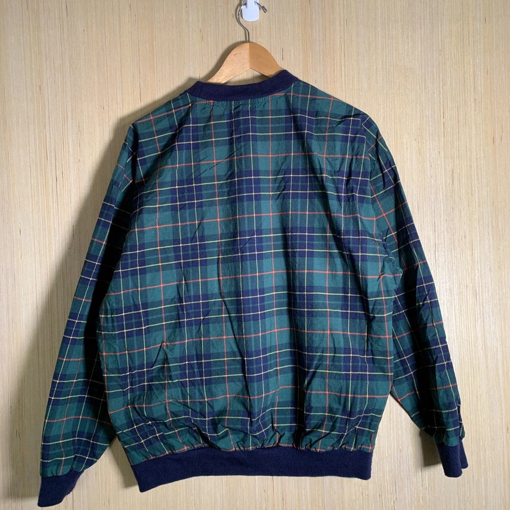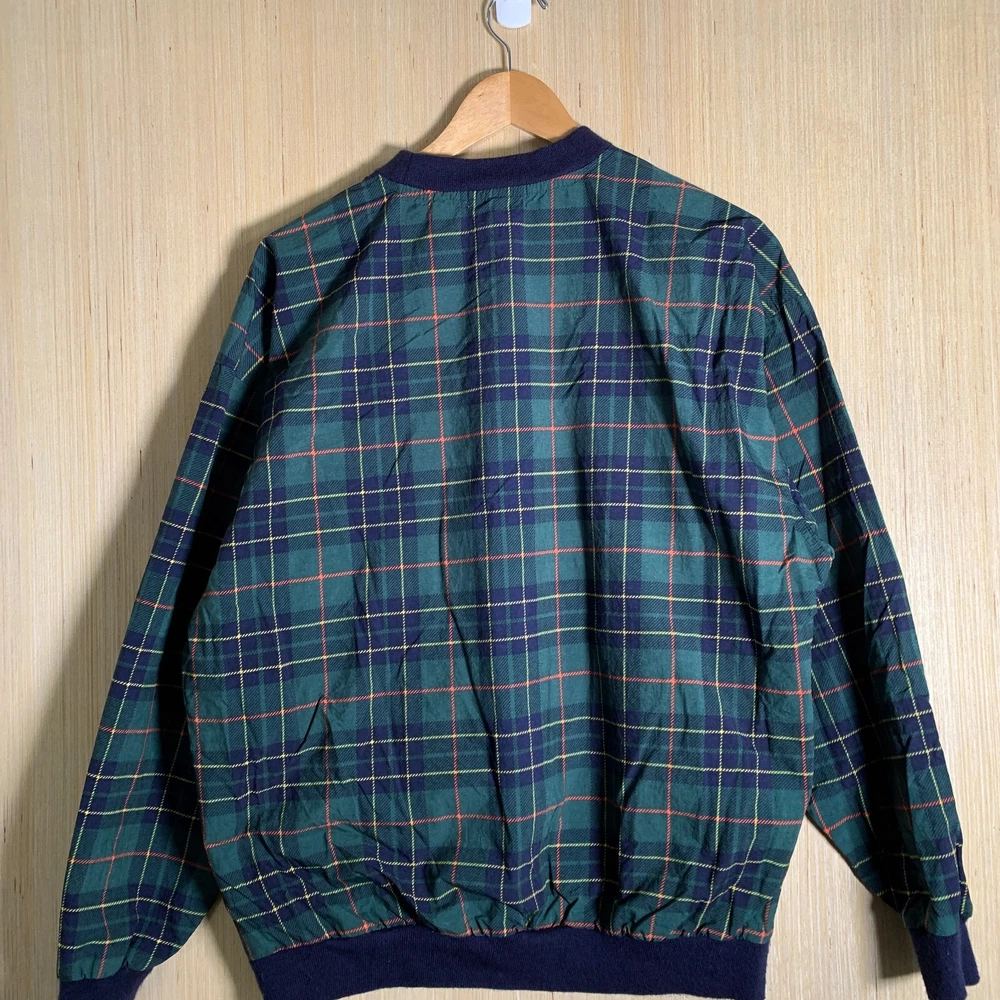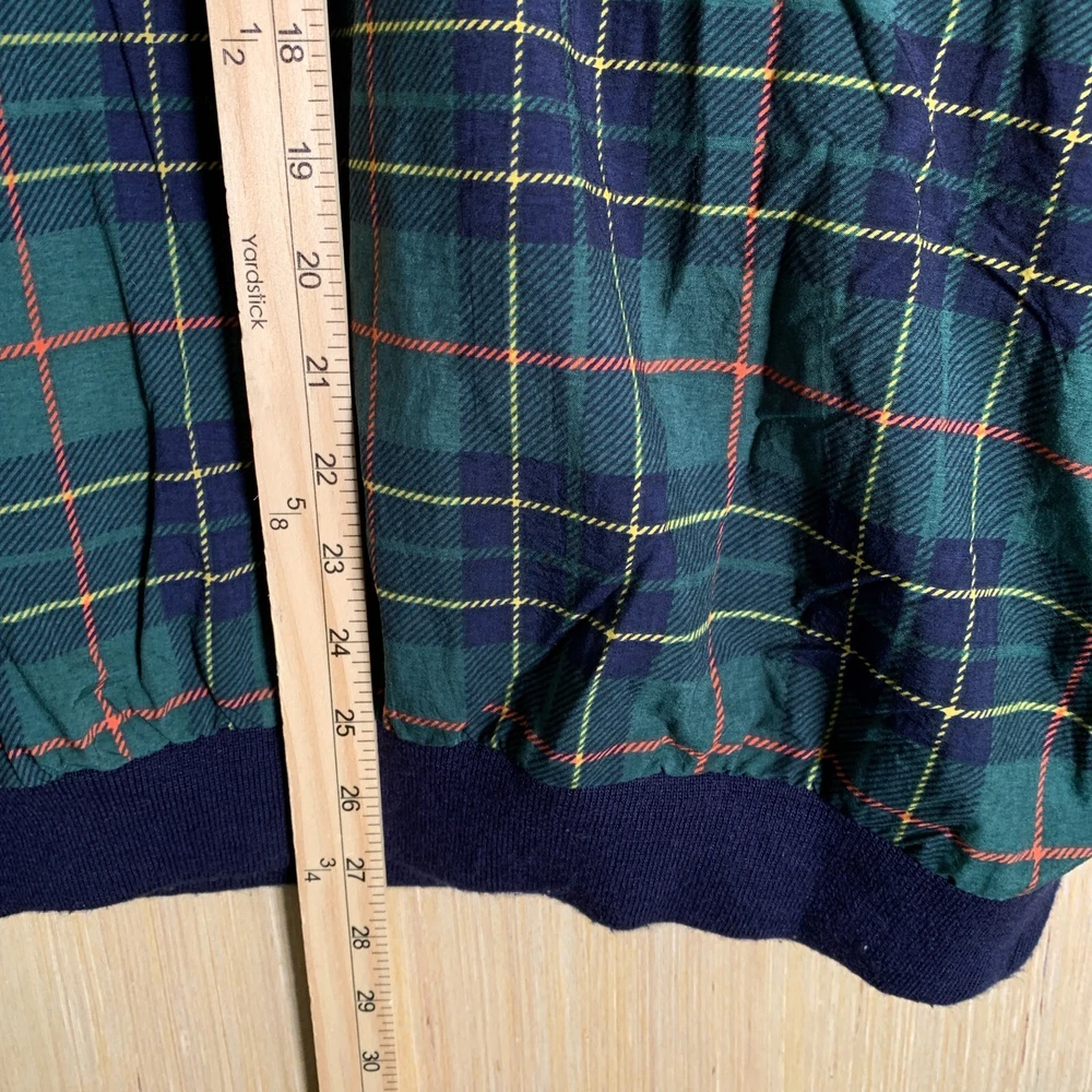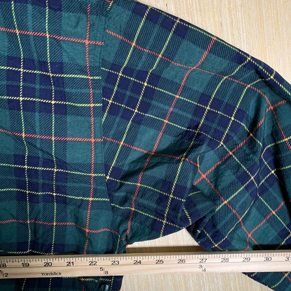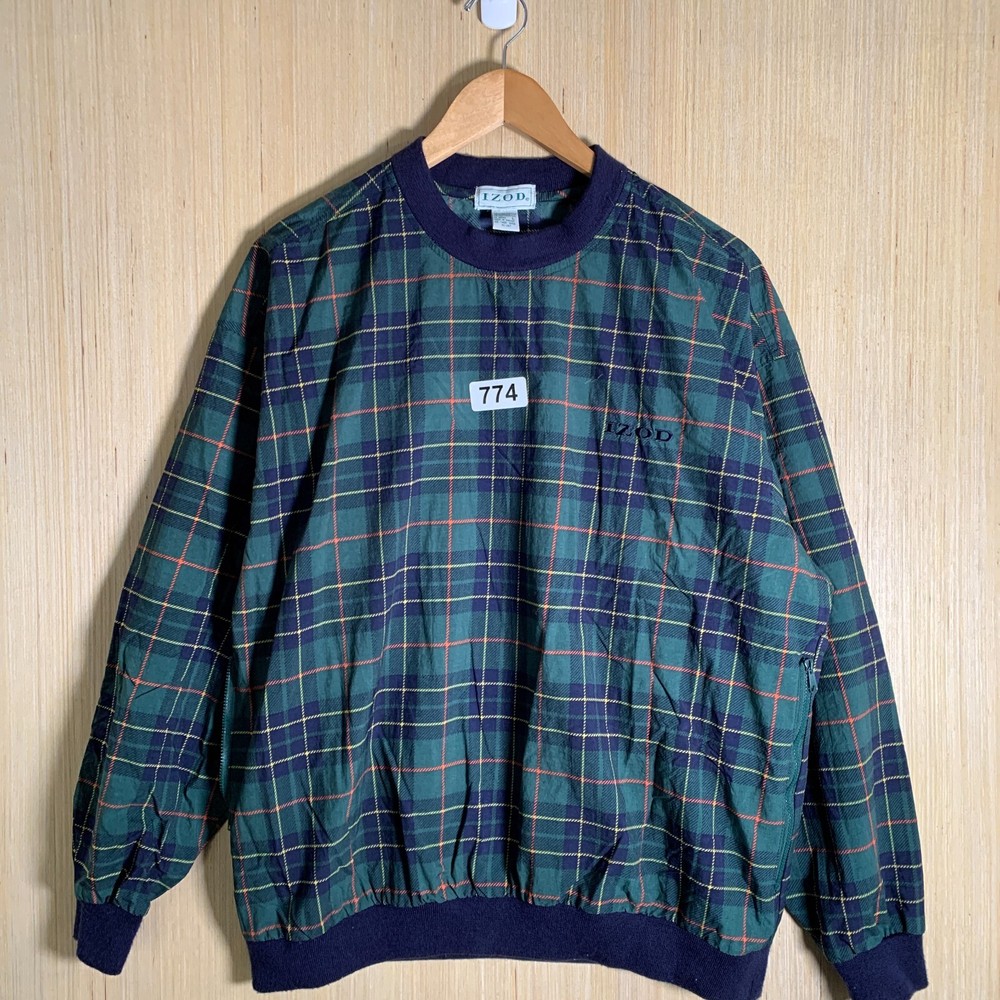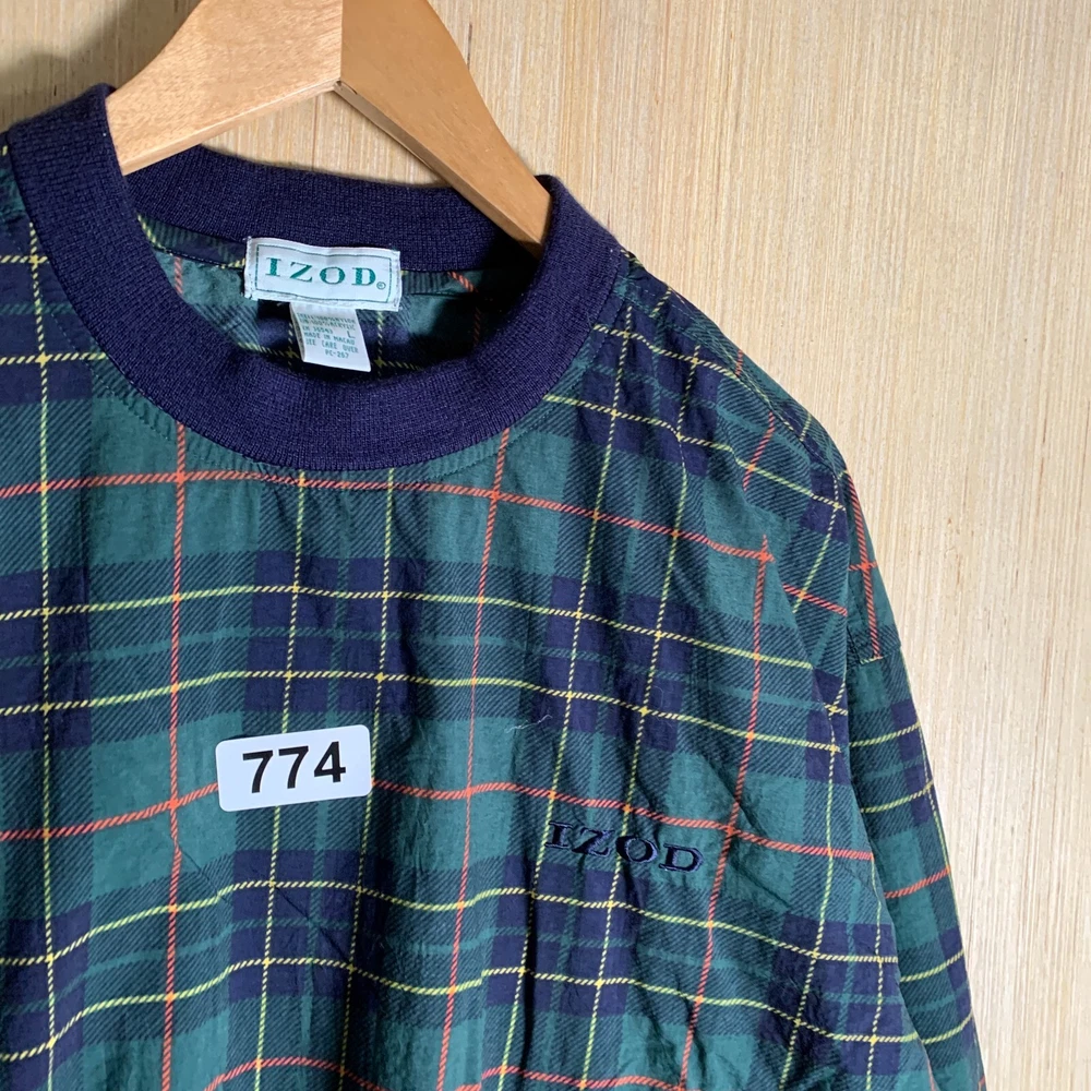 The Vintage Izod Wind Breaker is a green long-sleeved men's pullover jacket made of polyester with a nylon lining. It features a solid pattern, zip, button, and snap closure, and embroidered accents with the Izod logo. The windbreaker has a vintage 90s hip-hop theme and is suitable for all seasons. It is available in size L and has a regular fit. The jacket is easy to care for and preshrunk.