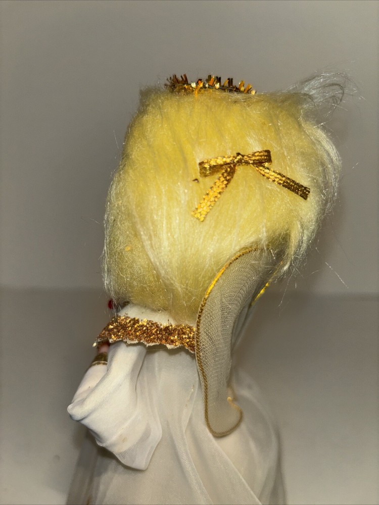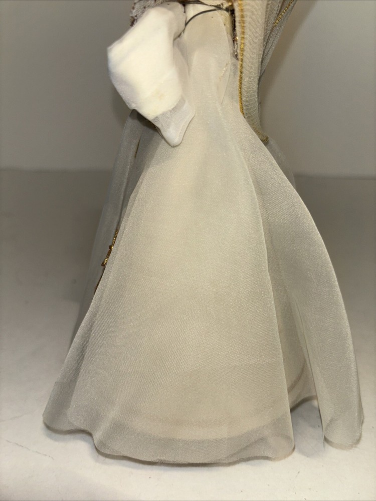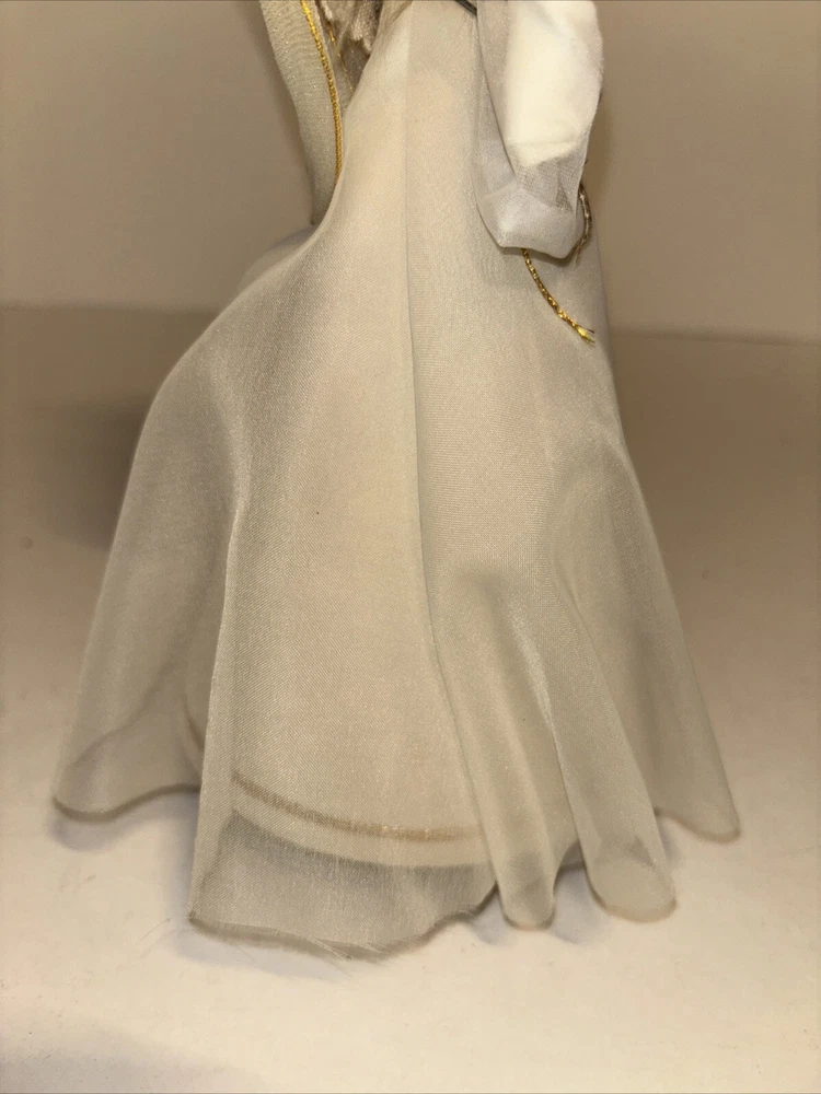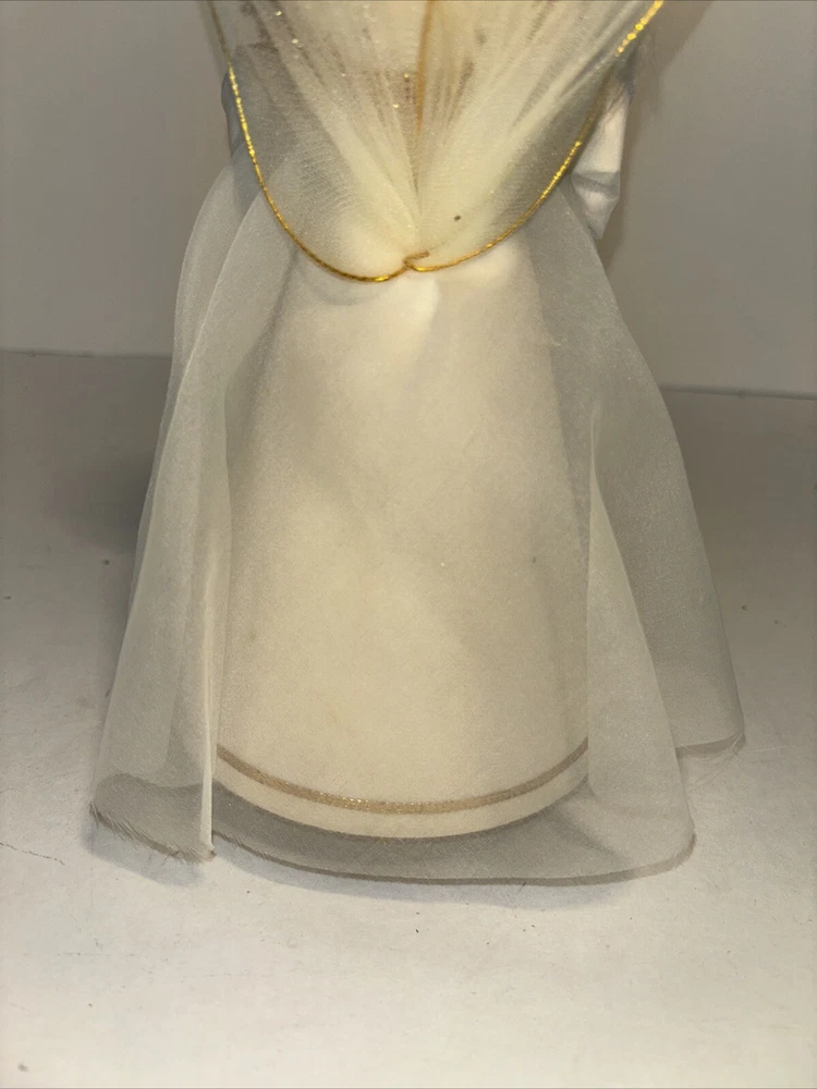 Item is in great used condition. It does revolve and play “Silent Night”. There are spots under the fabric layer of her dress. Please see pics for complete details....