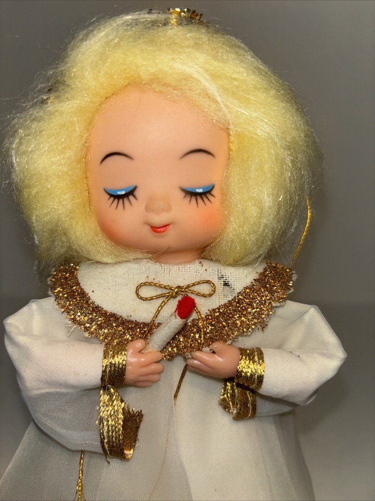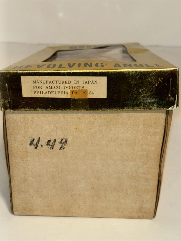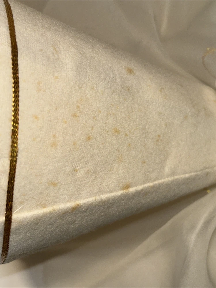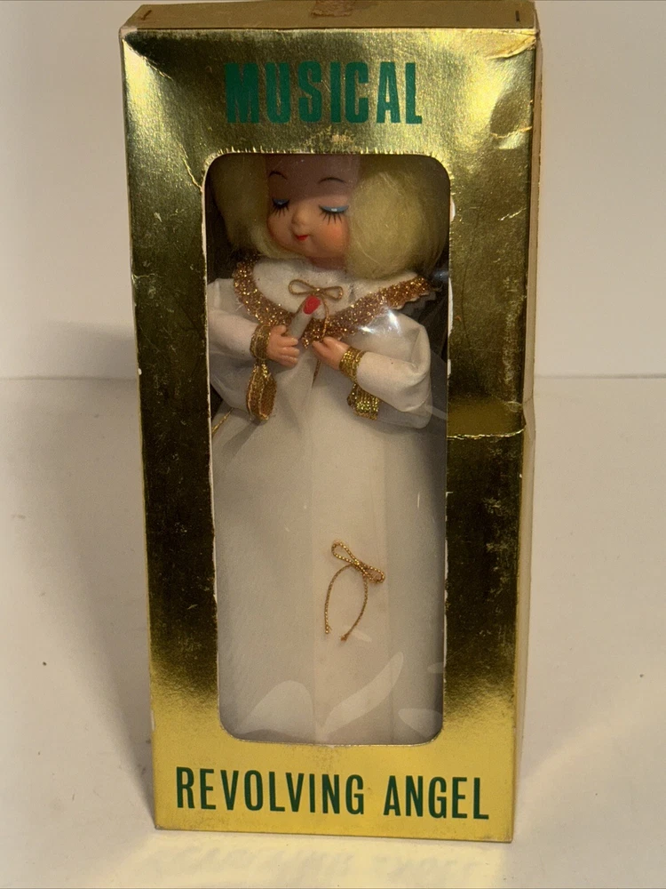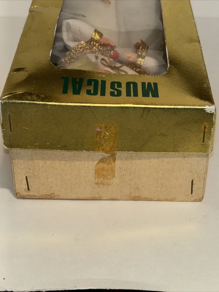 Item is in great used condition. It does revolve and play “Silent Night”. There are spots under the fabric layer of her dress. Please see pics for complete details.