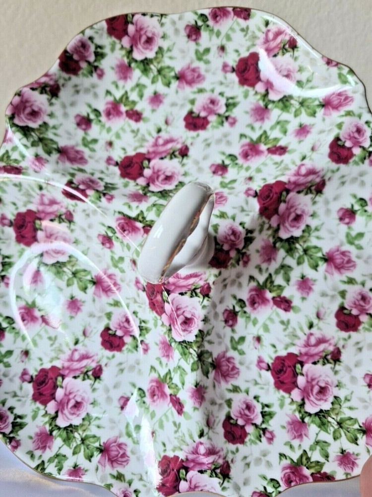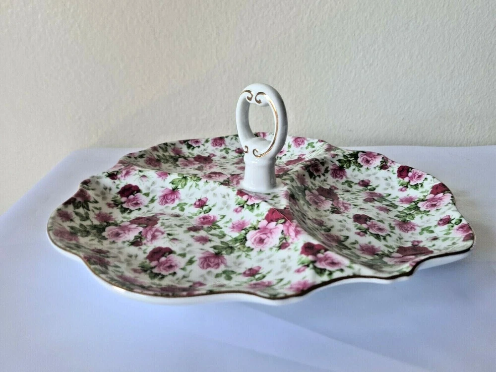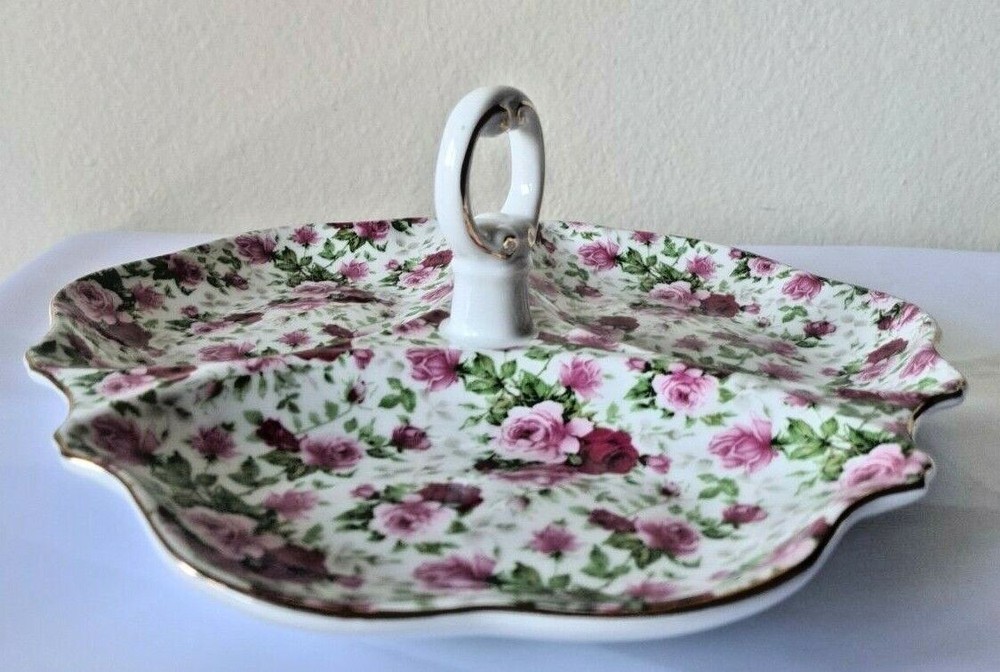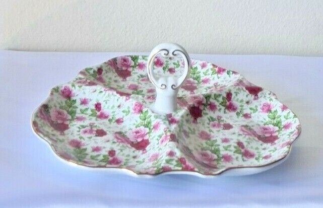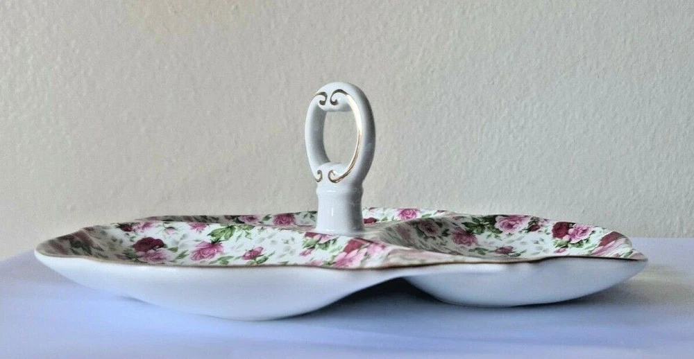 Welcome to One of A Kind Treasures! Up for sale is a Vintage Heavy Rose Divided Dish Tidbit Tray with Handle & Pink Gold Rose Design In great solid condition, no cracks chips or scratches. Approximately 10.25" x 9.75" x 3.5". P lease see all photos and description, selling as is, as shown in photos and as described. We ask for 3-day handling time but will do our best to get your order out by the following day. Shipping is Monday to Friday with shipping options available, just send a message before purchasing. If you are not satisfied with your item, we do accept returns within 30 days on unaltered items. Please message us if you have any questions or if additional pictures are needed and please feel free to see what other treasures we have in our store. Thanks for looking!