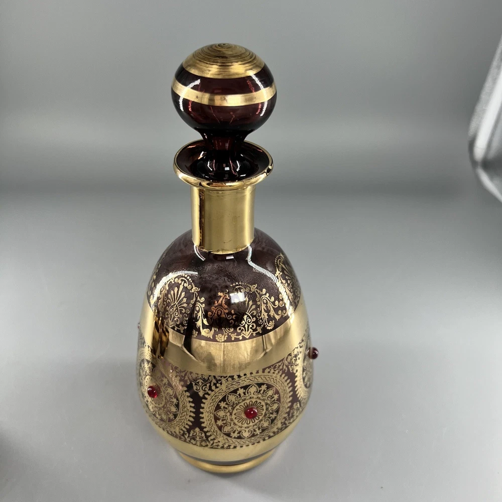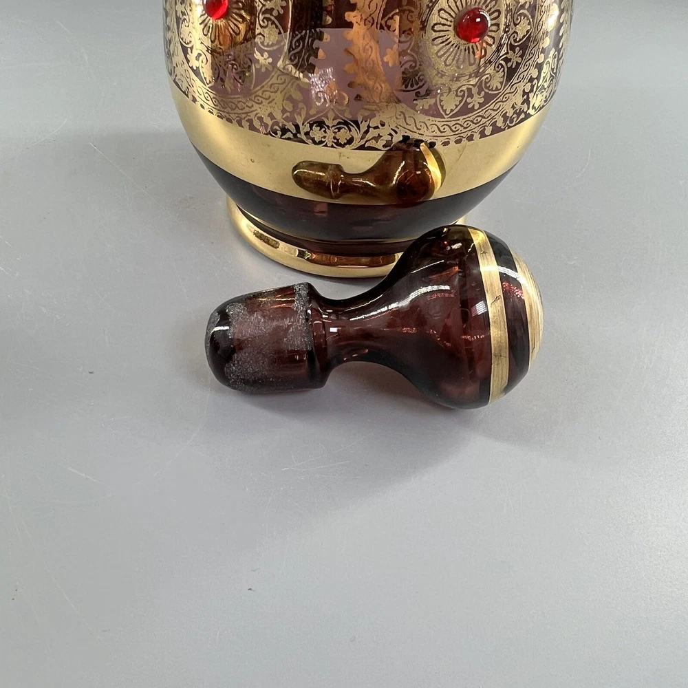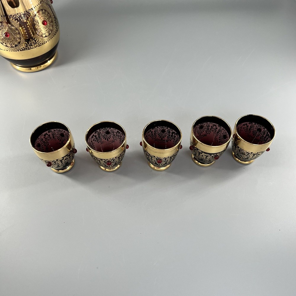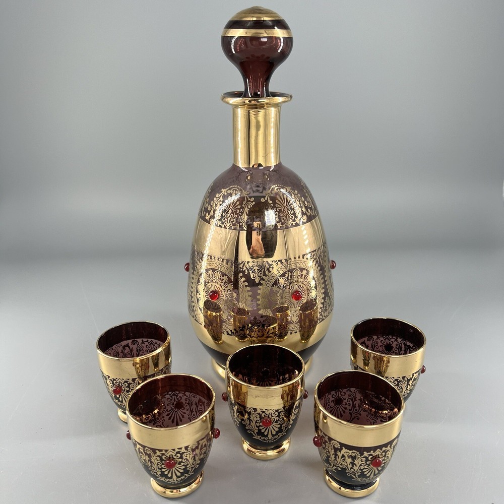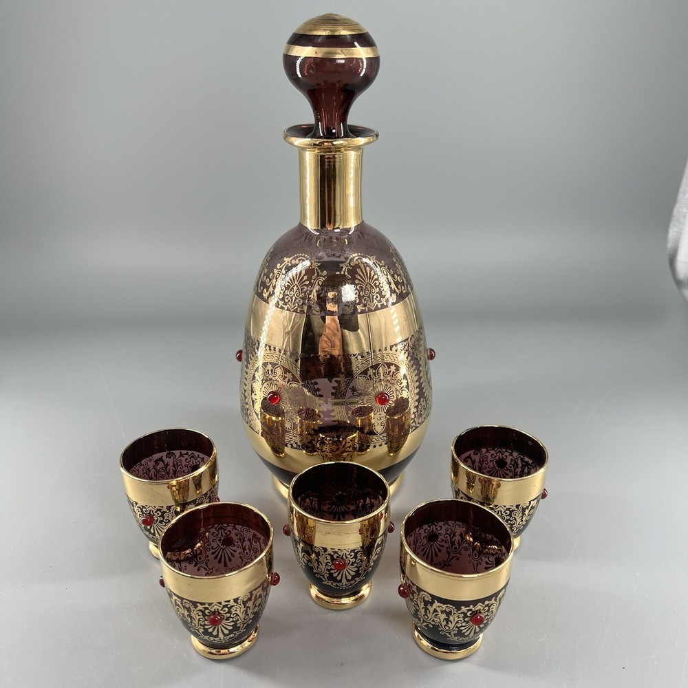 Vintage MCM Amethyst Glass Decanter w Shot Glasses Gold Trim Barware Italy JI Co. π₯πΎπ₯πΎπ₯πΎπ₯πΎπ₯πΎπ₯πΎπ₯πΎπ₯πΎπ₯πΎπ₯ β’Vintage JI Co. Amethyst Glass Decanter & Glasses β’ Handmade in Italy β’ Beautiful Gold Gilt and Applied Ruby Glass Stones β’ Includes Decanter, Stopper, 5 Shot Glasses Measurements Approximate Decanter β’ 2-1/2β Diameter Base β’ 1-1/2β Diameter Top β’ 7-1/4β Tall β’ 9β Tall With Stopper Shot Glasses β’ 1β Diameter Base β’ 1-1/2β Diameter Top β’ 2β Tall β’ Preowned Condition - Good β’ This beautiful Barware set is in good preowned vintage condition with normal signs of previous use, including some scuffs, scratches and slight debris consistent with age. There is some slight scratching and wear to the gold. See photos for the most accurate description of this item. π₯πΎπ₯πΎπ₯πΎπ₯πΎπ₯πΎπ₯πΎπ₯πΎπ₯πΎπ₯πΎπ₯ Please view all photos carefully and feel free to ask any questions prior to purchasing. Colors may vary slightly depending on lighting and screen resolution. I am happy to combine shipping whenever possible. Please message me for details. Reasonable offers are always welcome and appreciated! Thank you for your consideration, and have a blessed day!!