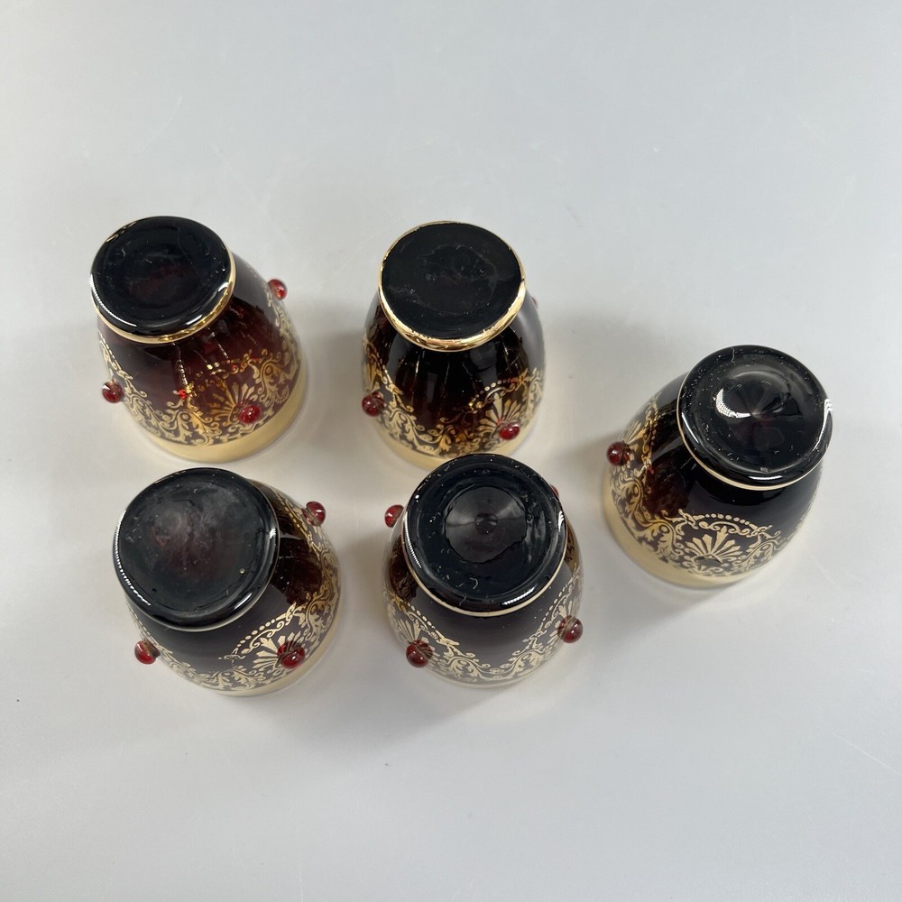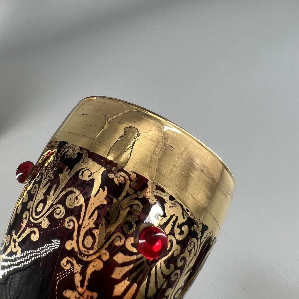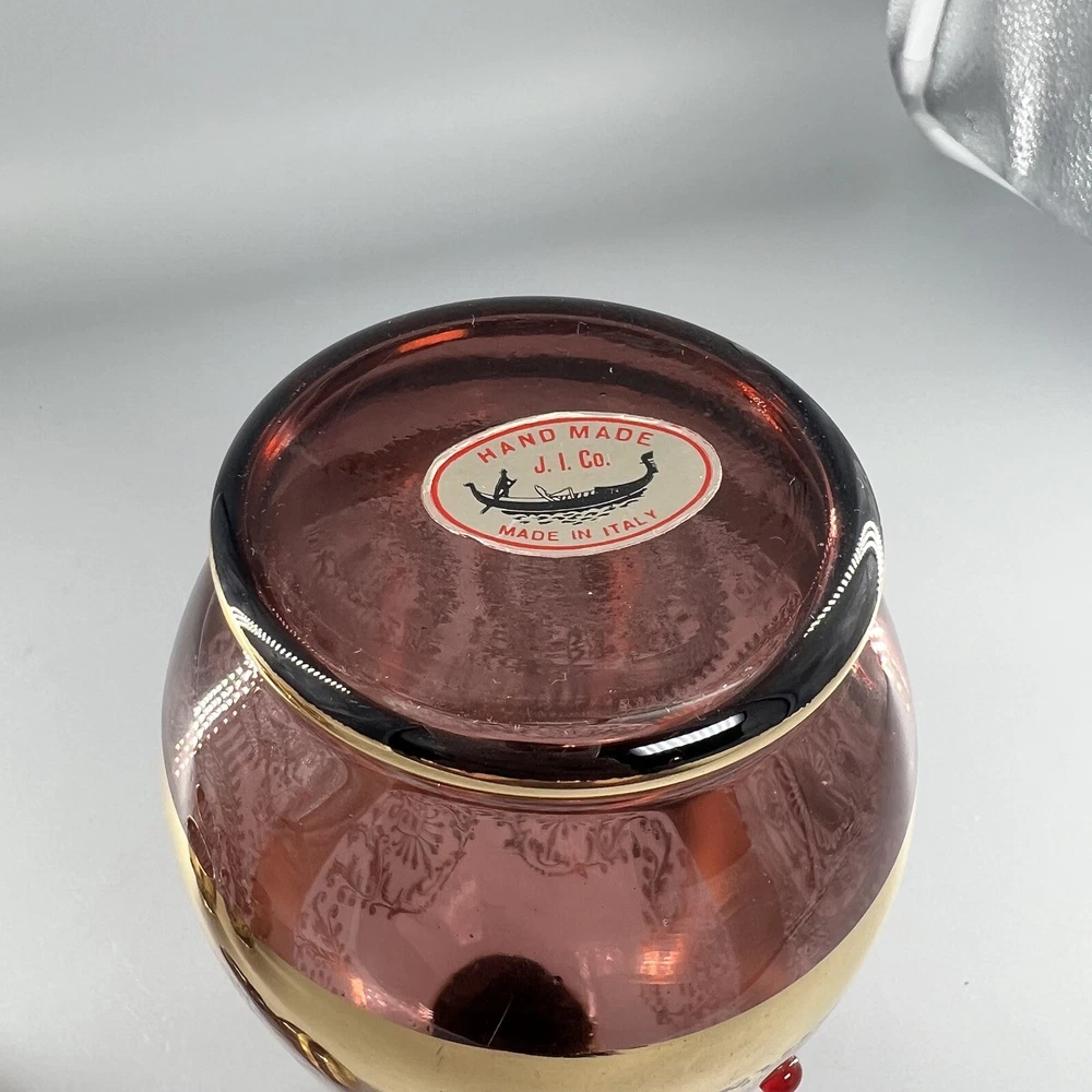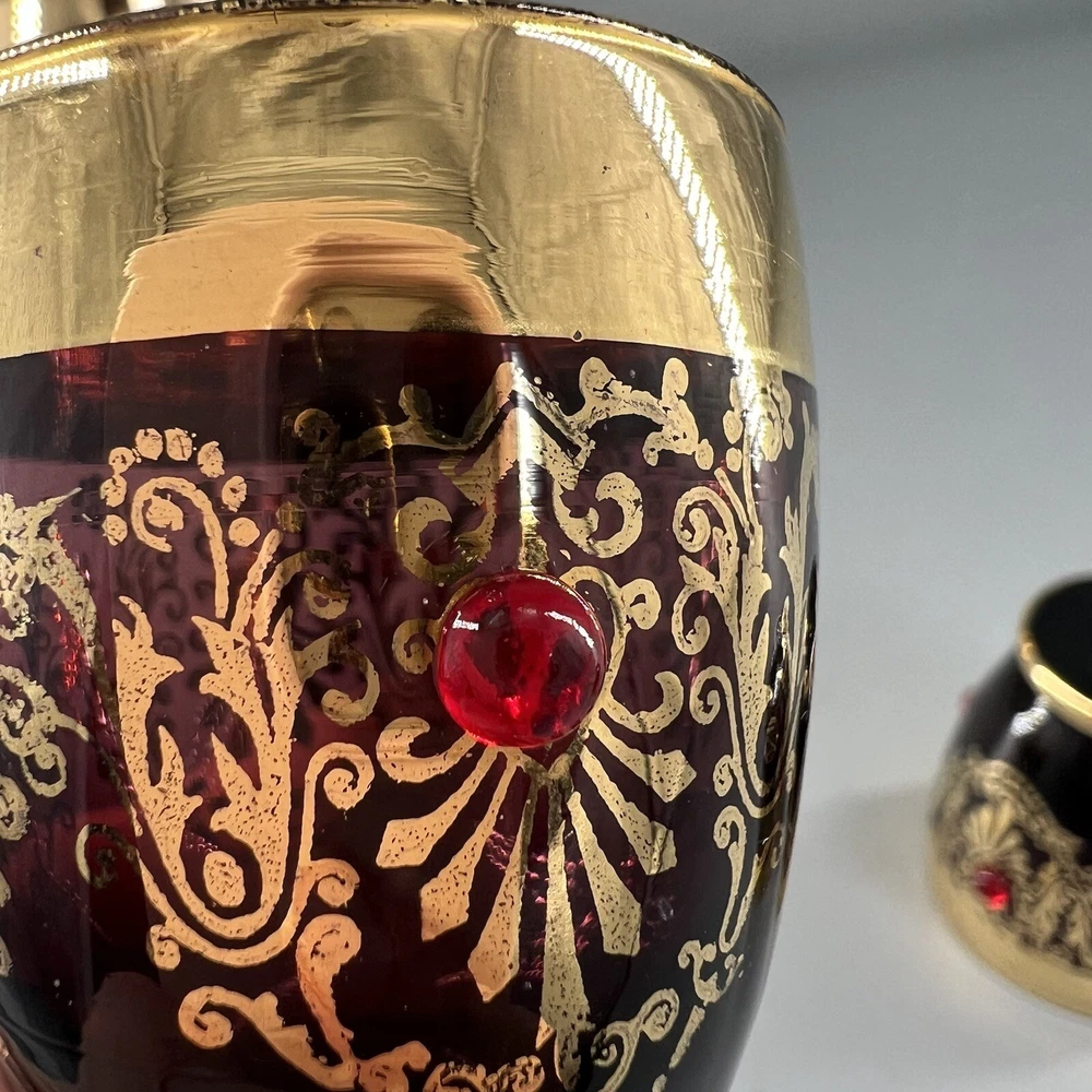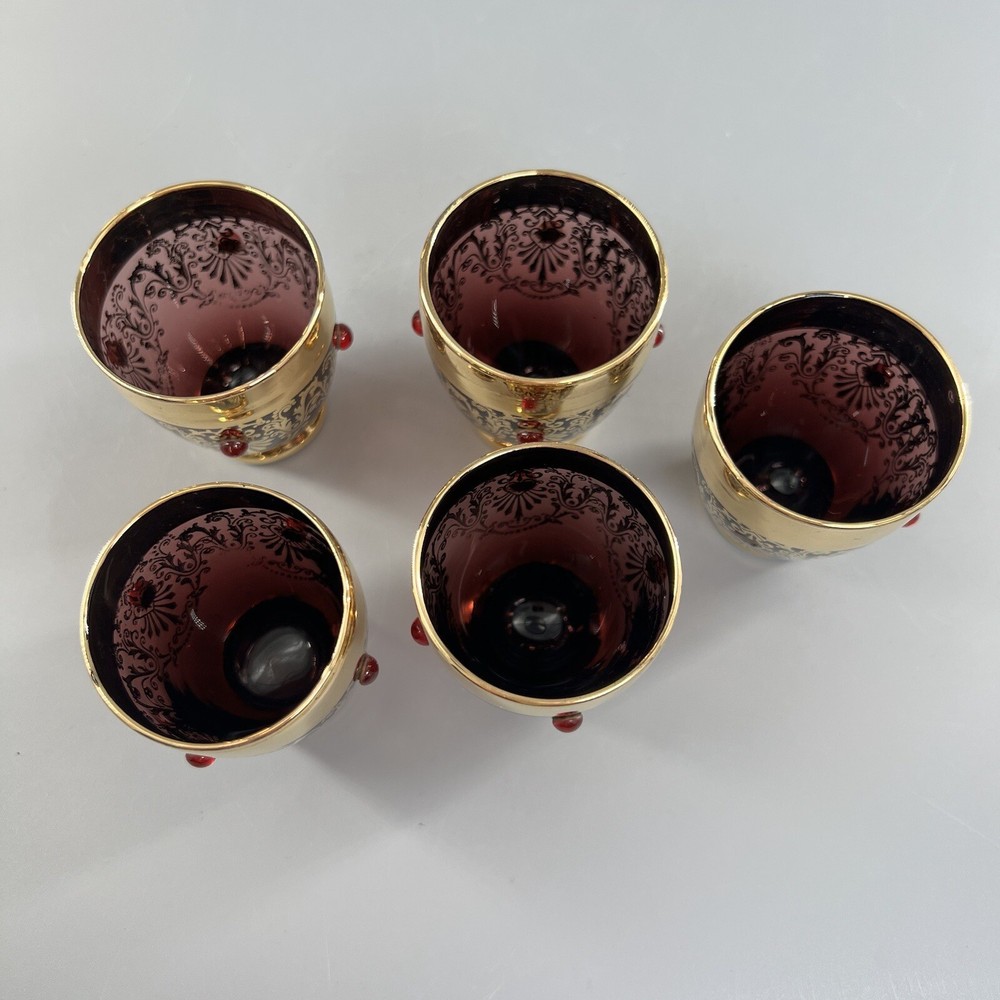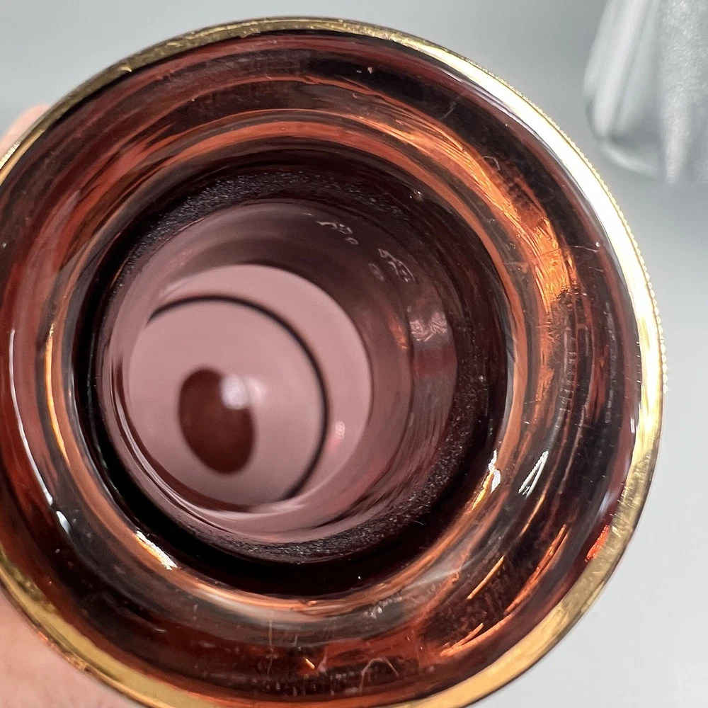 Vintage MCM Amethyst Glass Decanter w Shot Glasses Gold Trim Barware Italy JI Co. π₯πΎπ₯πΎπ₯πΎπ₯πΎπ₯πΎπ₯πΎπ₯πΎπ₯πΎπ₯πΎπ₯ β’Vintage JI Co. Amethyst Glass Decanter & Glasses β’ Handmade in Italy β’ Beautiful Gold Gilt and Applied Ruby Glass Stones β’ Includes Decanter, Stopper, 5 Shot Glasses Measurements Approximate Decanter β’ 2-1/2β Diameter Base β’ 1-1/2β Diameter Top β’ 7-1/4β Tall β’ 9β Tall With Stopper Shot Glasses β’ 1β Diameter Base β’ 1-1/2β Diameter Top β’ 2β Tall β’ Preowned Condition - Good β’ This beautiful Barware set is in good preowned vintage condition with normal signs of previous use, including some scuffs, scratches and slight debris consistent with age. There is some slight scratching and wear to the gold. See photos for the most accurate description of this item. π₯πΎπ₯πΎπ₯πΎπ₯πΎπ₯πΎπ₯πΎπ₯πΎπ₯πΎπ₯πΎπ₯ Please view all photos carefully and feel free to ask any questions prior to purchasing. Colors may vary slightly depending on lighting and screen resolution. I am happy to combine shipping whenever possible. Please message me for details. Reasonable offers are always welcome and appreciated! Thank you for your consideration, and have a blessed day!!