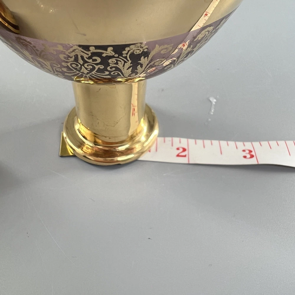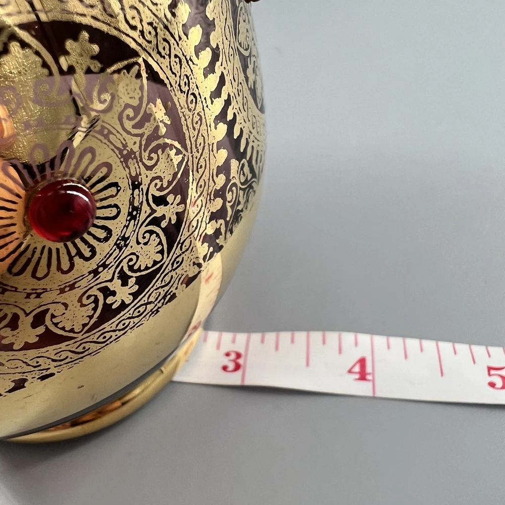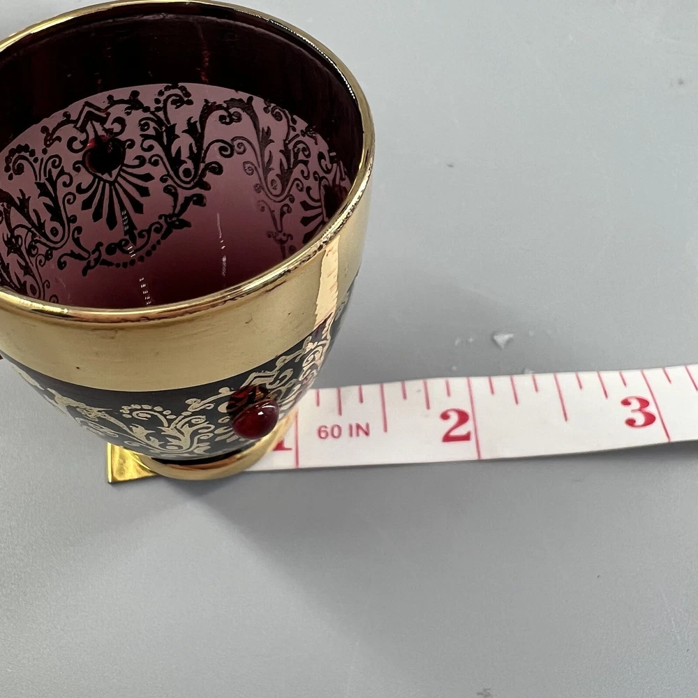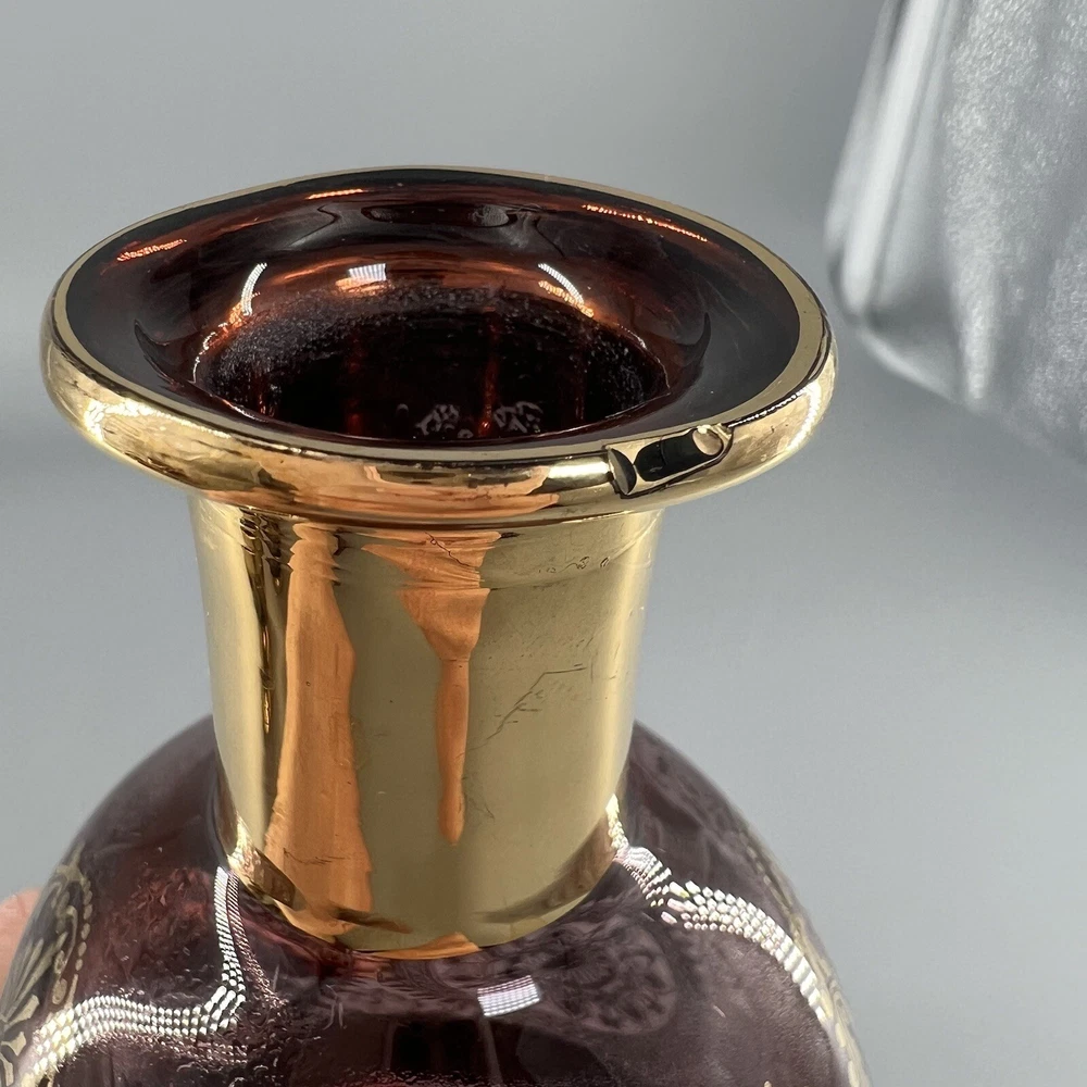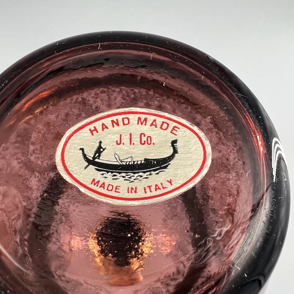 Vintage MCM Amethyst Glass Decanter w Shot Glasses Gold Trim Barware Italy JI Co. π₯πΎπ₯πΎπ₯πΎπ₯πΎπ₯πΎπ₯πΎπ₯πΎπ₯πΎπ₯πΎπ₯ β’Vintage JI Co. Amethyst Glass Decanter & Glasses β’ Handmade in Italy β’ Beautiful Gold Gilt and Applied Ruby Glass Stones β’ Includes Decanter, Stopper, 5 Shot Glasses Measurements Approximate Decanter β’ 2-1/2β Diameter Base β’ 1-1/2β Diameter Top β’ 7-1/4β Tall β’ 9β Tall With Stopper Shot Glasses β’ 1β Diameter Base β’ 1-1/2β Diameter Top β’ 2β Tall β’ Preowned Condition - Good β’ This beautiful Barware set is in good preowned vintage condition with normal signs of previous use, including some scuffs, scratches and slight debris consistent with age. There is some slight scratching and wear to the gold. See photos for the most accurate description of this item. π₯πΎπ₯πΎπ₯πΎπ₯πΎπ₯πΎπ₯πΎπ₯πΎπ₯πΎπ₯πΎπ₯ Please view all photos carefully and feel free to ask any questions prior to purchasing. Colors may vary slightly depending on lighting and screen resolution. I am happy to combine shipping whenever possible. Please message me for details. Reasonable offers are always welcome and appreciated! Thank you for your consideration, and have a blessed day!!