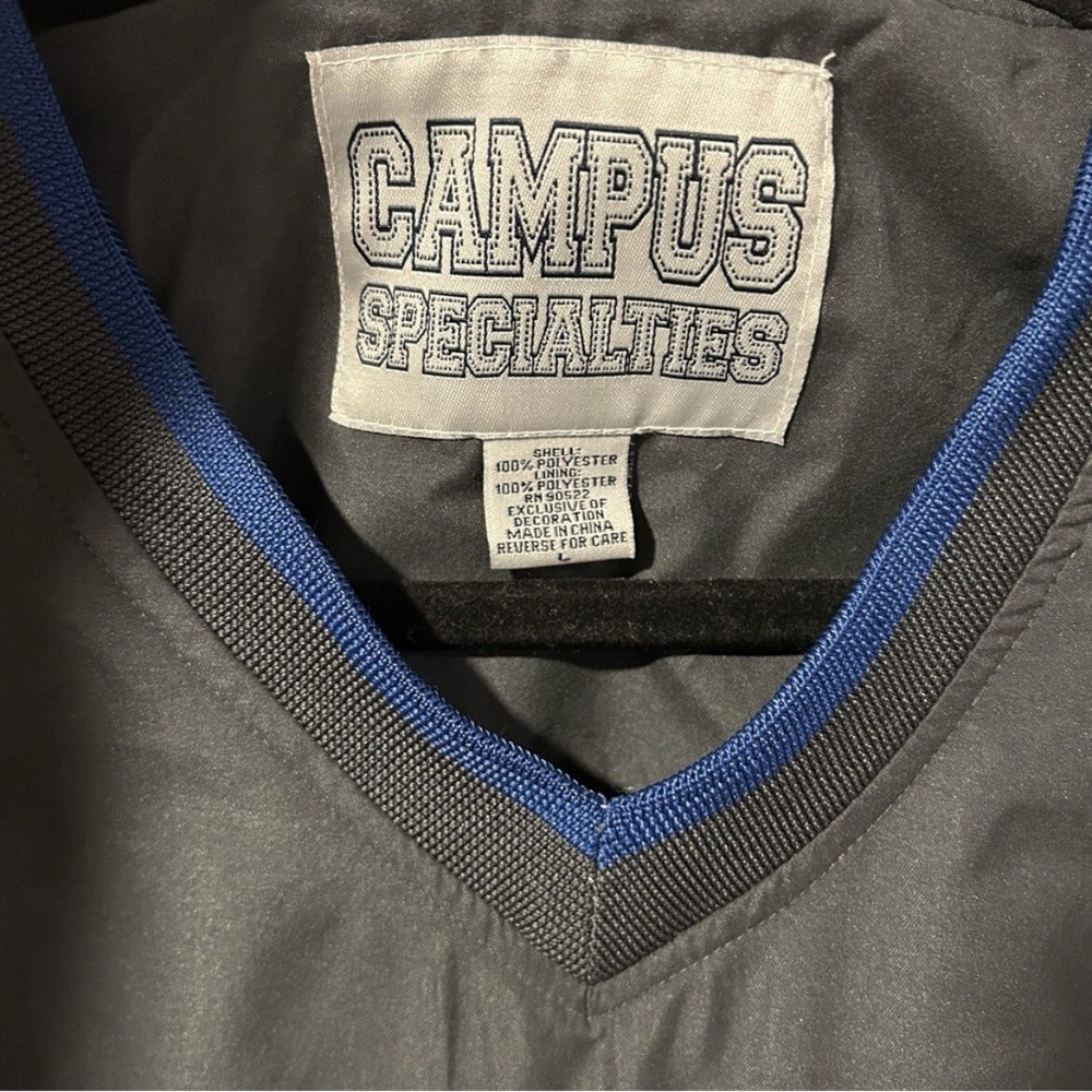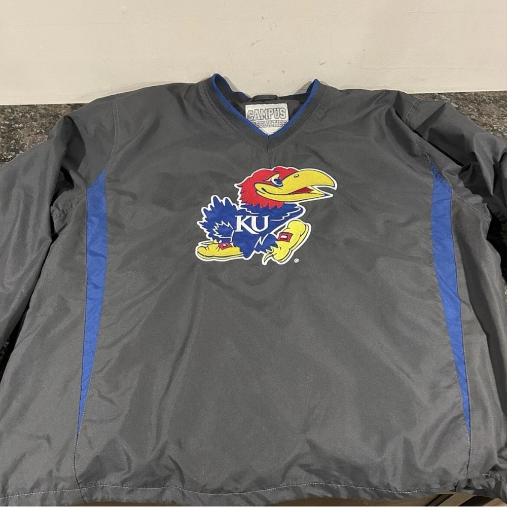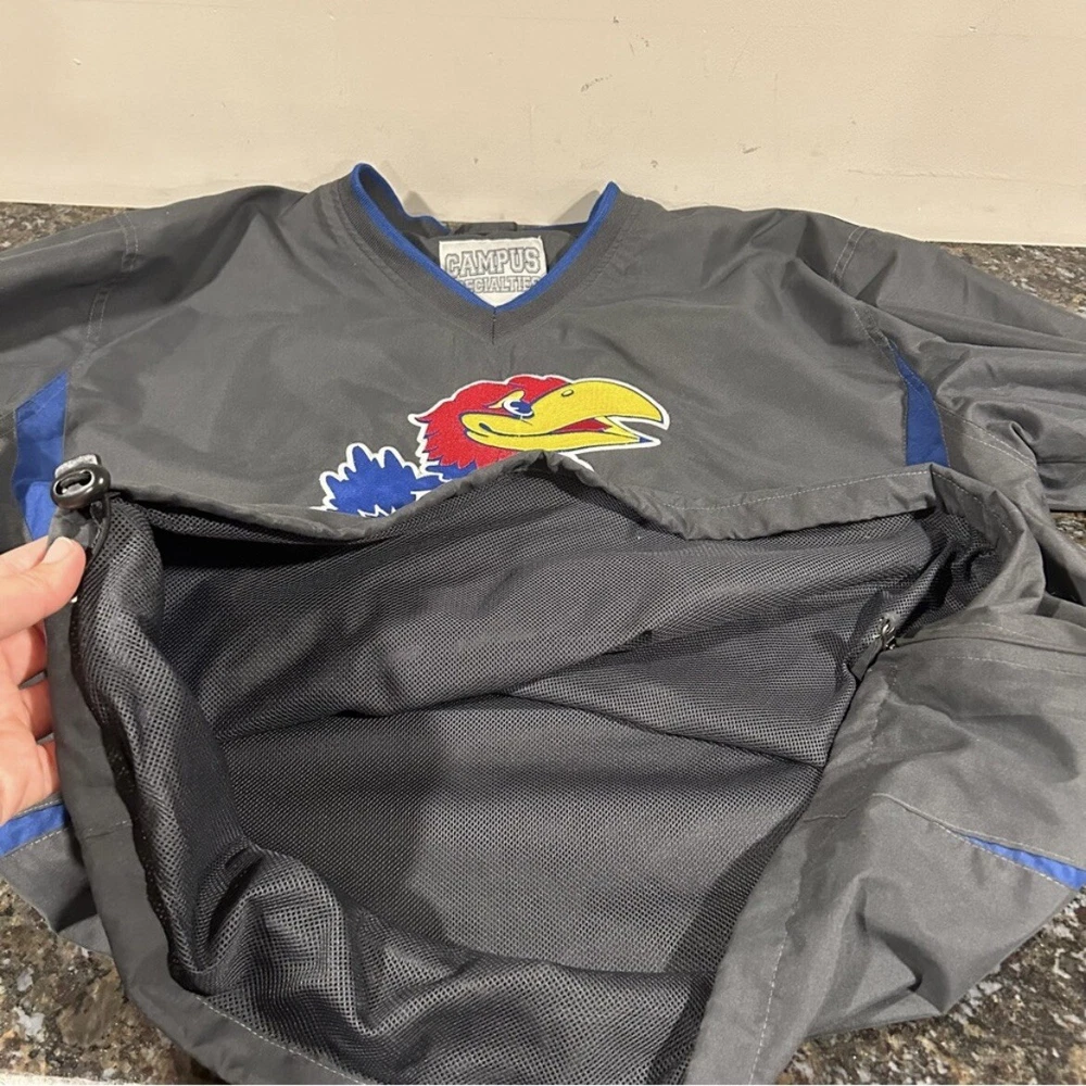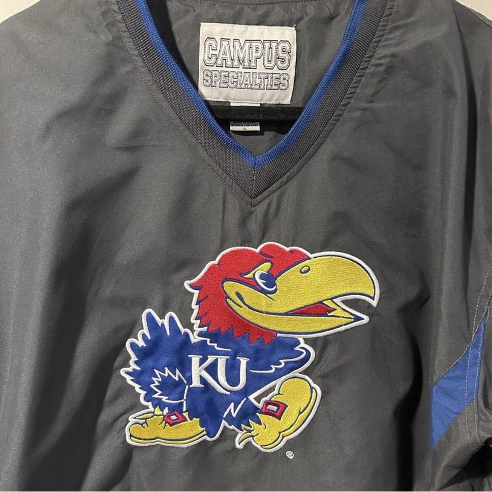 Vintage KU Kansas Jayhawks Pullover Wind Jacket Campus Specialities Mens Large This is a really great vintage pullover. It has a nice quality embroidered jacket. No rips stains or tears in good used vintage condition. Super awesome vintage KU wear!