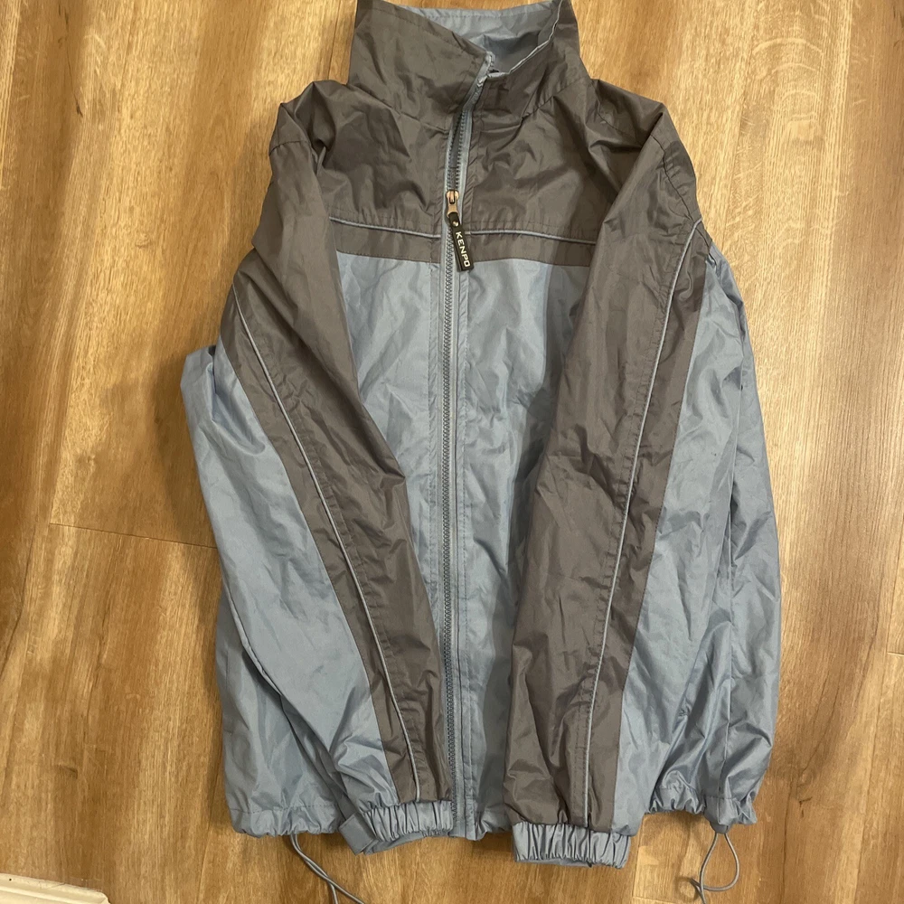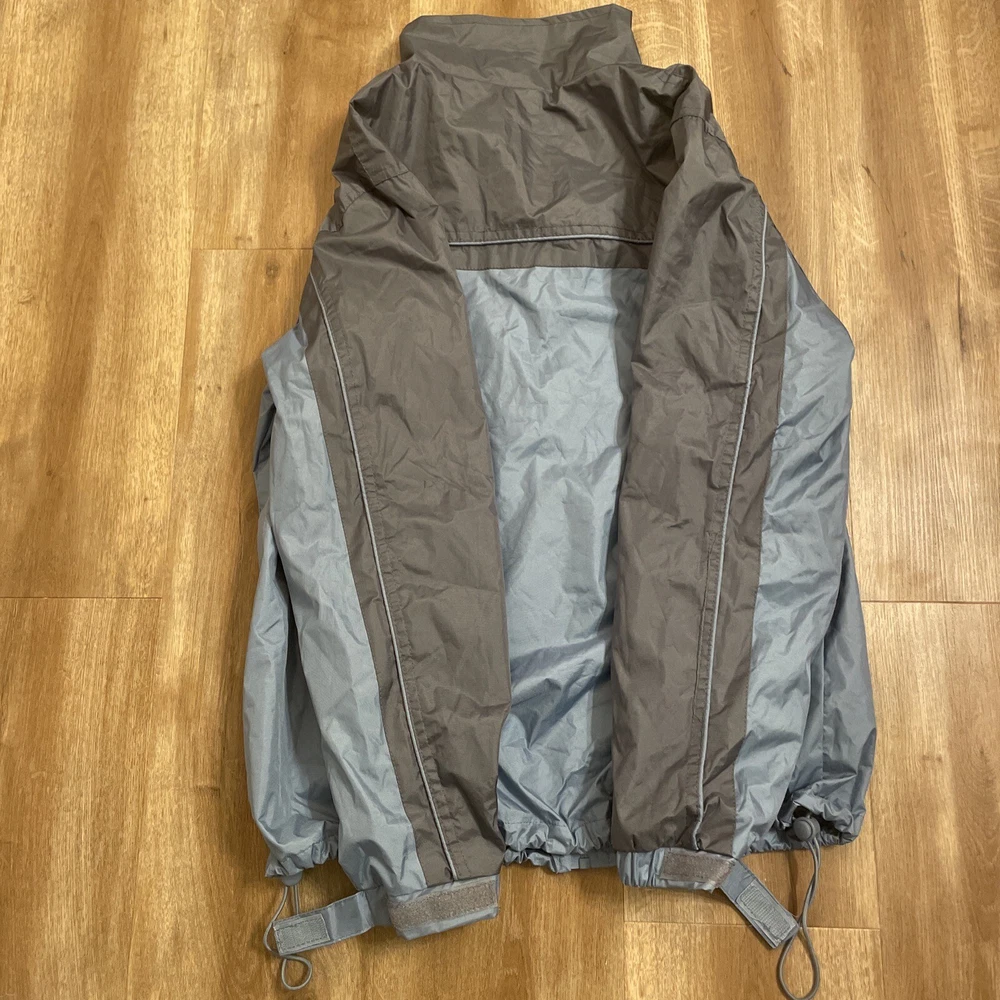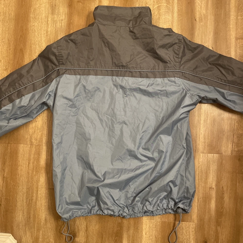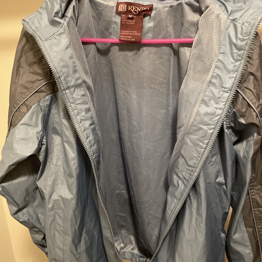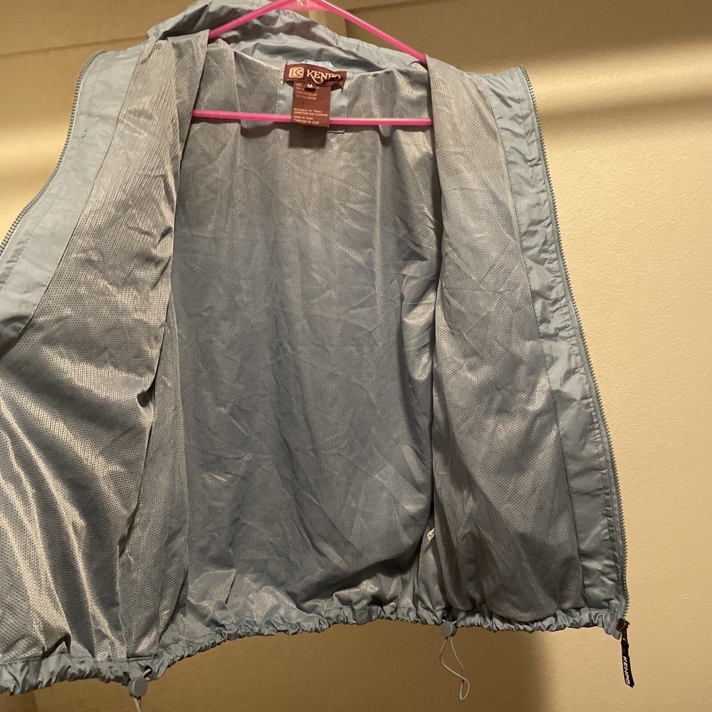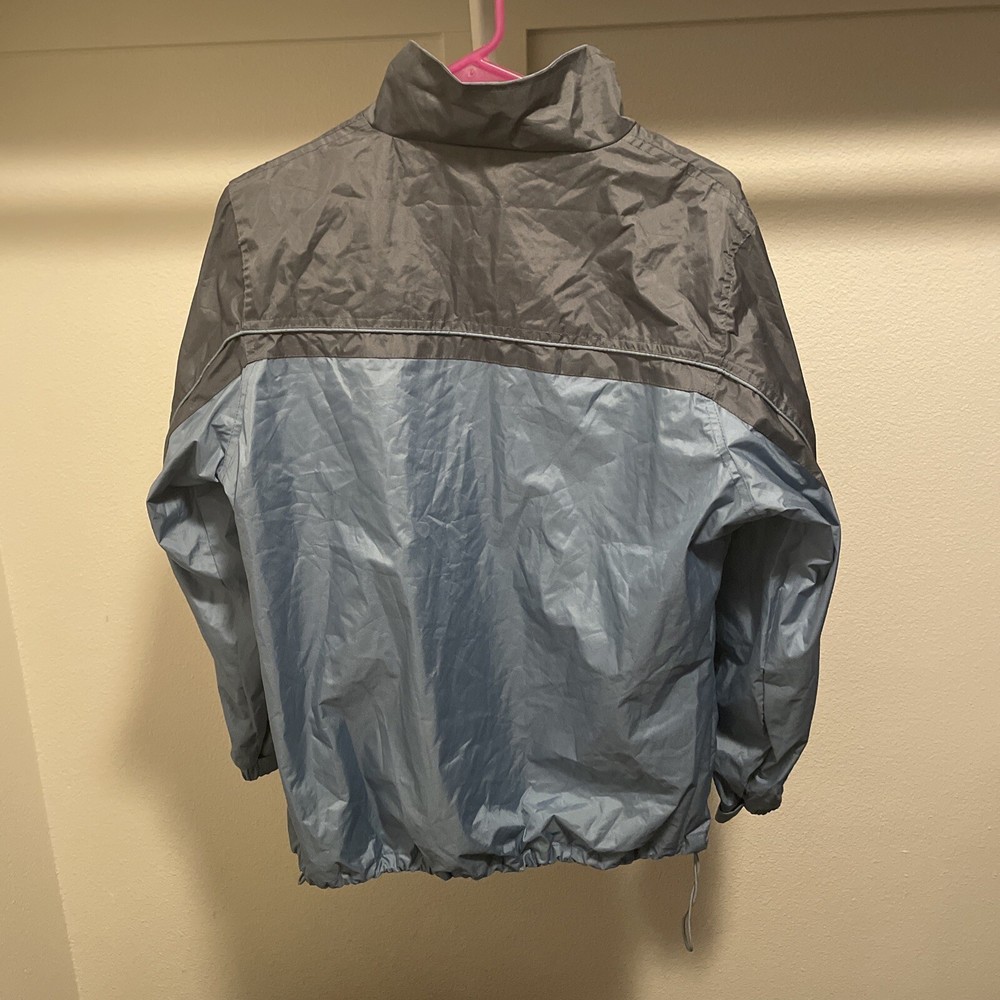The jacket is made of 100% polyester taffeta fabric that is lightweight, breathable, and water and wind-resistant, making it perfect for all seasons. It features a full zip closure, elastic waist, and an adjustable hood to protect from the elements. Jacket is pre owned. Smoke free and has minimal wear. Look at pictures for additional details.