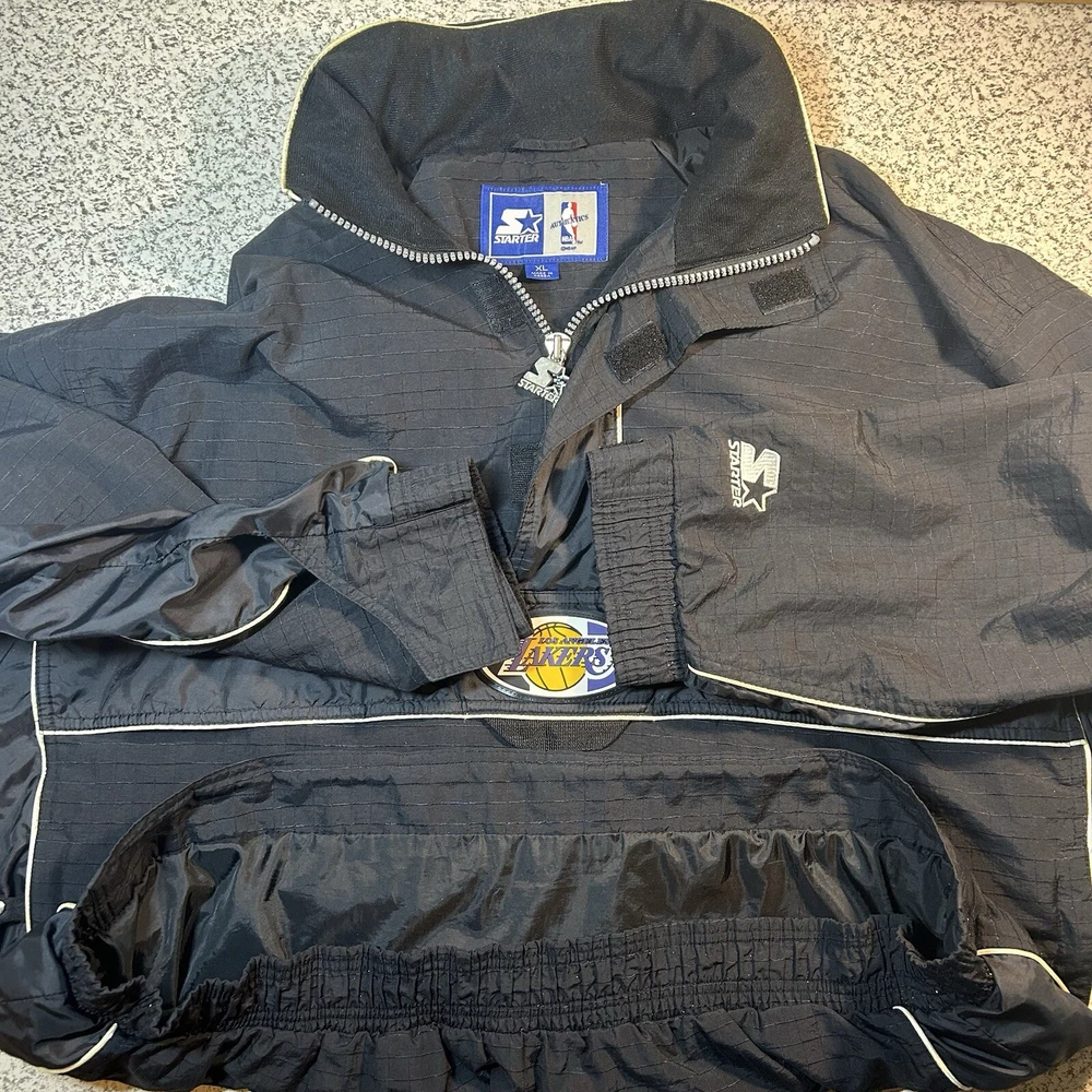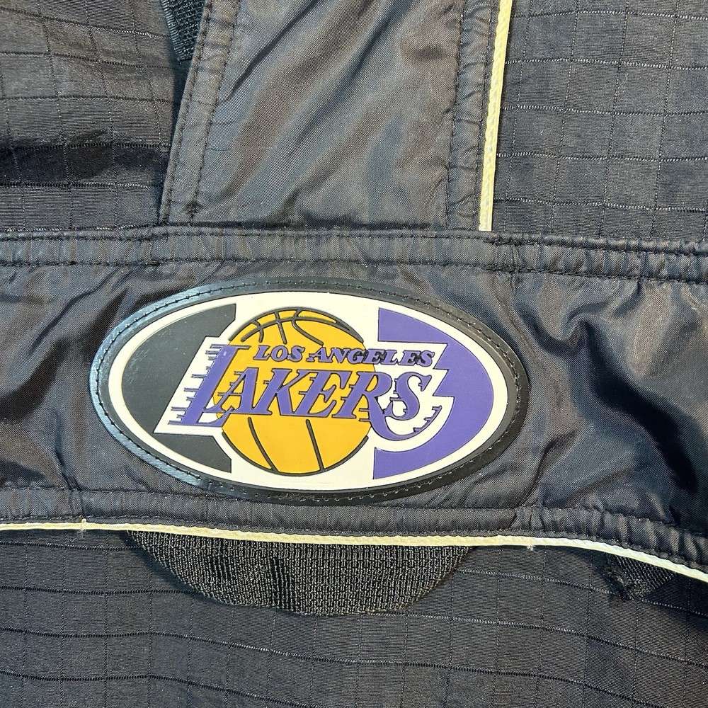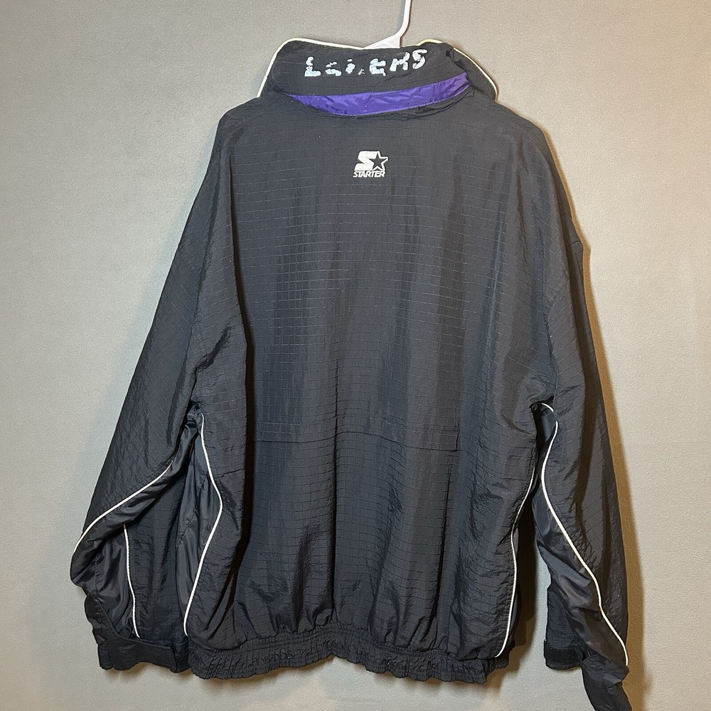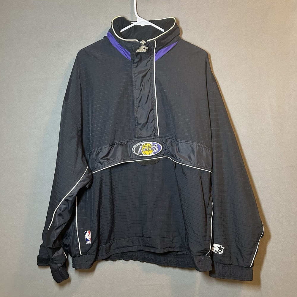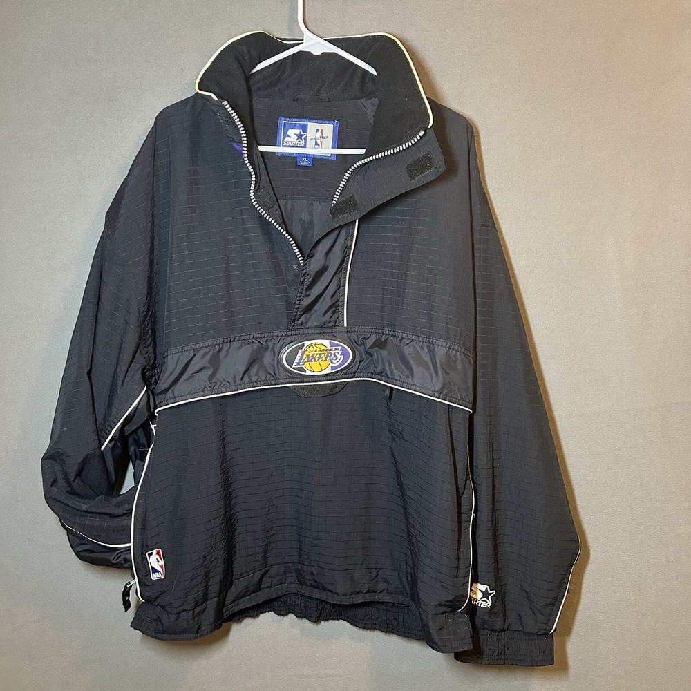 Show your support for the Los Angeles Lakers with this officially licensed L.A. Lakers 1/4 Zip Wind Breaker Jacket by Starter. This unisex adult jacket is perfect for basketball fans and is made with high-quality materials. The jacket features a hidden hood and is designed to keep you warm and comfortable during regular season games. The black windbreaker jacket is size XL and is perfect for fans of all ages. It is made in Korea, Republic of and is a must-have for any L.A. Lakers fan. Whether you're cheering on your team at the game or just showing off your team spirit, this jacket is the perfect addition to your collection. Overall Very Good Condition - Damaged Logo (back Hood area) Wear/Damage hood lining - See Photos - We ship quickly - PLEASE NOTE - Vintage and prewashed Clothing Often runs SMALLER than Modern sizes... Please reference photos for accurate measurements/sizing - Contact us for any issues or questions