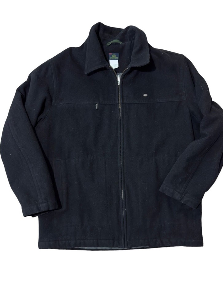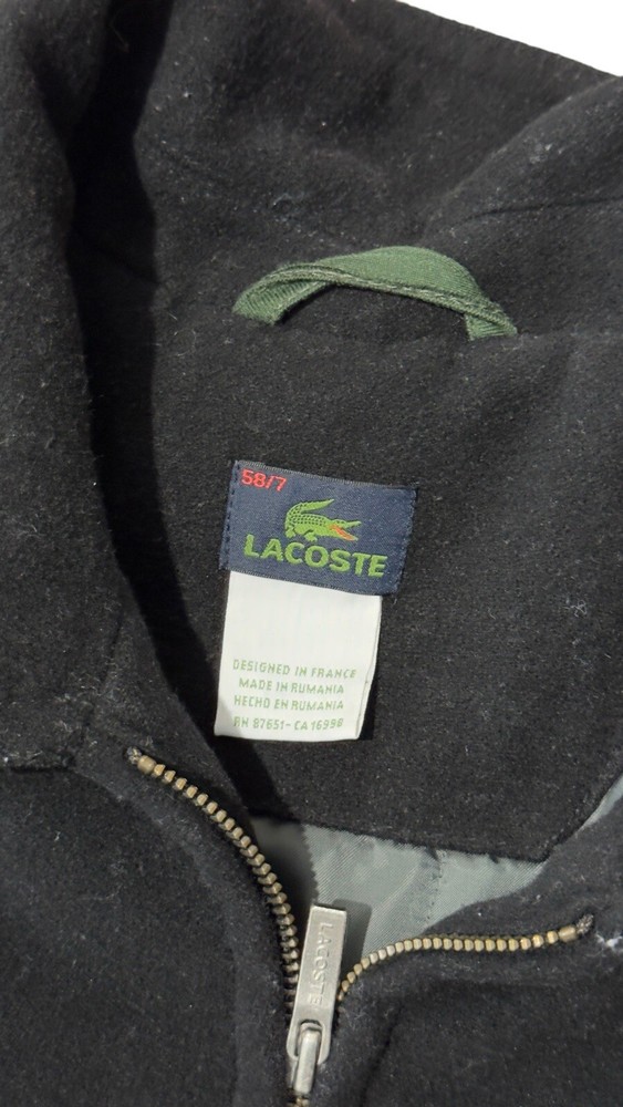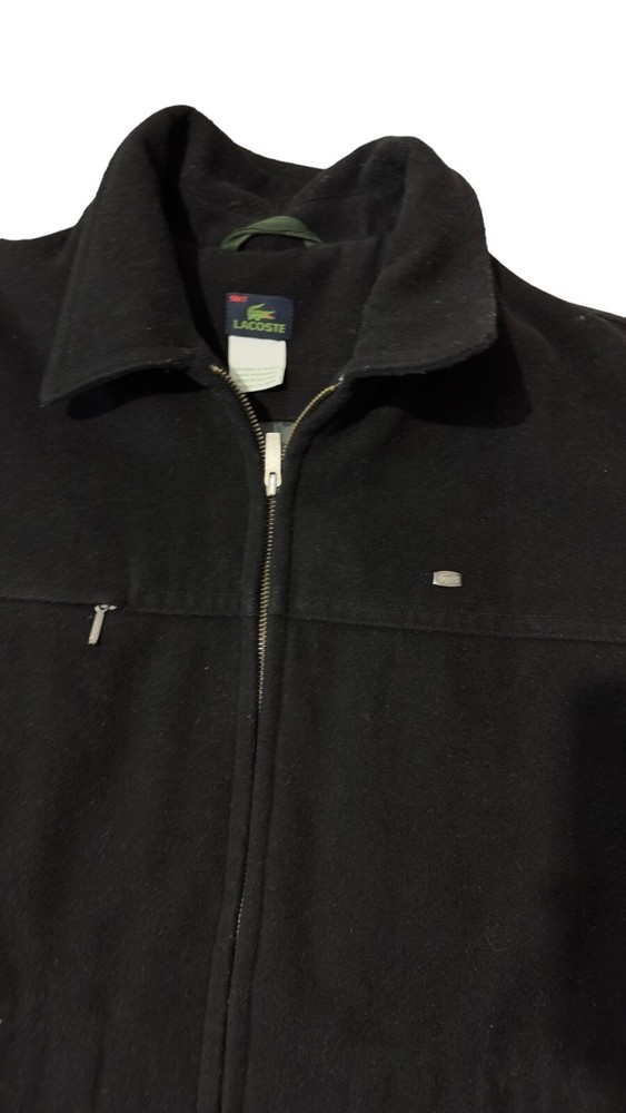 Elevate your style with this vintage Lacoste wool jacket. The black outer shell material is accented with a full zip closure and the iconic Lacoste logo. This mid-length jacket is perfect for both casual and formal occasions, with a collar style that adds a touch of sophistication. The jacket is lined with polyester and insulated with polyester, making it lightweight and wind-resistant. The jacket is machine washable and suitable for all seasons. The jacket is a size XL and fits regular size types. It comes in a hipster, designer, classic, 90s, and retro theme.